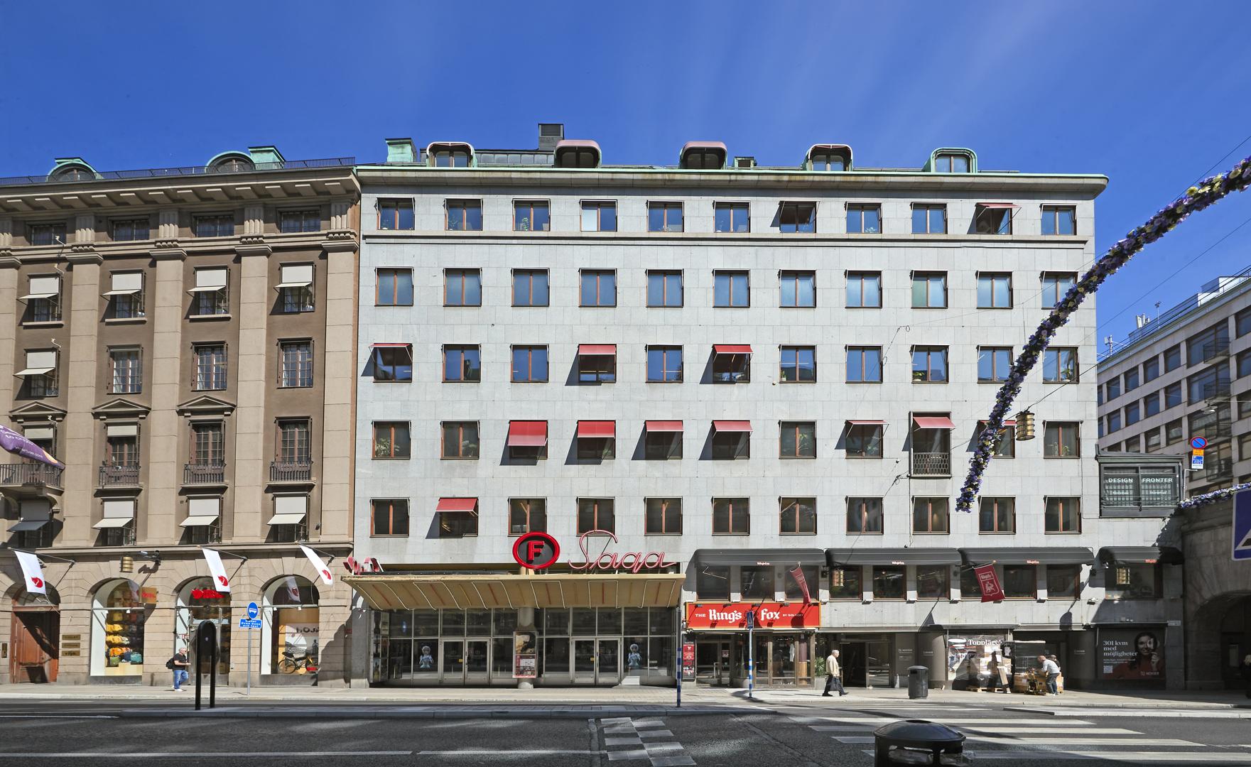 Uppfördes 1936-38 efter ritningar av arkitekt Helge B Widlund. Här öppnades 1937 Europa Films premiärbiograf, SAGA som även hade sitt huvudkontor här.
