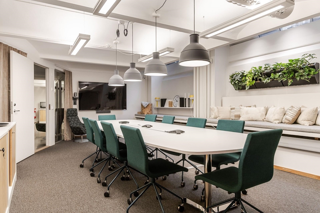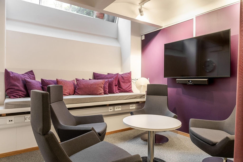 En interntrappa samt hiss finns till nedre våningsplan. Där finns mötesrum, strort trevligt pentry med bord som erbjuder lounghäng eller spontana internmöten.