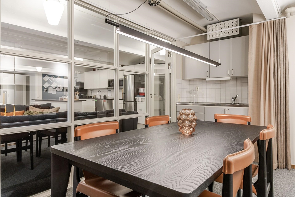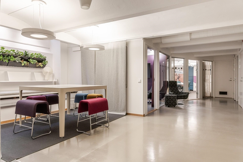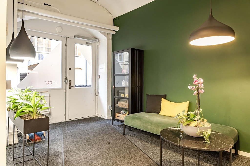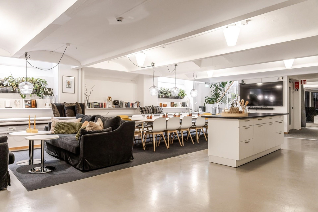 Lokalen med direktingång från gården erbjuder ett öppet landskap med välvda fönster. Den gamla industri utfromningen av förnster och tak finns kvar där man har varsamt instalerat dagens krav på ventilation och belsyning.