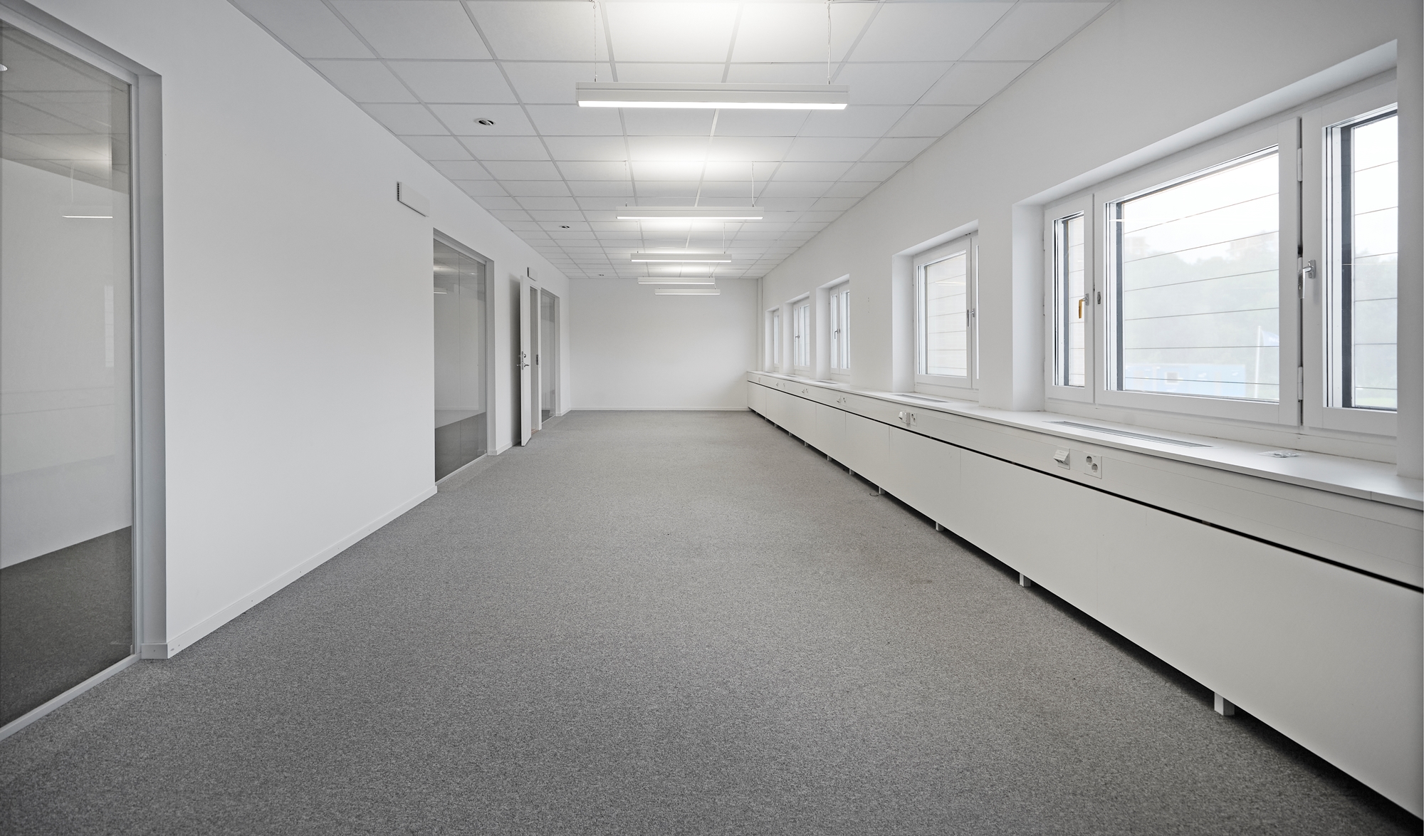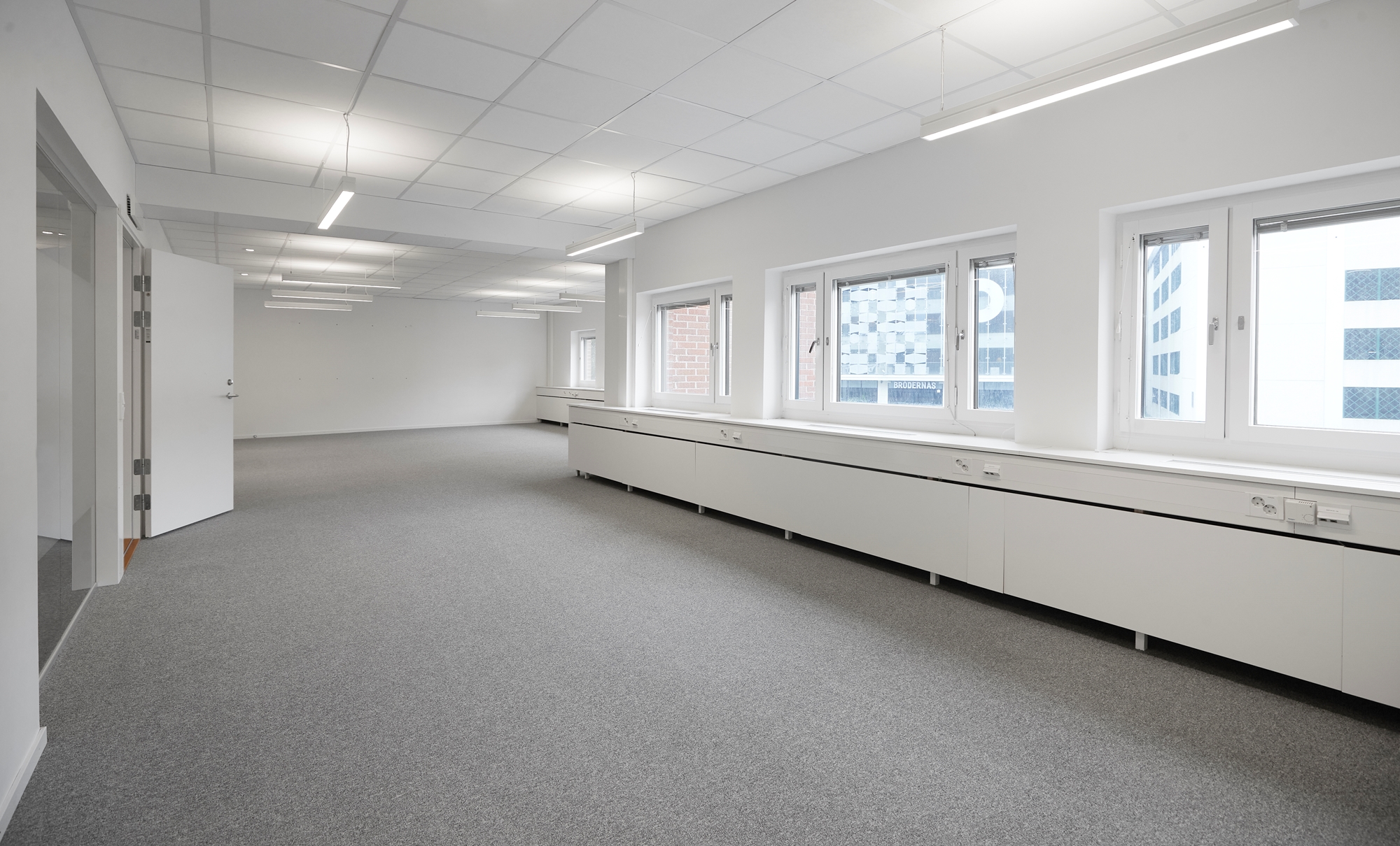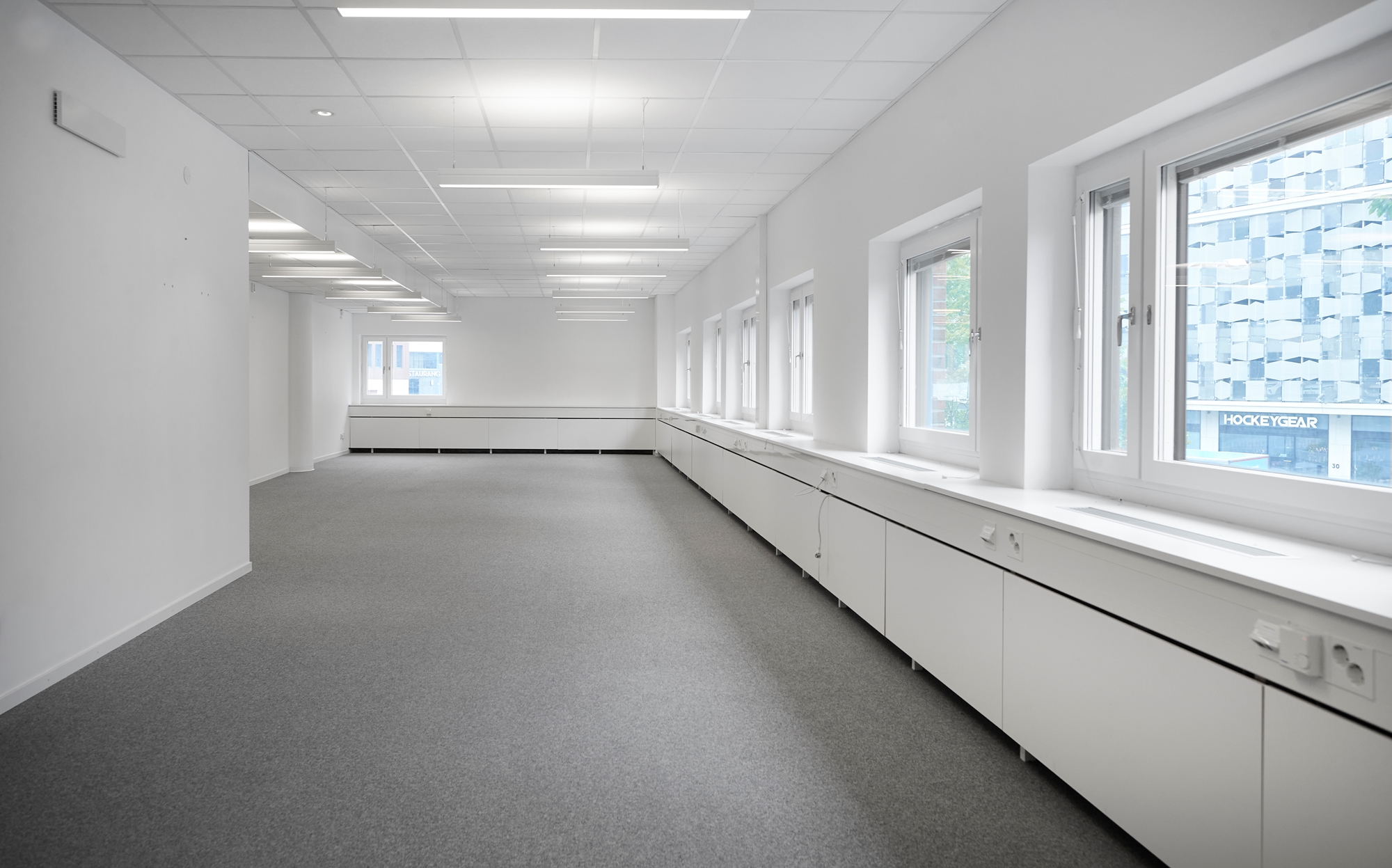 Trivsam och ljus lokal med vita väggar och ett genomgående textilmatta på golv. I lokalen finns flertalet arbetsrum, konferensrum samt toalett och RWC.