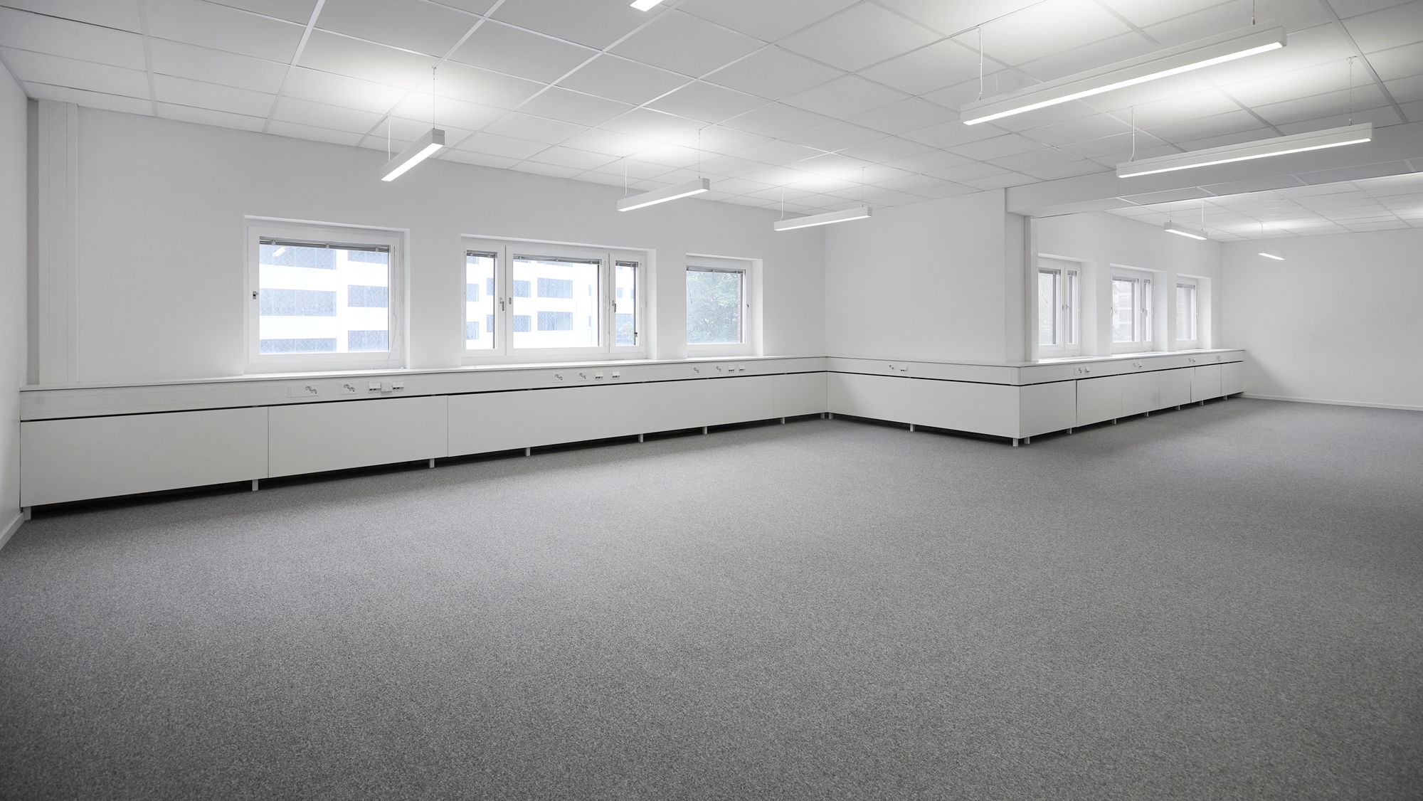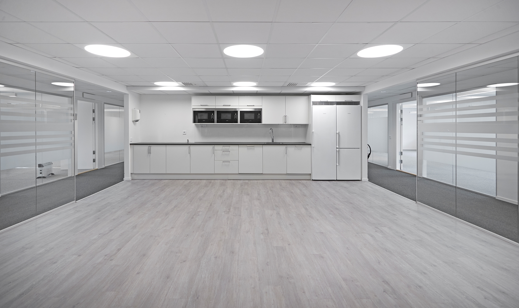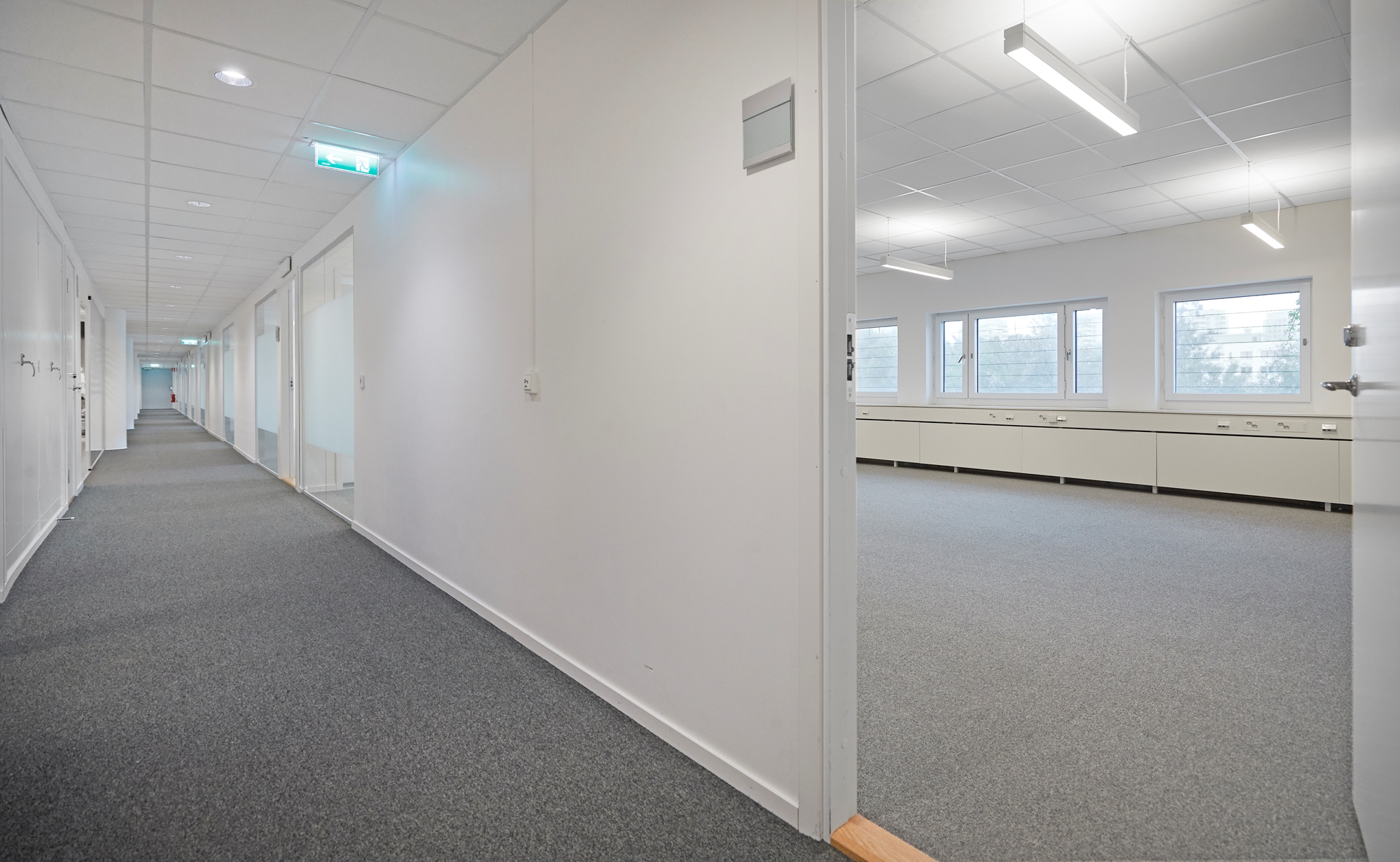 Trivsam och ljus lokal med vita väggar och ett genomgående textilmatta på golv. I lokalen finns flertalet arbetsrum, konferensrum samt toalett och RWC.