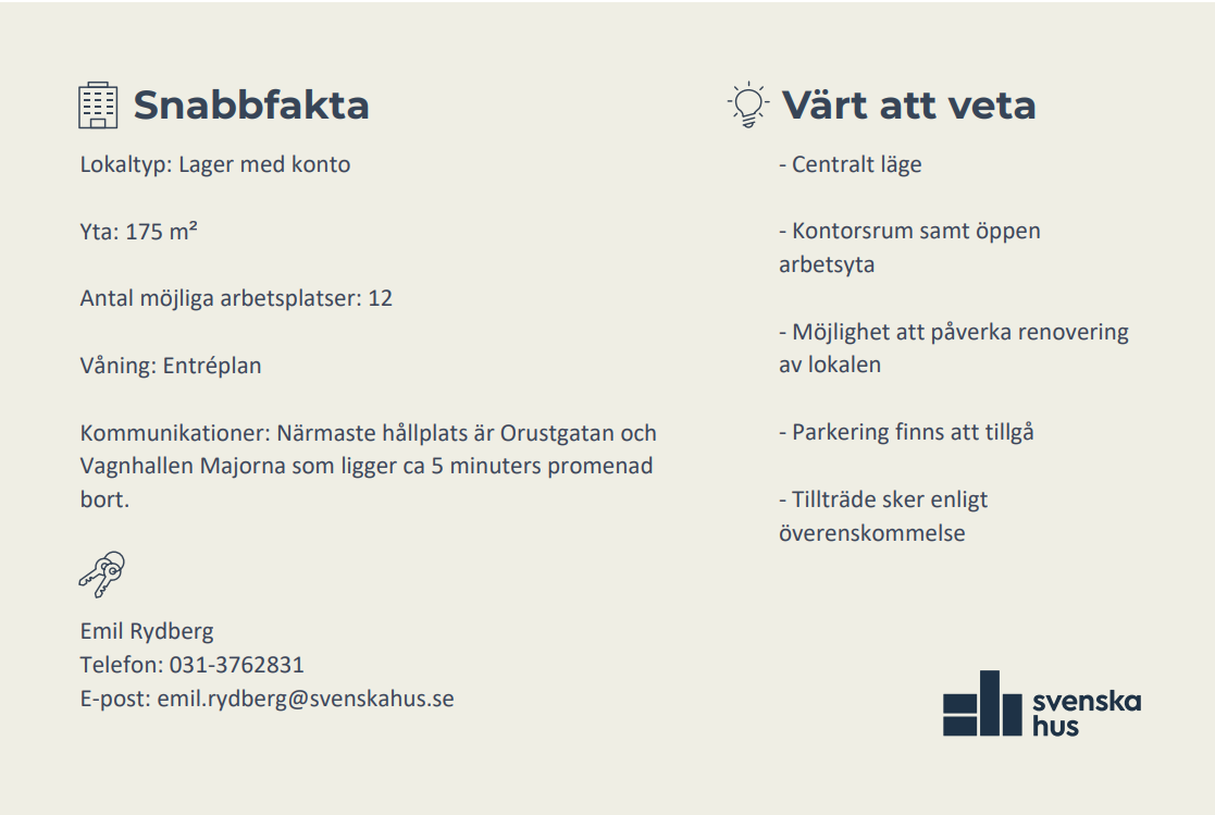 Lokalen erbjuder en rumsindelad planlösning med pentry samt två WC, varav en med dusch. Lokalen är i behov av uppfräschning, vilket ger möjlighet för ny hyresgäst att sätta sin egen prägel på ytan. Parkeringsplatser finns att hyra i anslutning till fastigheten, vilket gör det enkelt för personal och besökare att ta sig till lokalen.