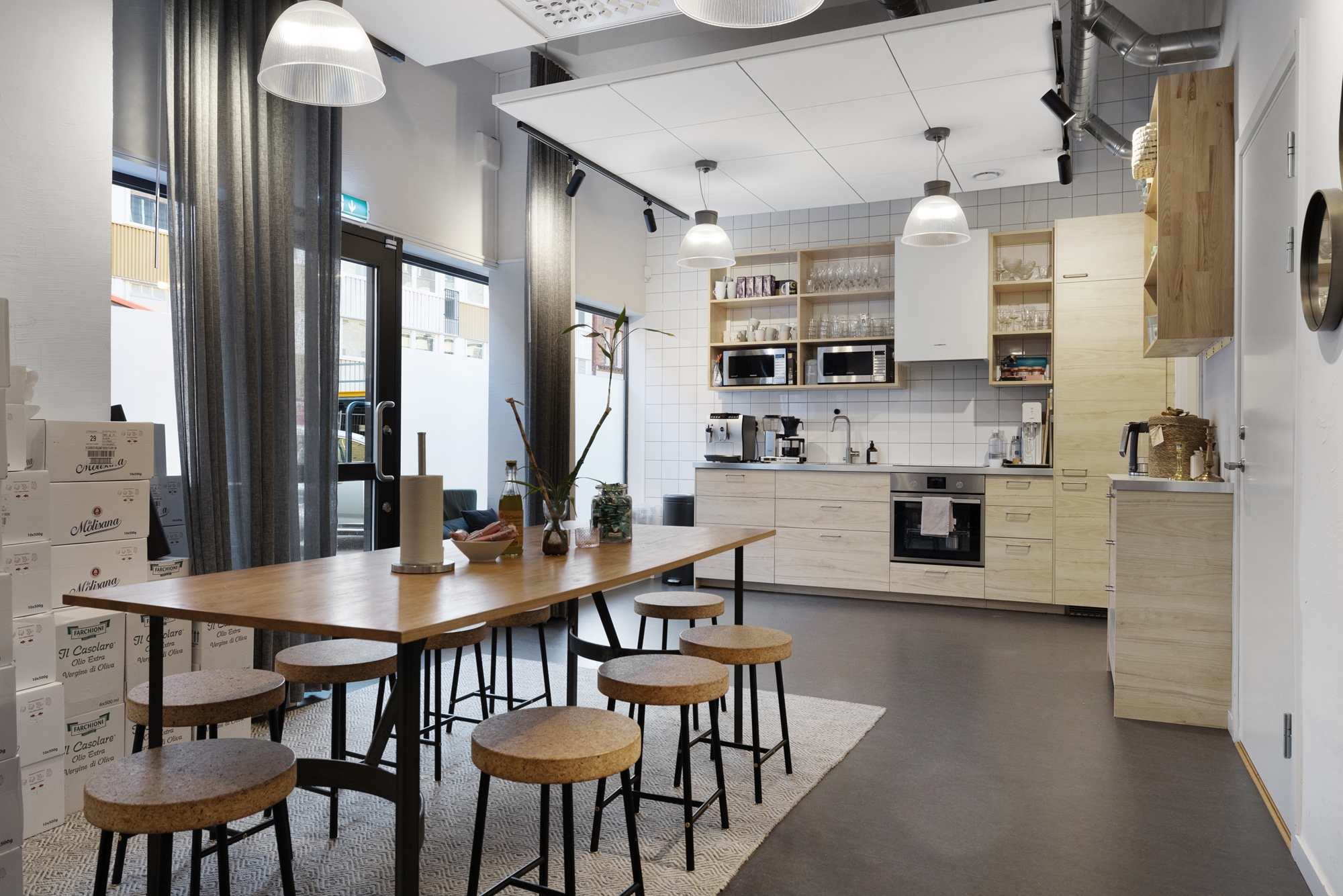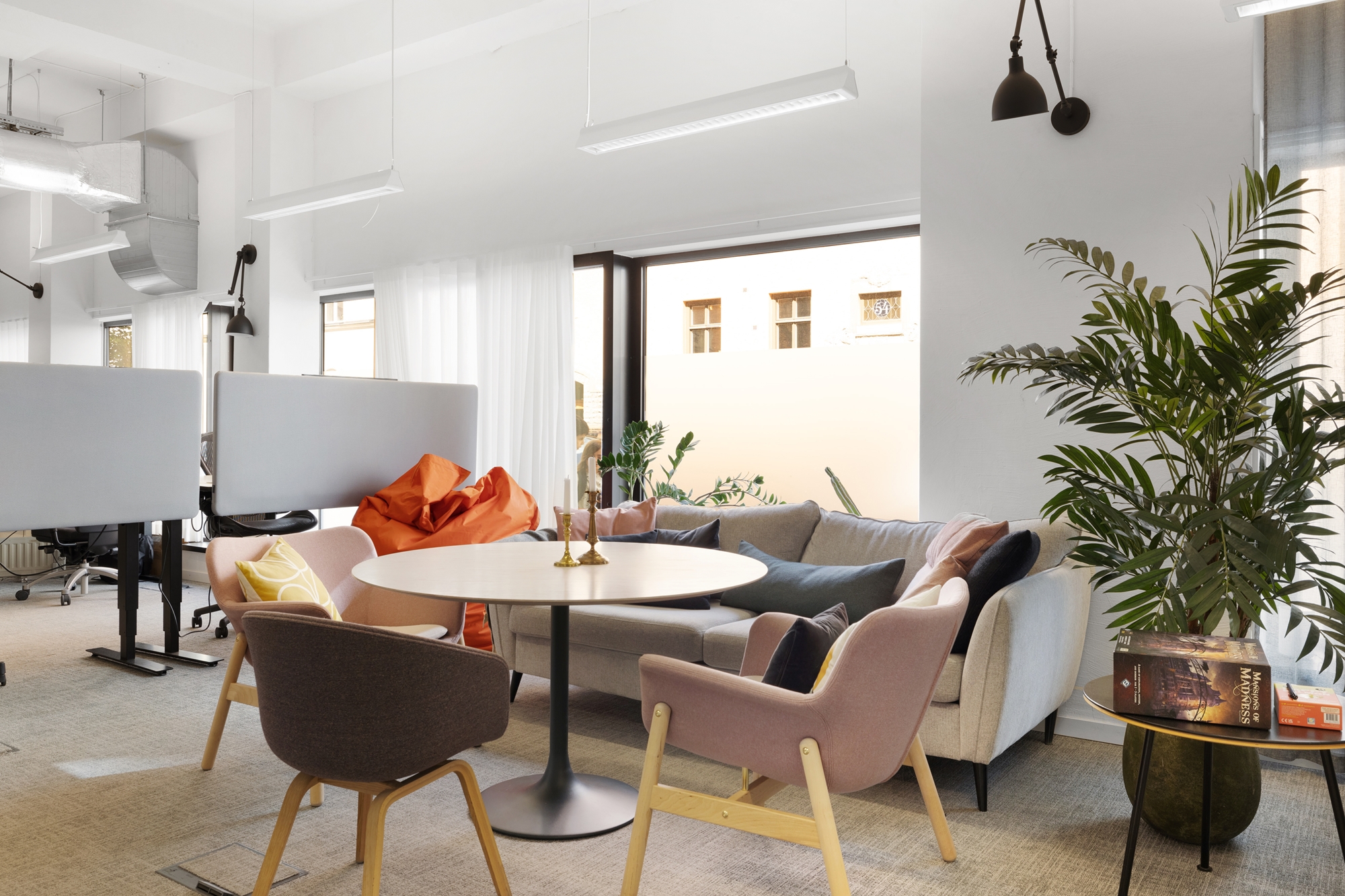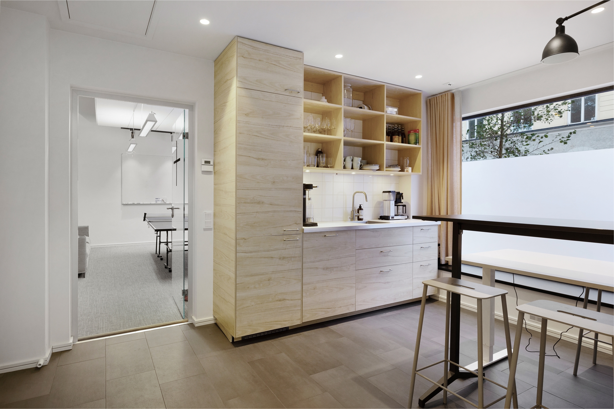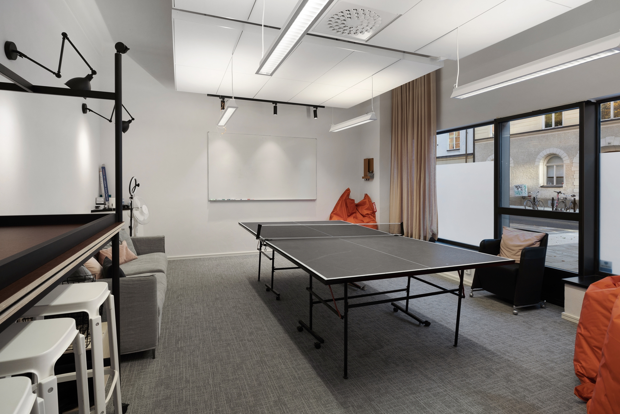 En öppen planlösning med rum för 20 fasta arbetsplatser. Flertalet mindre samtals/mötesrum, dubbla kök och pingisrum.