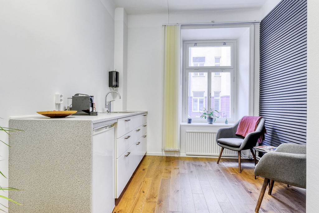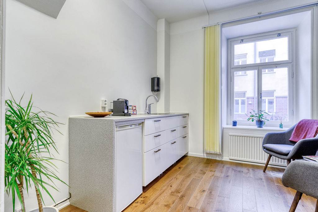 Pentry med sittplatser för besökare alternativt mötesbord/köksbord.