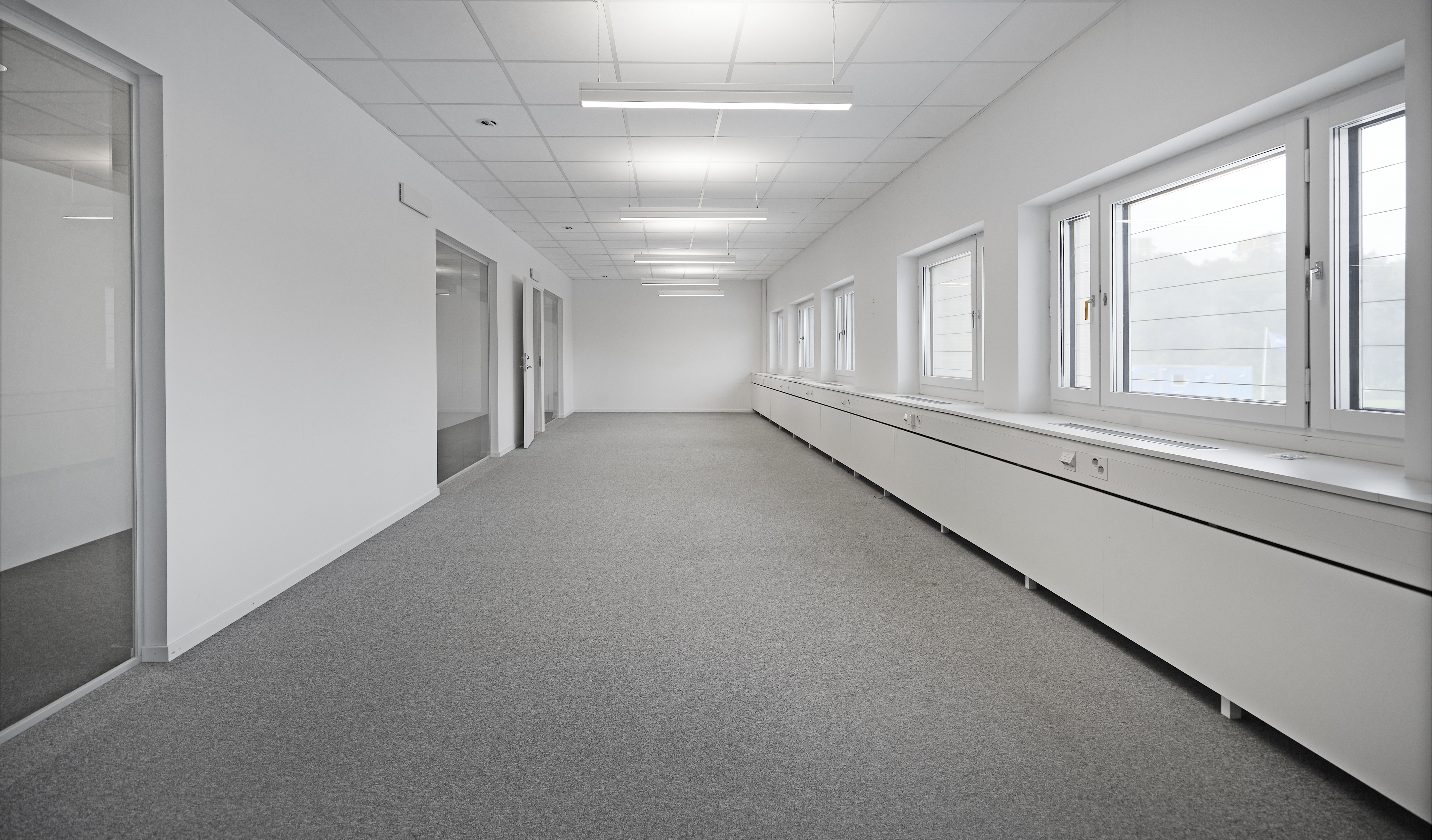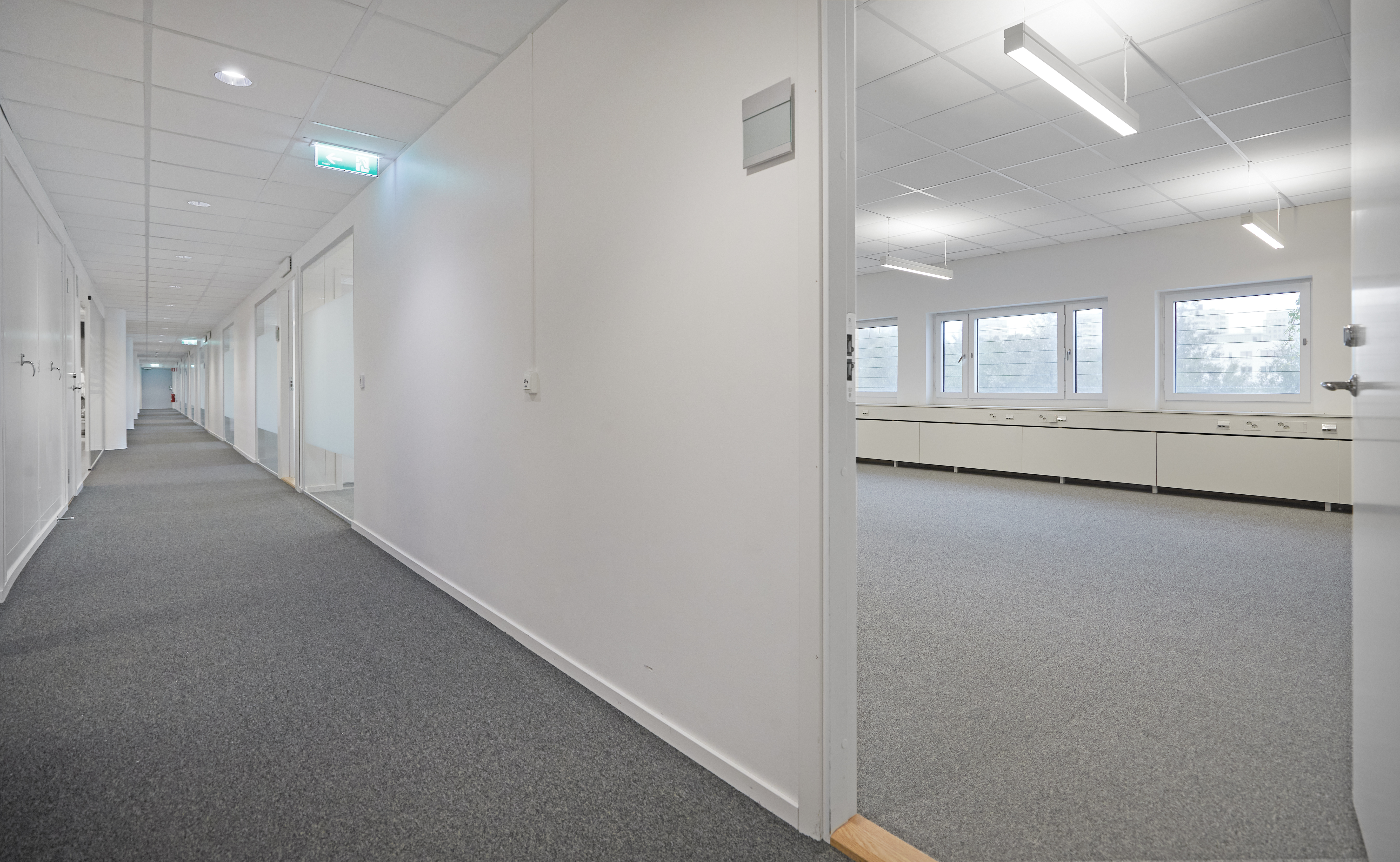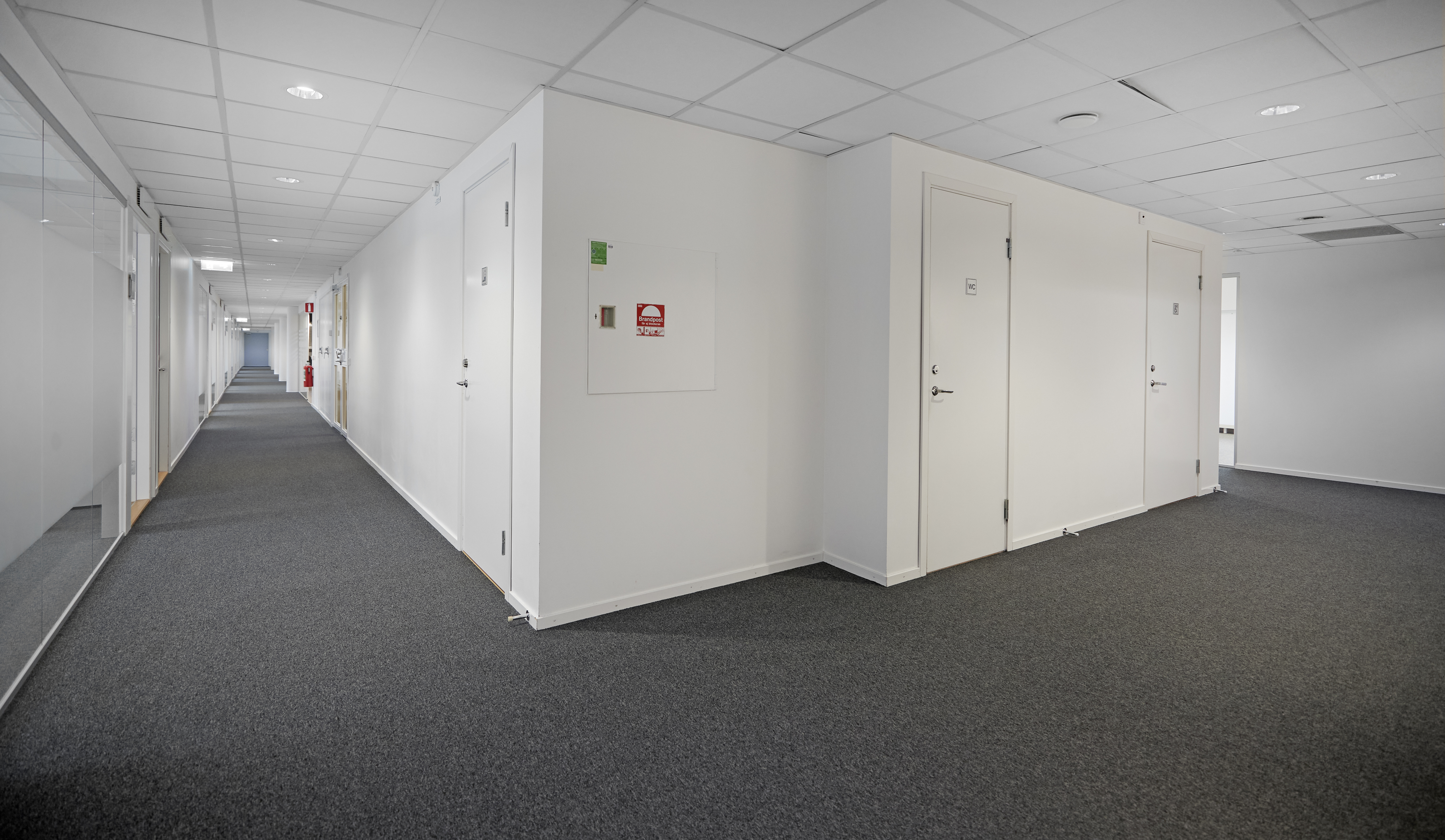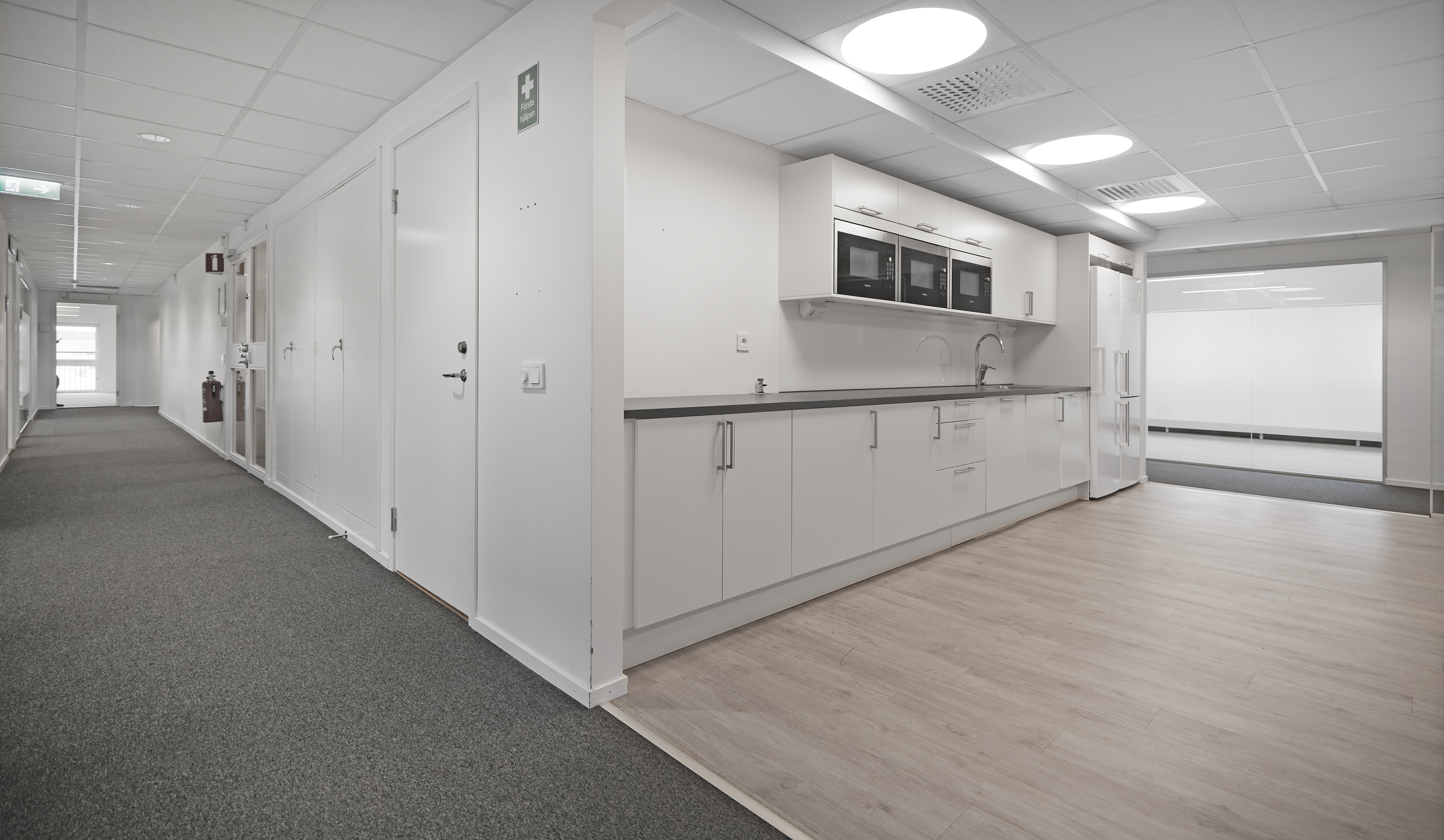 Trivsam och ljus lokal med vita väggar och ett genomgående textilmatta på golv. I lokalen finns flertalet arbetsrum, konferensrum samt toalett och RWC.