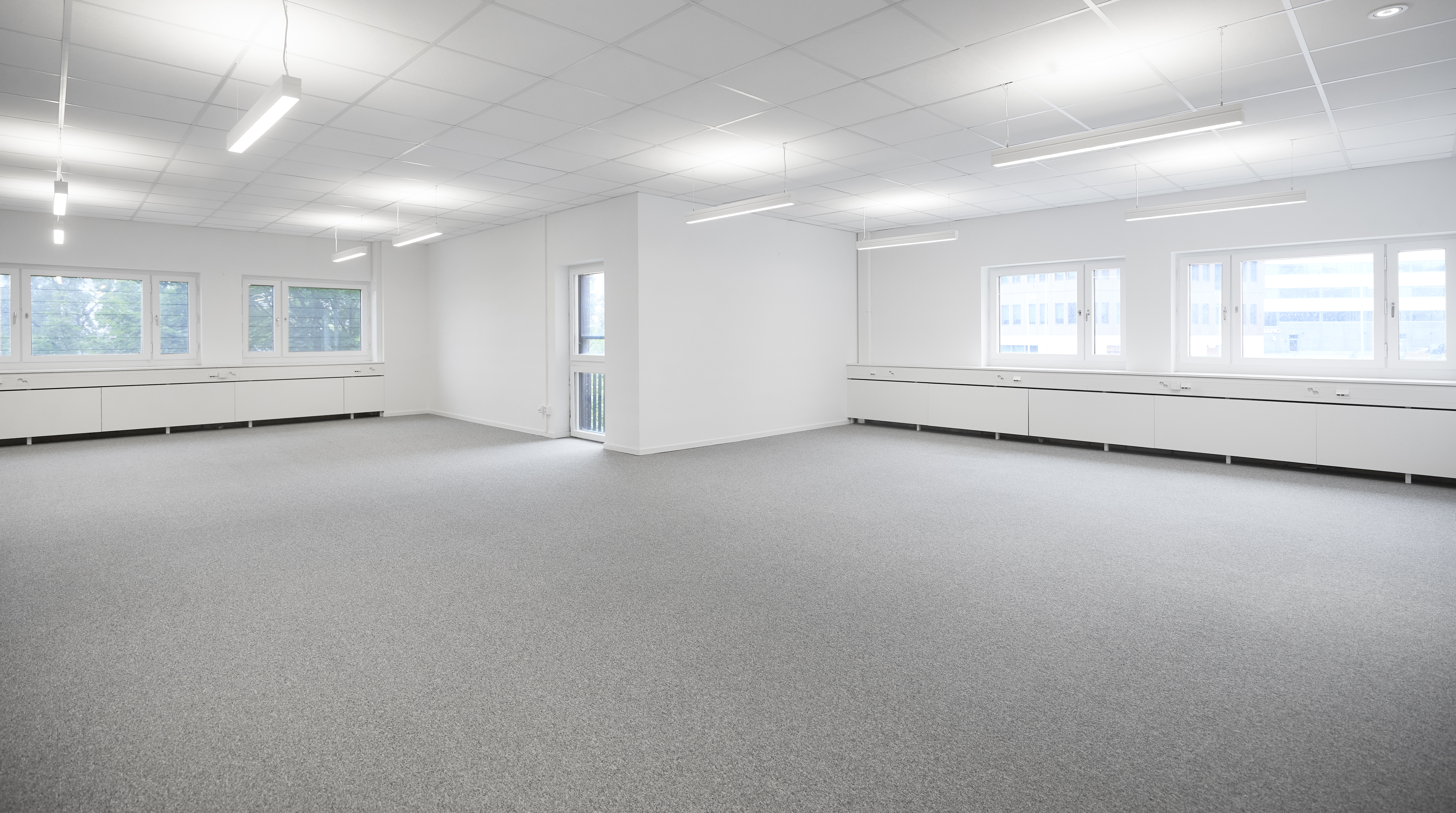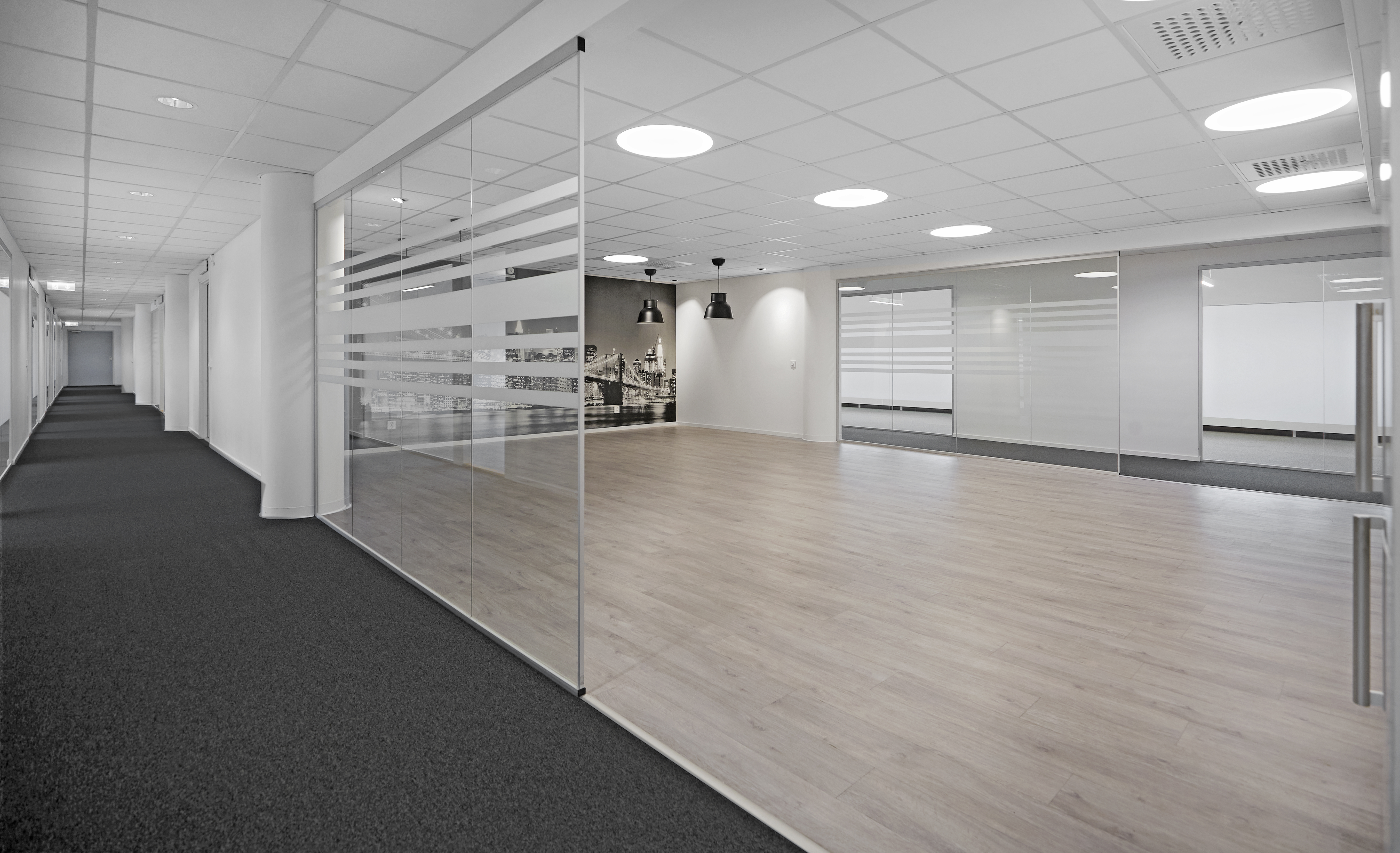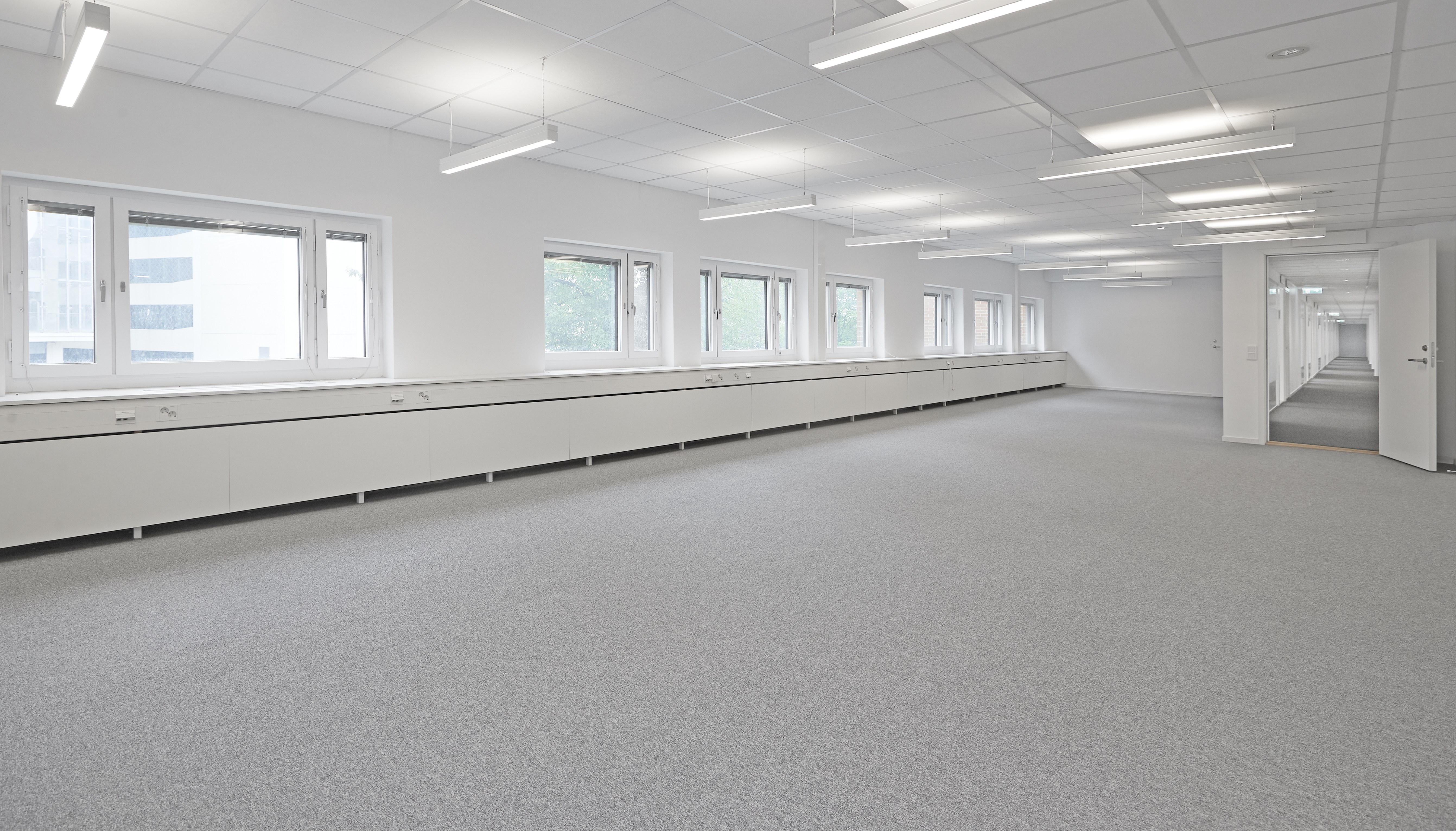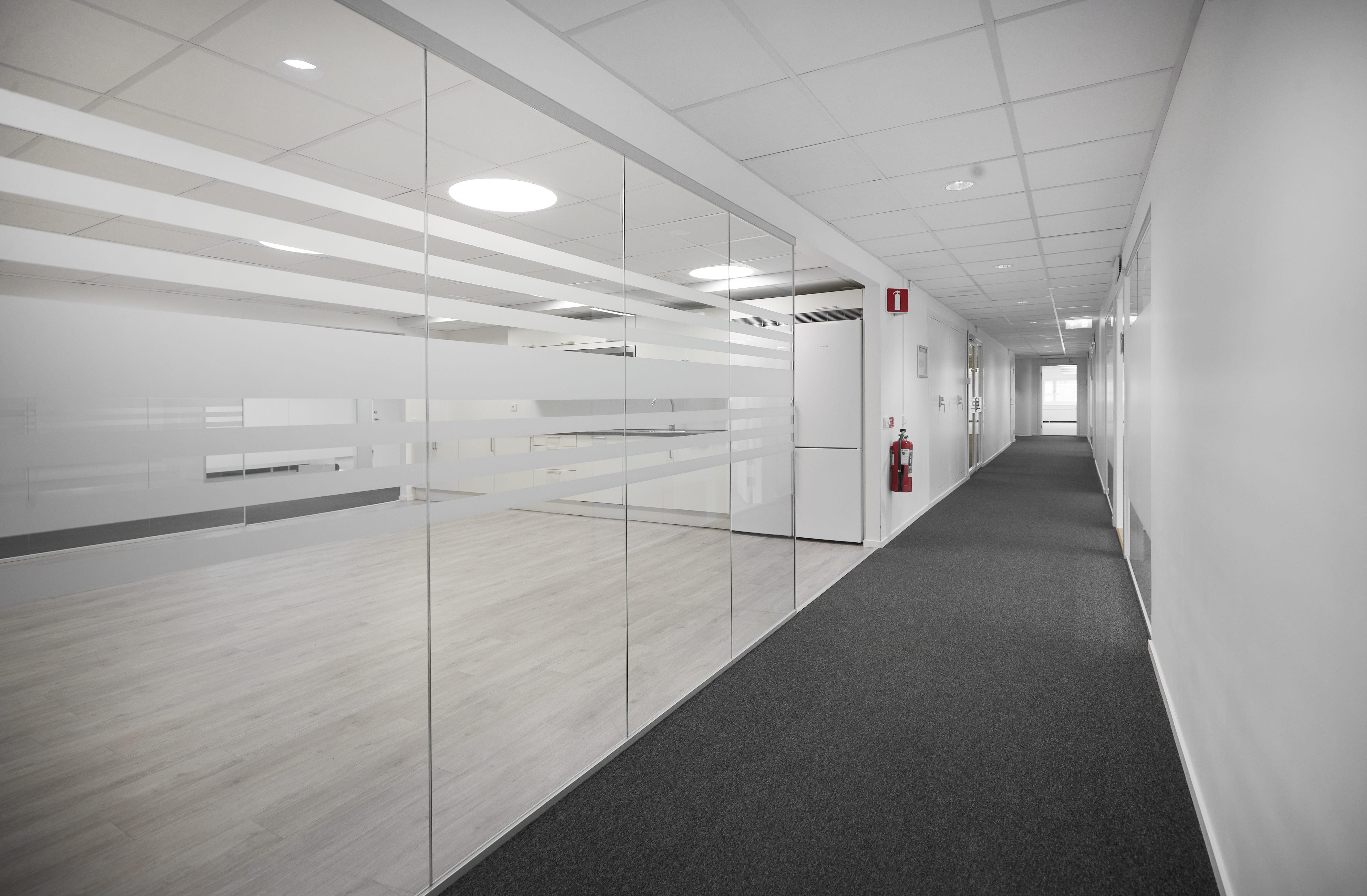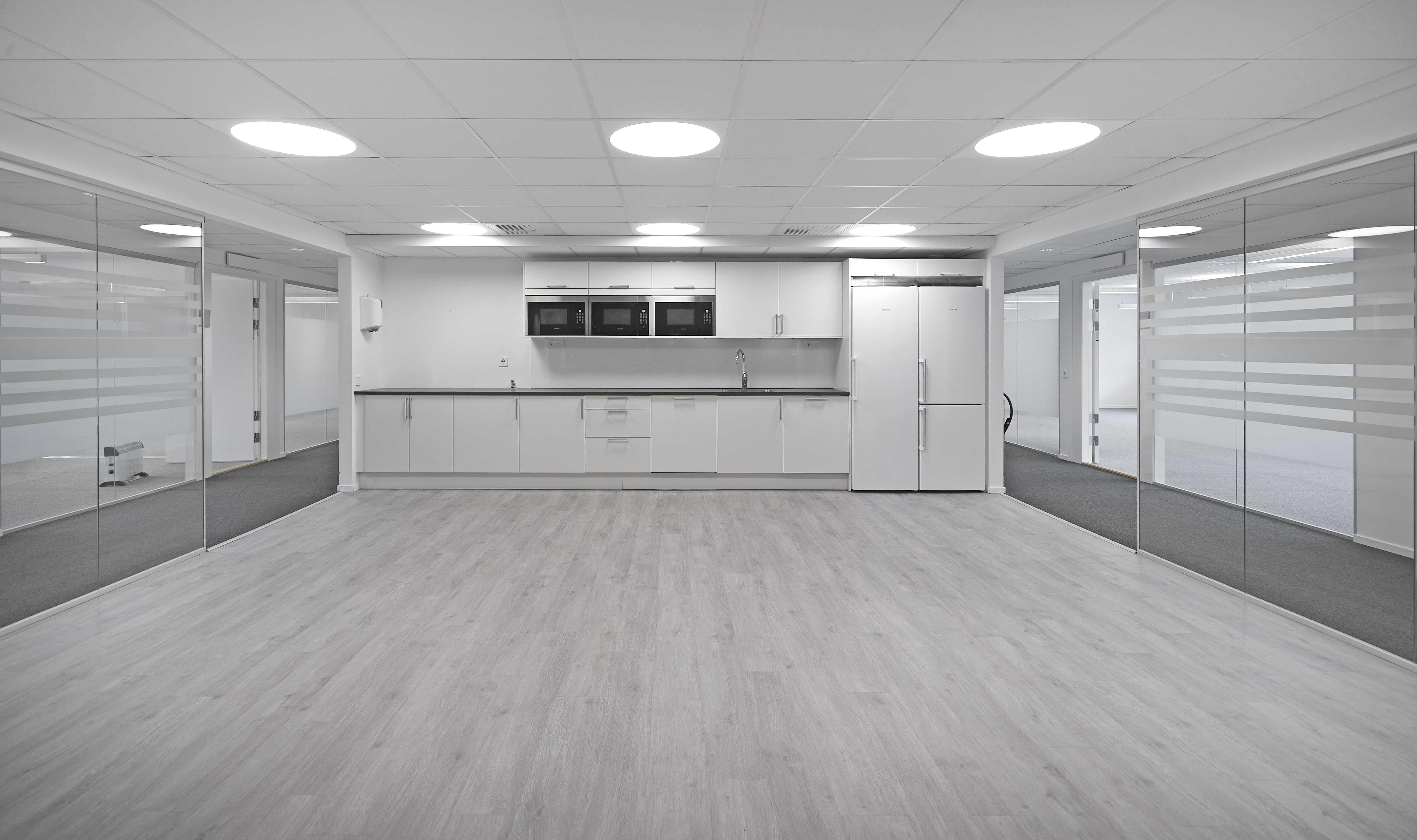 Trivsam och ljus lokal med vita väggar och ett genomgående textilmatta på golv. I lokalen finns flertalet arbetsrum, konferensrum samt toalett och RWC.