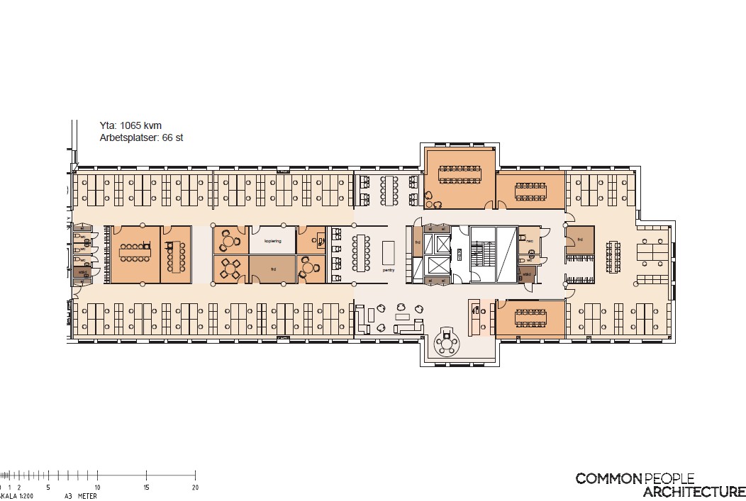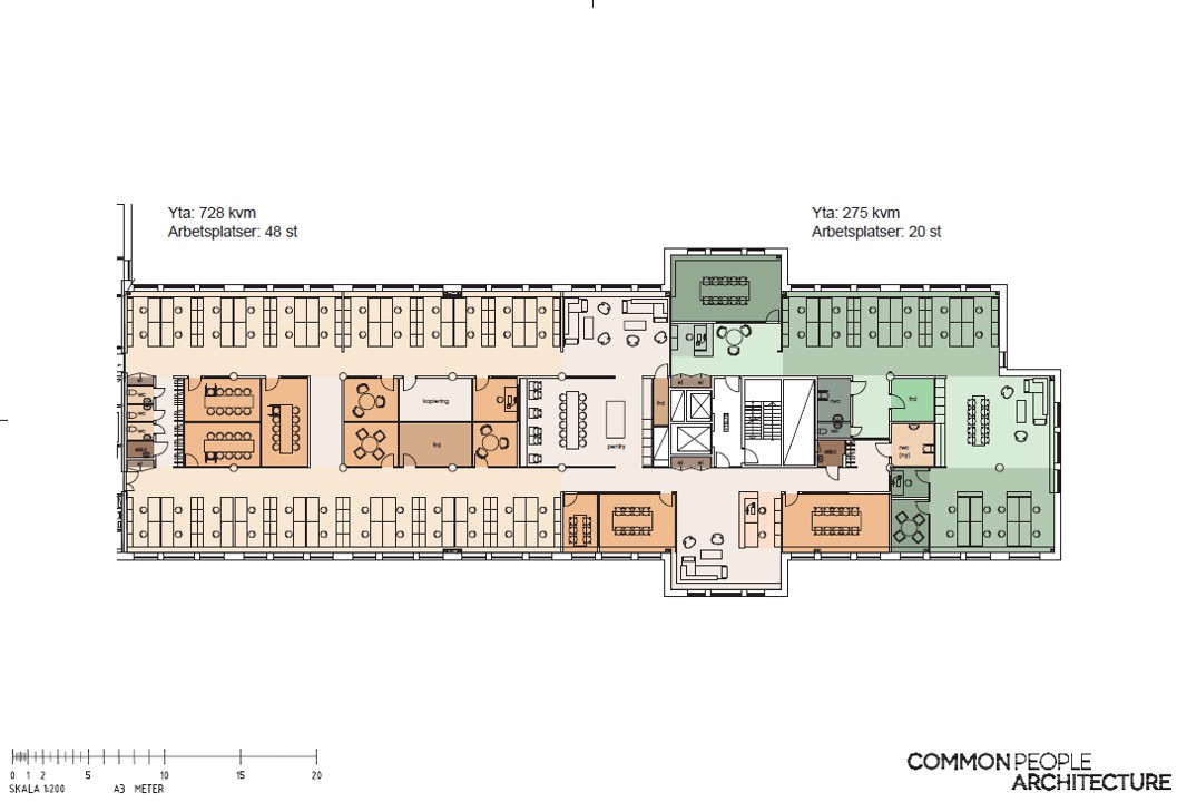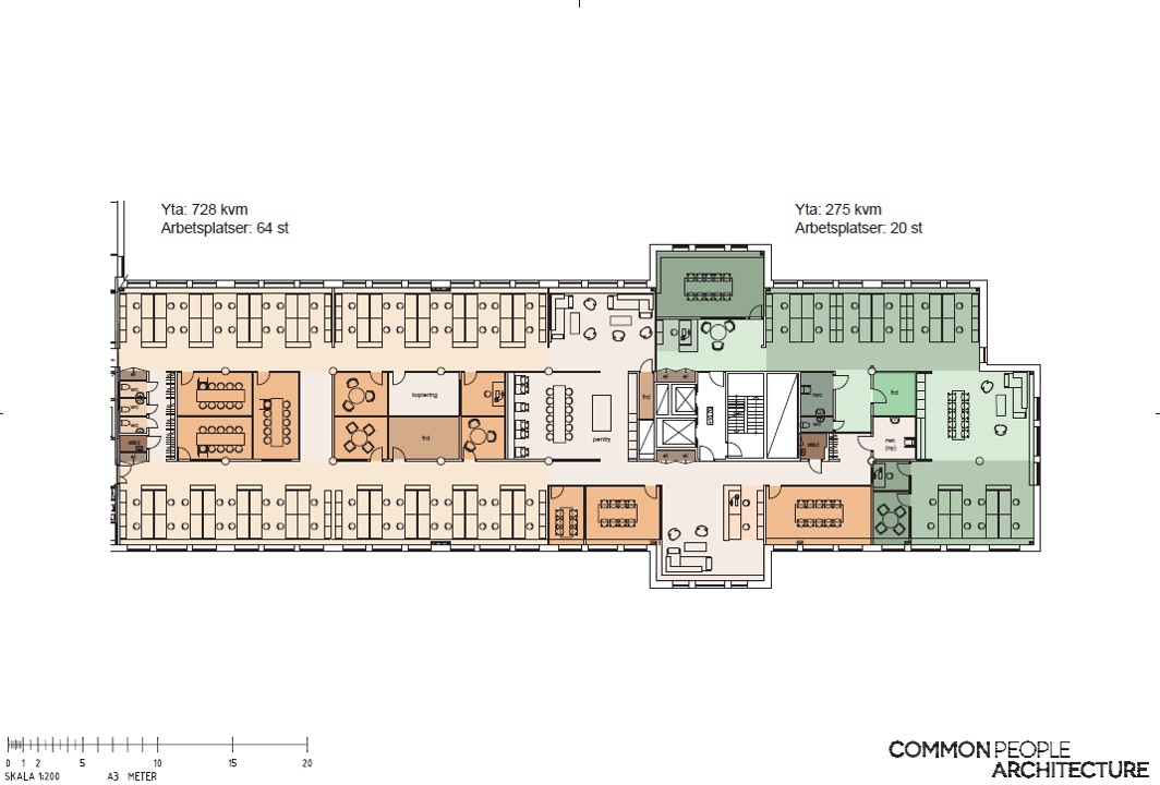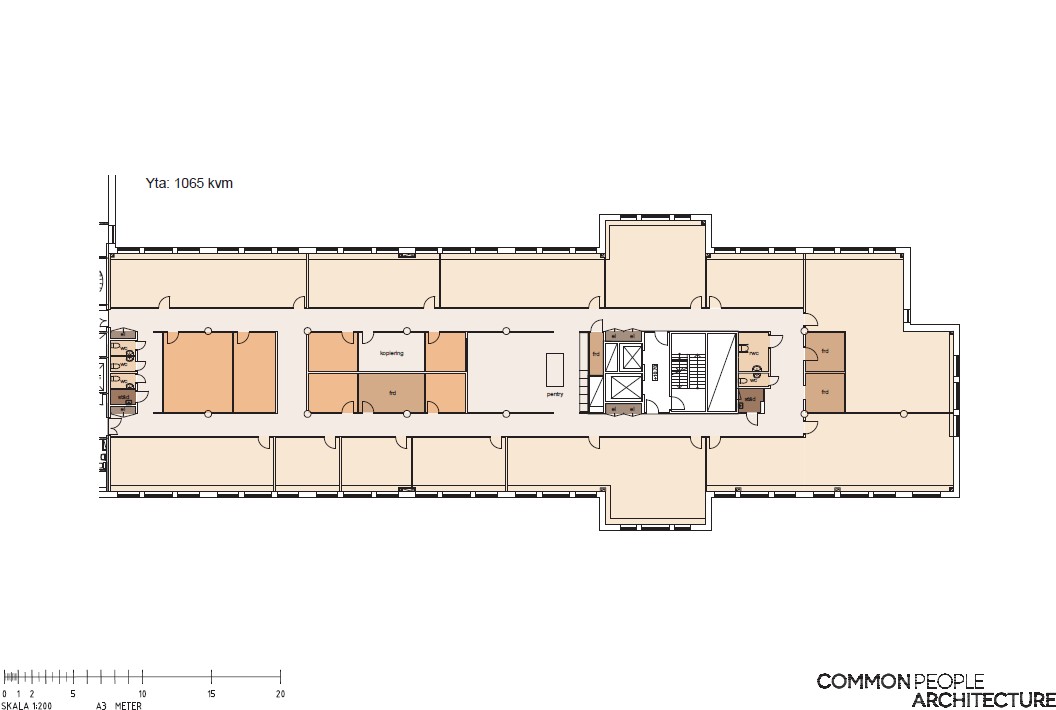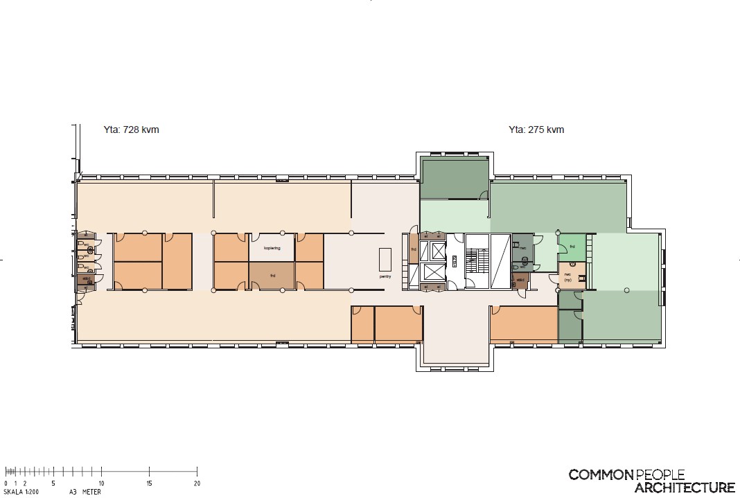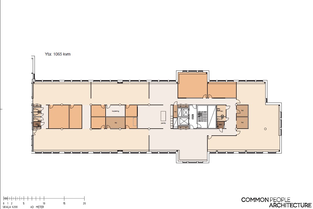 Lokalens totala yta är 1065 kvm men går att dela av i flear mindre lokaler, se alternativa planlösningar som mäter 728 kvm respektive 275 kvm.