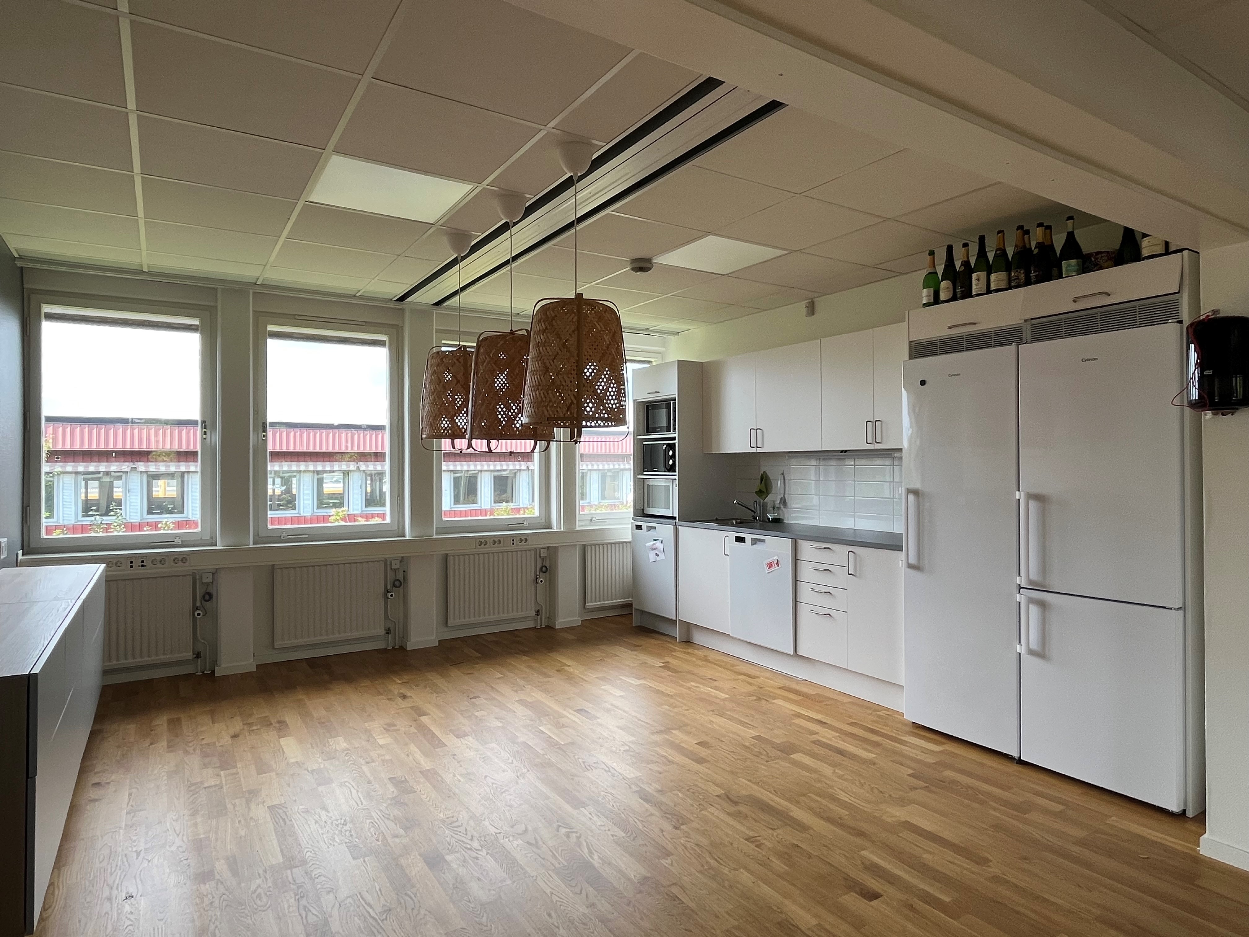 I mitten av lokalen finns ett stort pentry med plats för matbord och lounge. Två toaletter finns att tillgå.