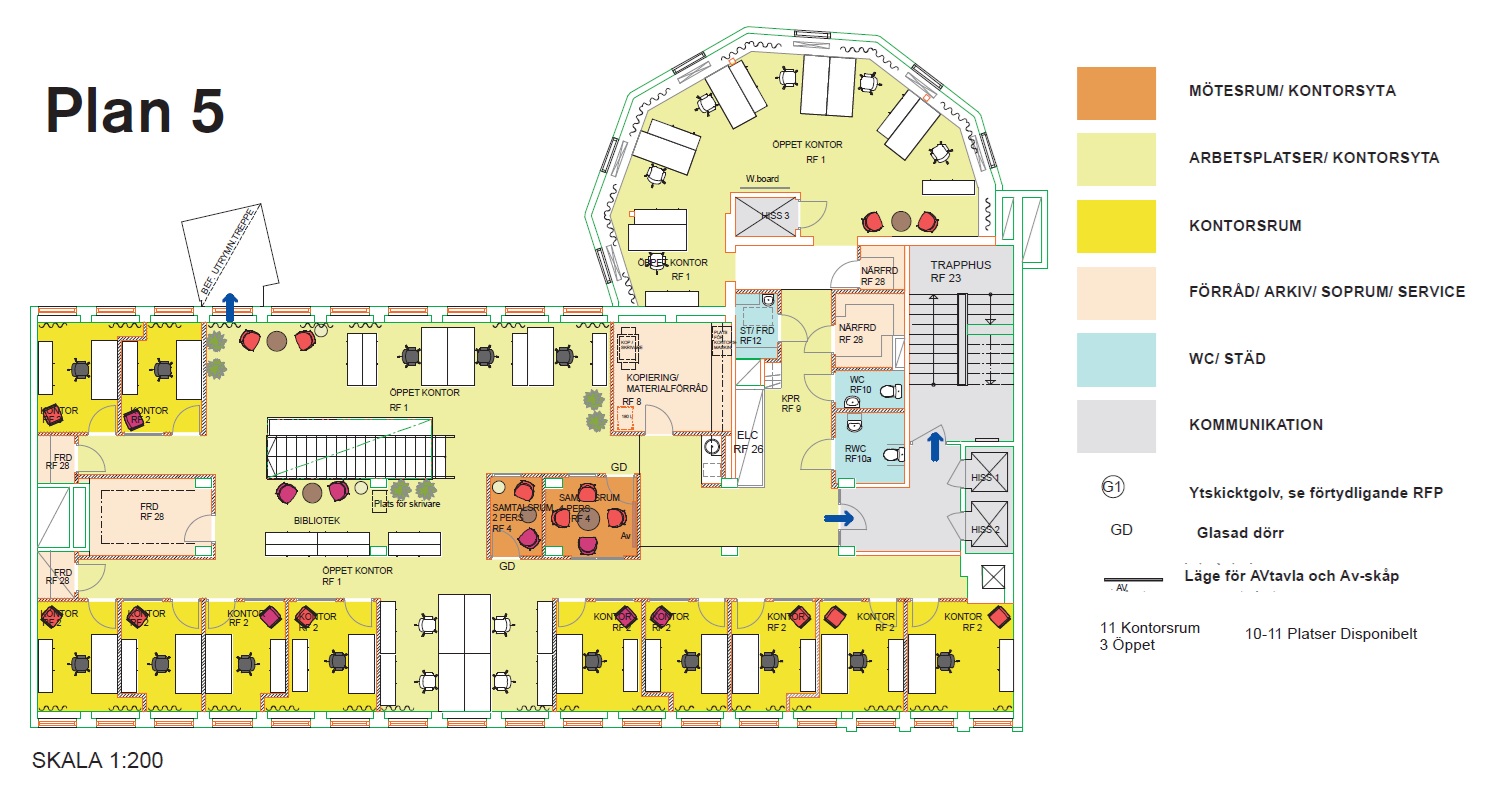 Plan 5 om ca 450 m2: Här finns 11 stycken cellkontor lämpliga för 1 person vardera. Övrig yta utgörs av två kontorslandskap samt en öppen yta med plats för ca 4 arbetsplatser. Det finns ett samtalsrum lämpligt för 4 personer samt 4 mindre för 1 person. Större konferensrum finns att tillgå på husets entréplan. Pentryt är central placerat i öppen yta. Lokalen har två wc varav en tillgänglighetsanpassad. Det finns även några mindre förrådsutrymmen samt miljöstation.