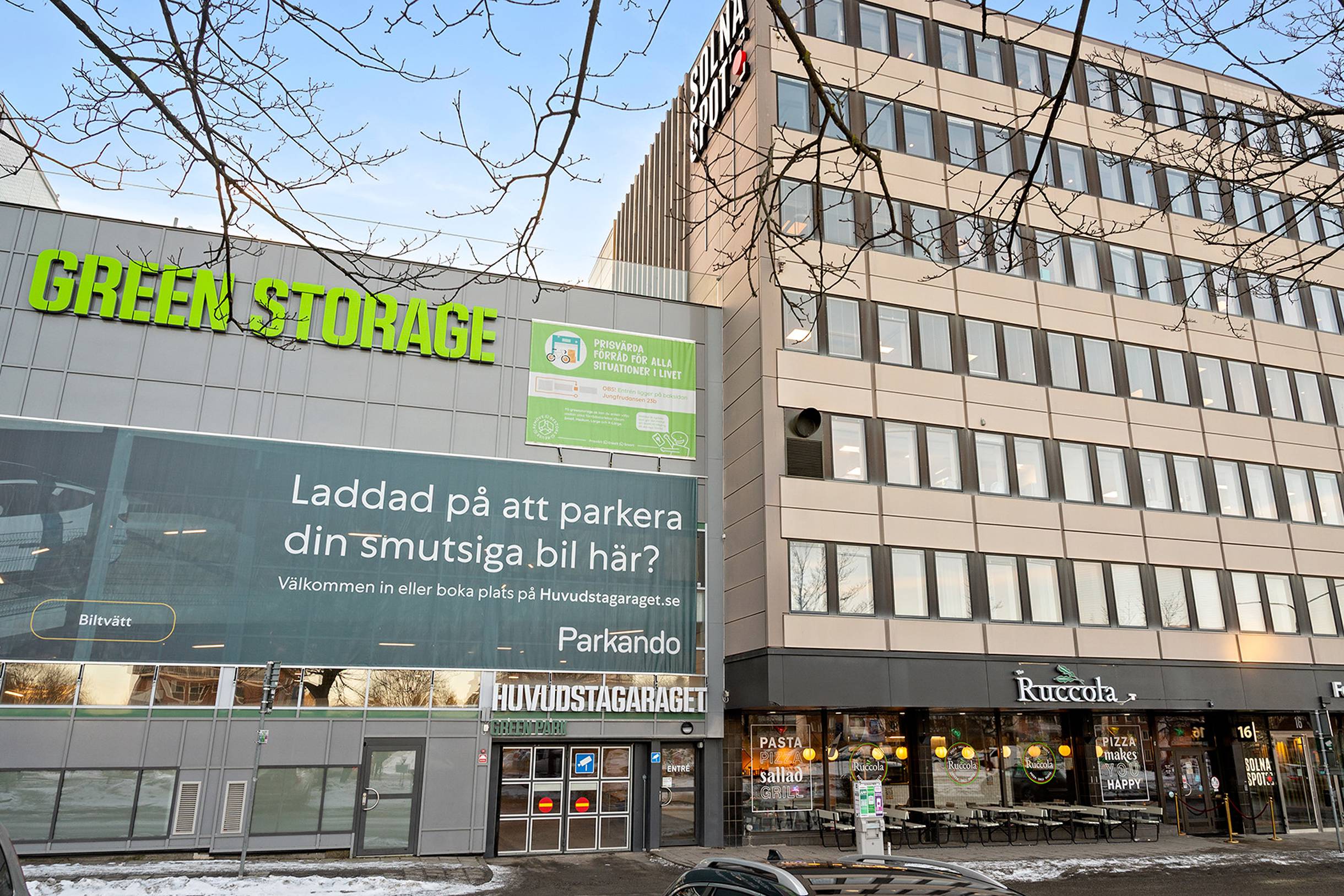 Lokalen är belägen i Huvudstagaraget som har ett mycket stort antal parkeringsplatser i varmgarage. I loklaens yta finns 3 parkeringsplatser bakom bom som hör till lokalen. Verkstadsdelen kan även användas för parkering av cirka 3 bilar.