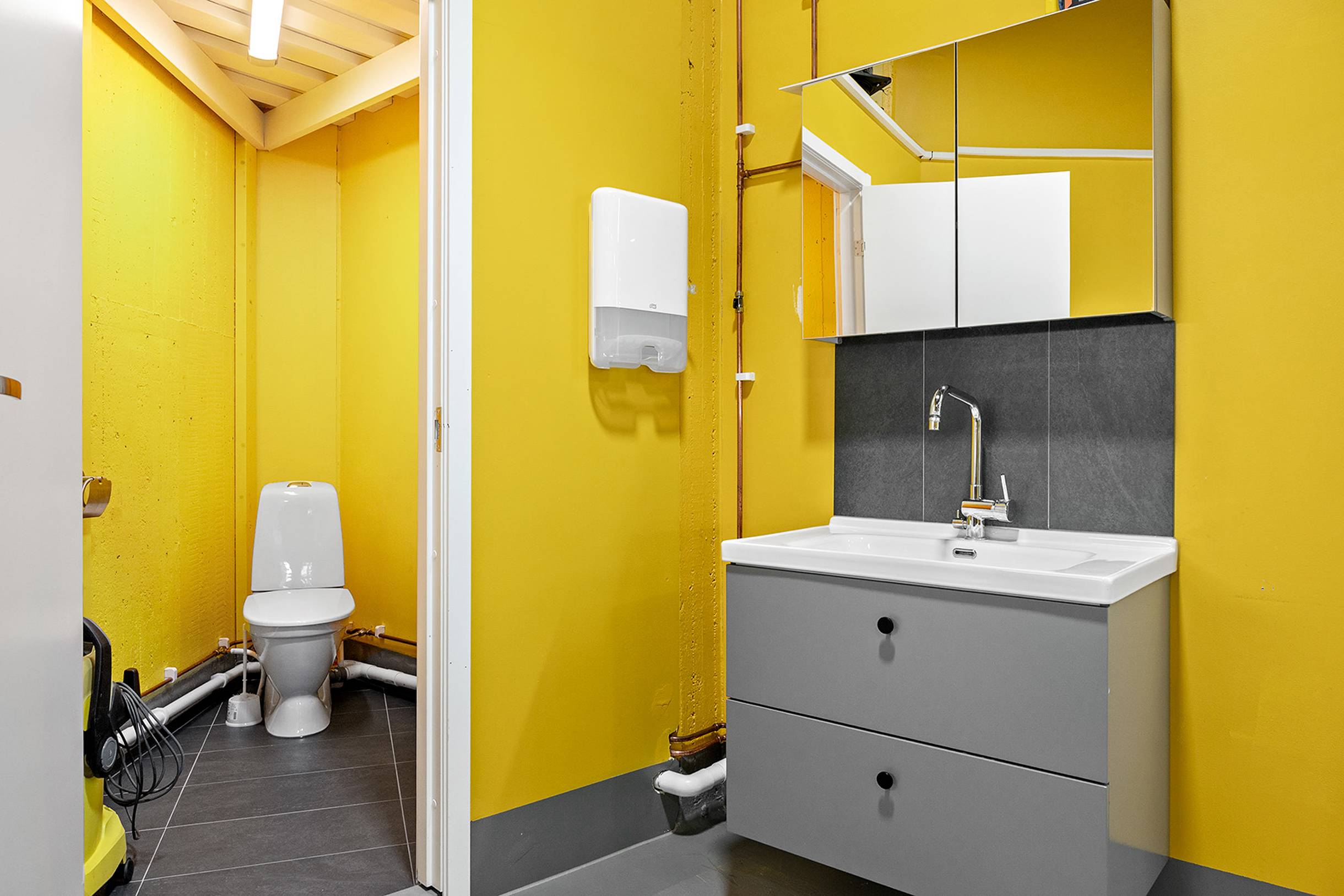 I arbetsytorna utanför porten finns golvbrunn med oljeavskiljare, parkeringsplatser och nödutgång. Utanför bommen finns det några tvättplatser som tillhör garagets hyresgäster och kan nyttjas av den som hyr denna lokal.