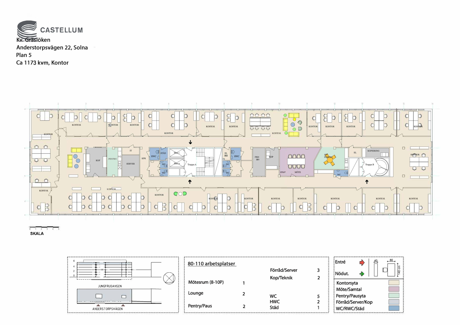 Planlösningen är utormad för att skapa en effektiv och flexibel arbetsmiljö. En komination av öppna arbetsytor och touchdown-platser finns men även mindre kontorsrum. Loungeytor samt ett mötesrum finns även det i lokalen. Praktiska ytor som förråd och teknikrum finns även tillgängligt i lokalen.