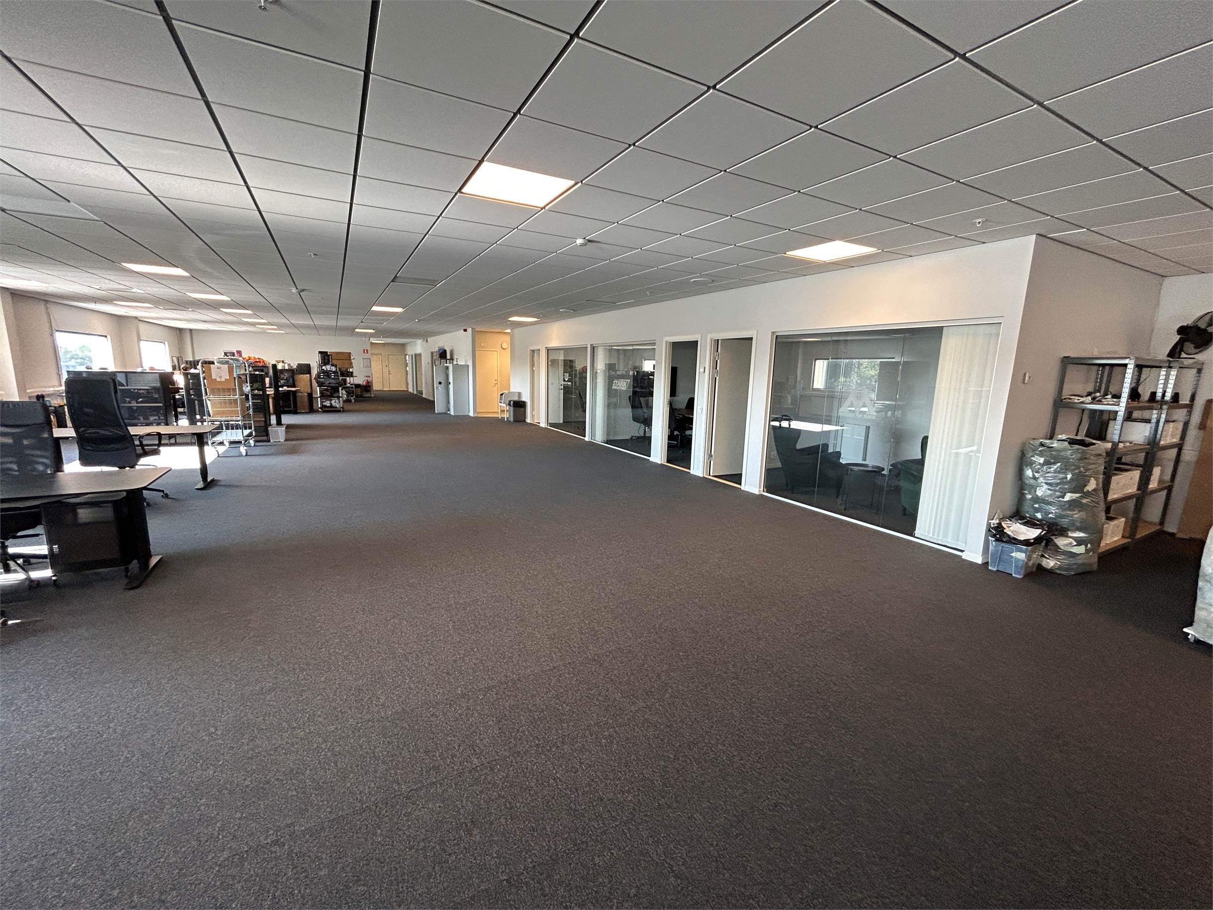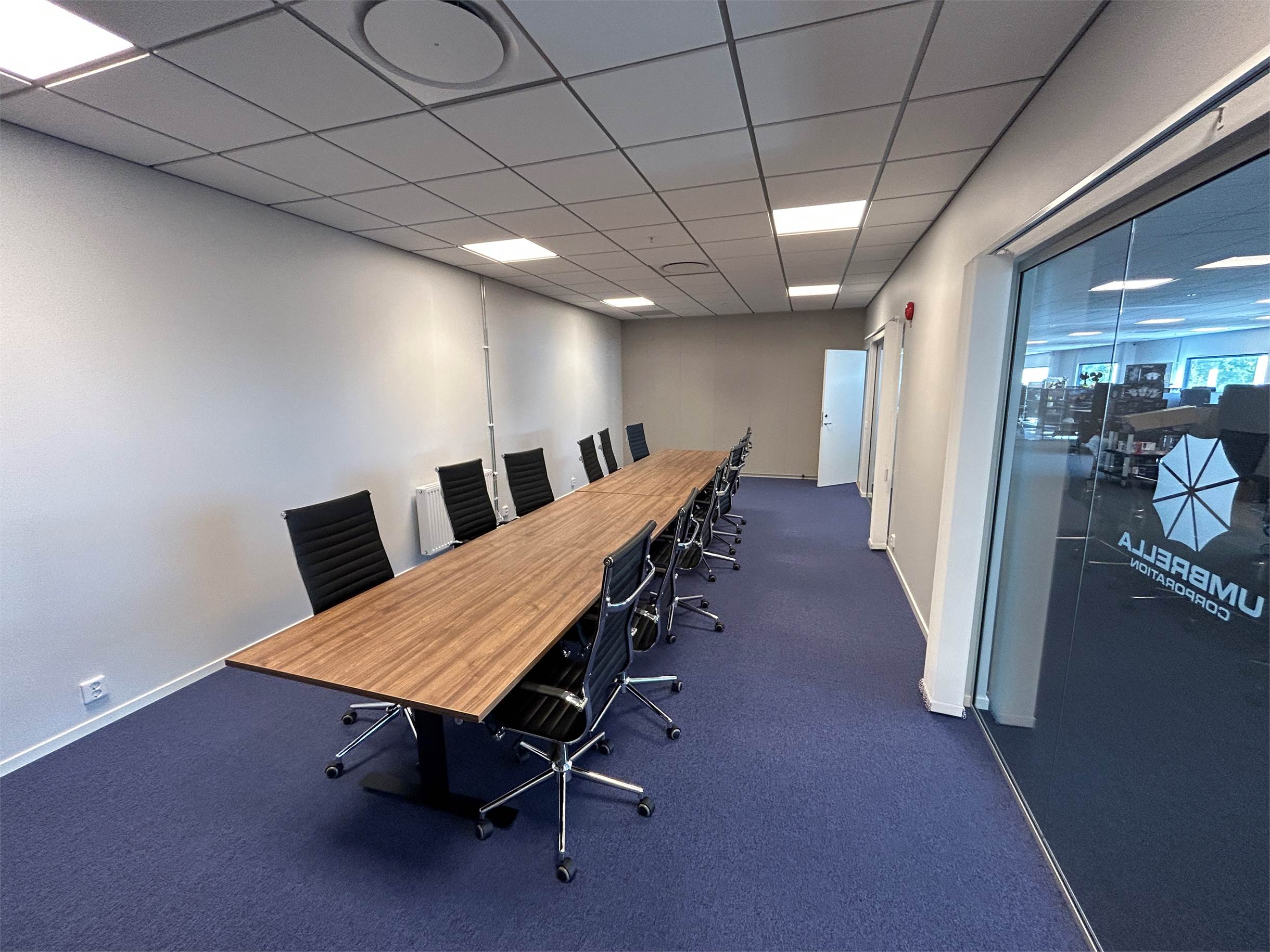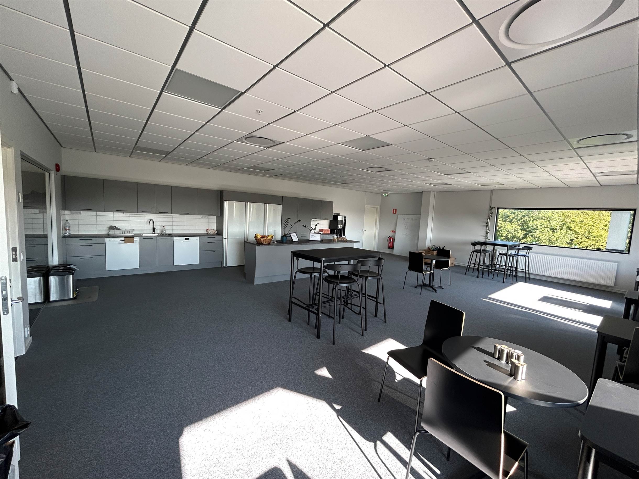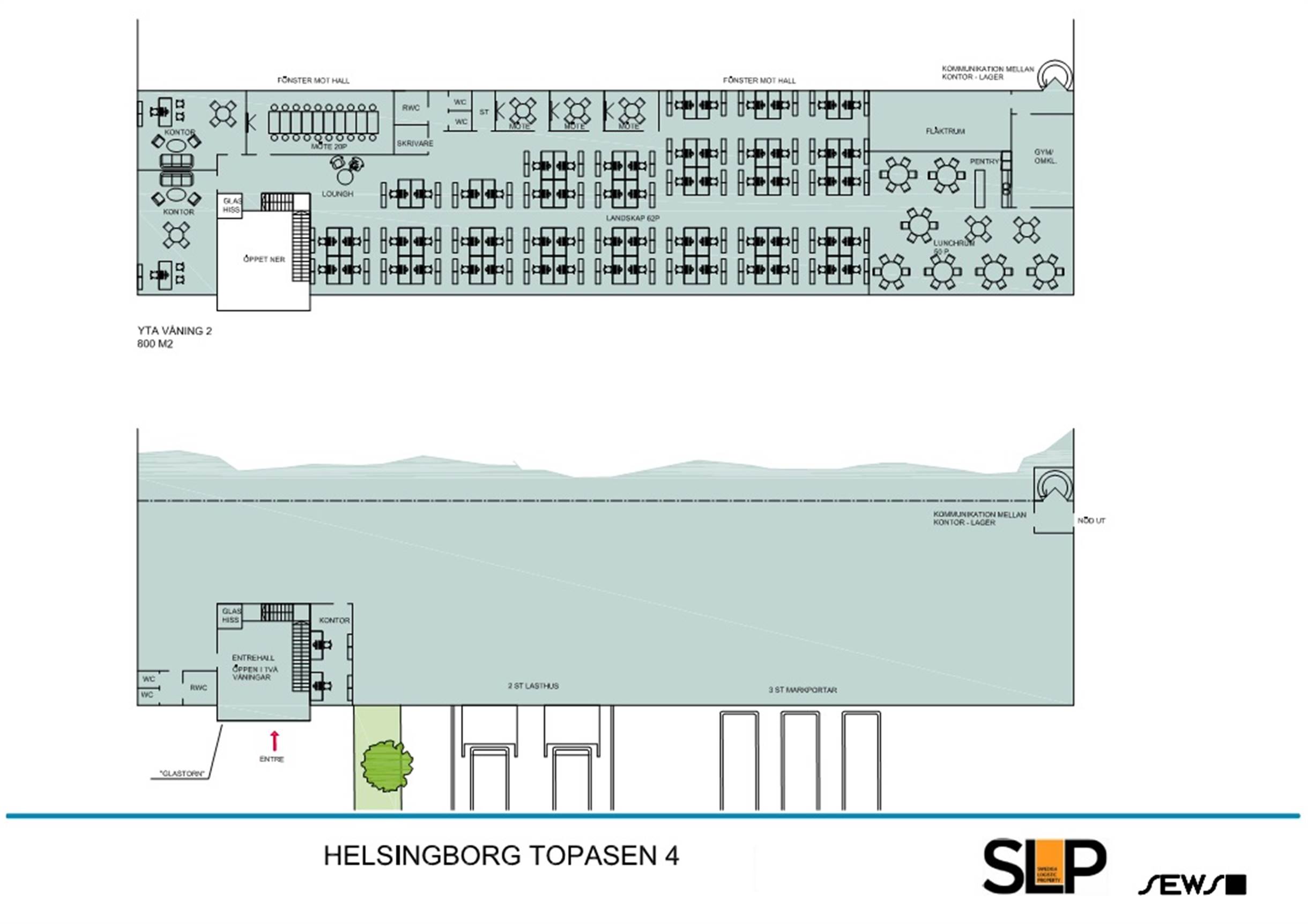Öppen kontorslösning, mötesrum, lunchrum, omklädningsrum på andra plan.