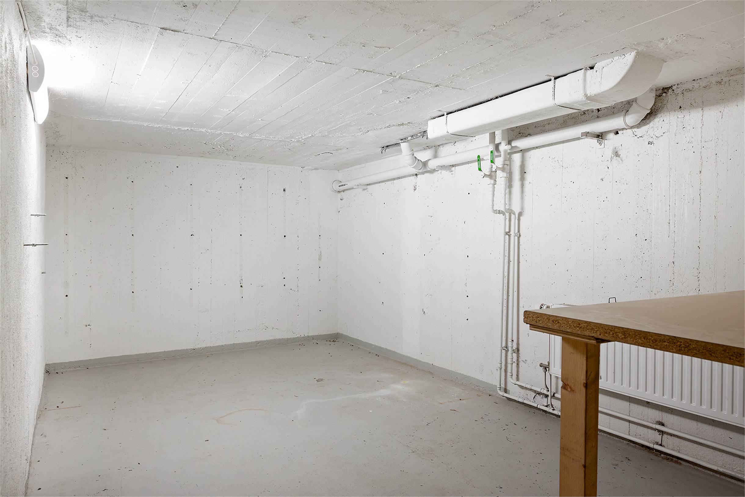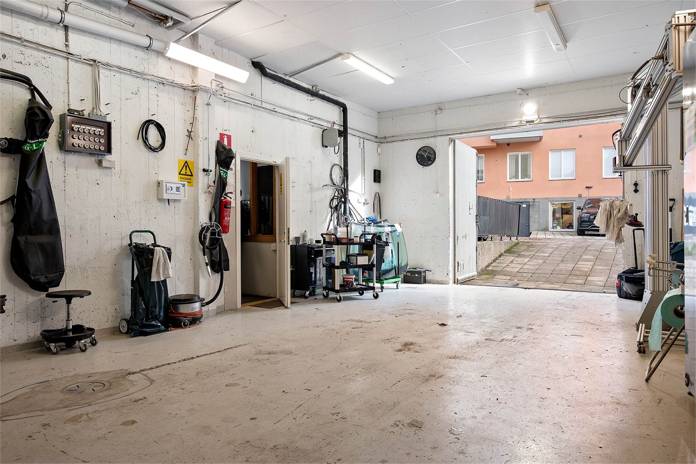 Verkstadsdelen har en egen port med dubbeldörr och en parkeringsplats framför porten. Verksataden är även utrustad med tryckluftssystem där man har kompressor kopplat till det i källaren. Här finns även vatten och avlopp.
