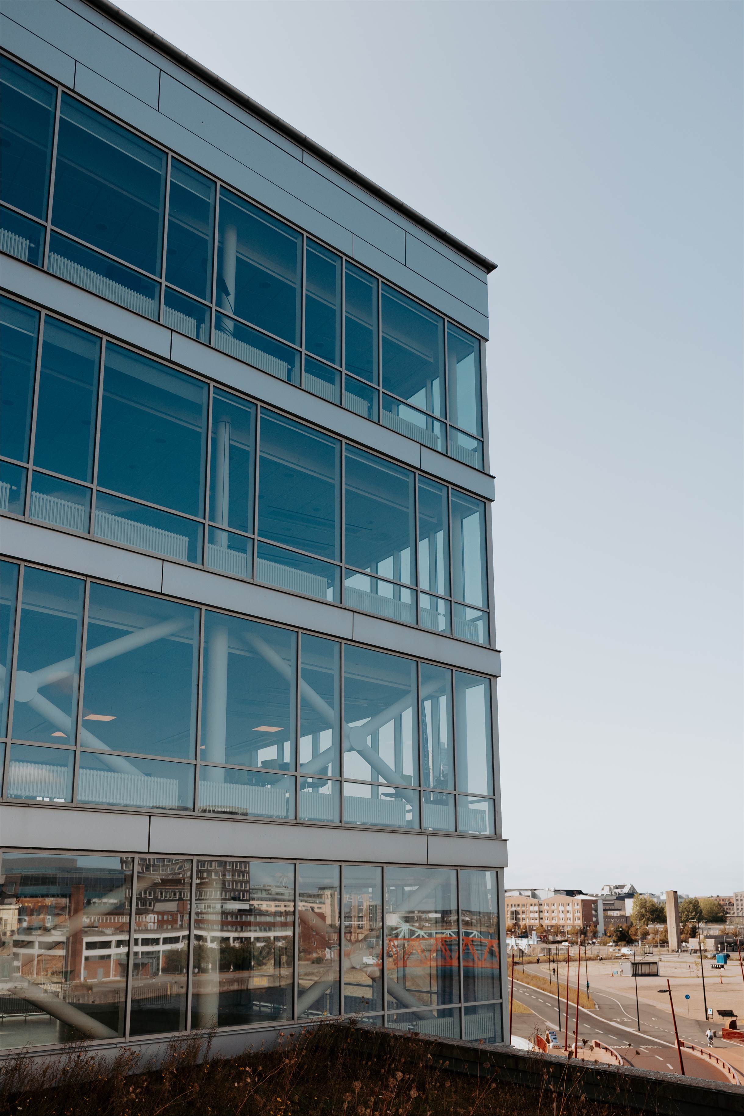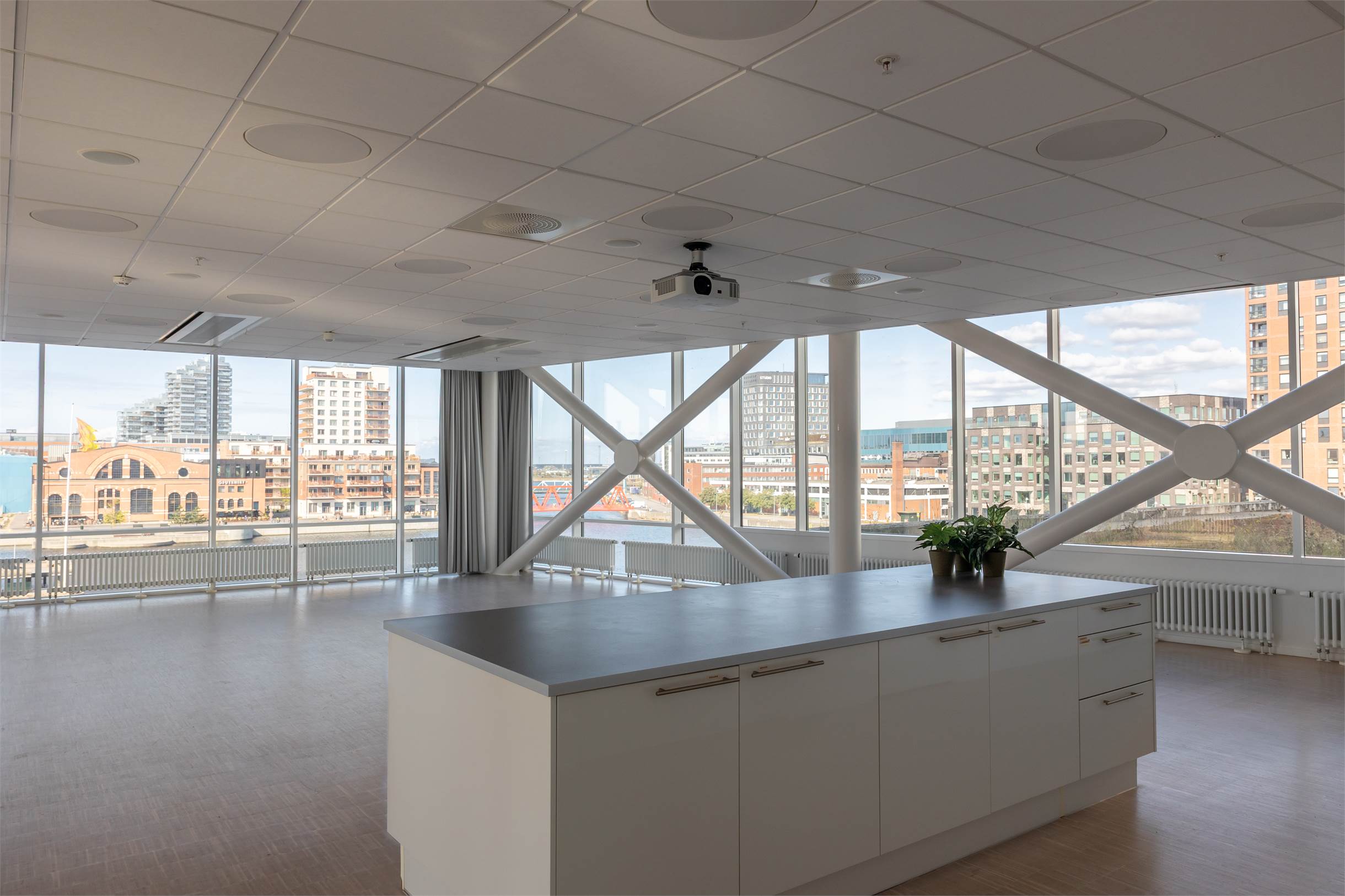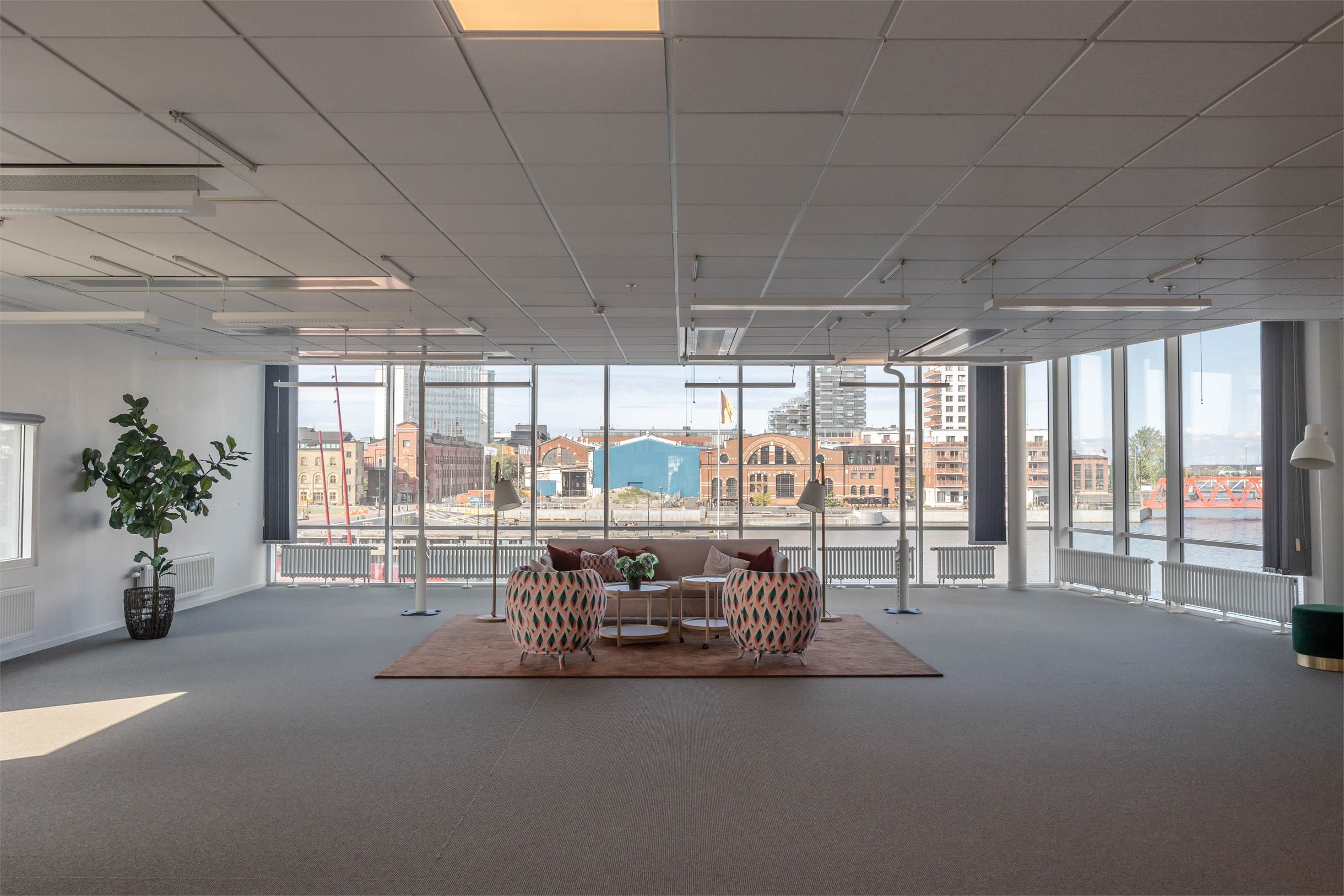 Välkommen till Bassängkajen 12, där arbetsmiljö möter stadspuls och vattnets lugn. Byggnaden består av två huskroppar på sju våningar, med stora golv-till-tak-fönster som släpper in ljuset och dagsljus långt in i lokalerna, samtidigt som de ramar in en av Malmös mest spektakulära utsikter.