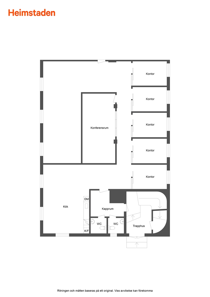 Lokalen är välplanerad och erbjuder en flexibel yta som består av fem kontorsrum, ett konferensrum, ett större öppet rum som lämpar sig för exempelvis kontorslandskap eller gemensam arbetsyta, samt ett modernt kök, kapprum och två toaletter.