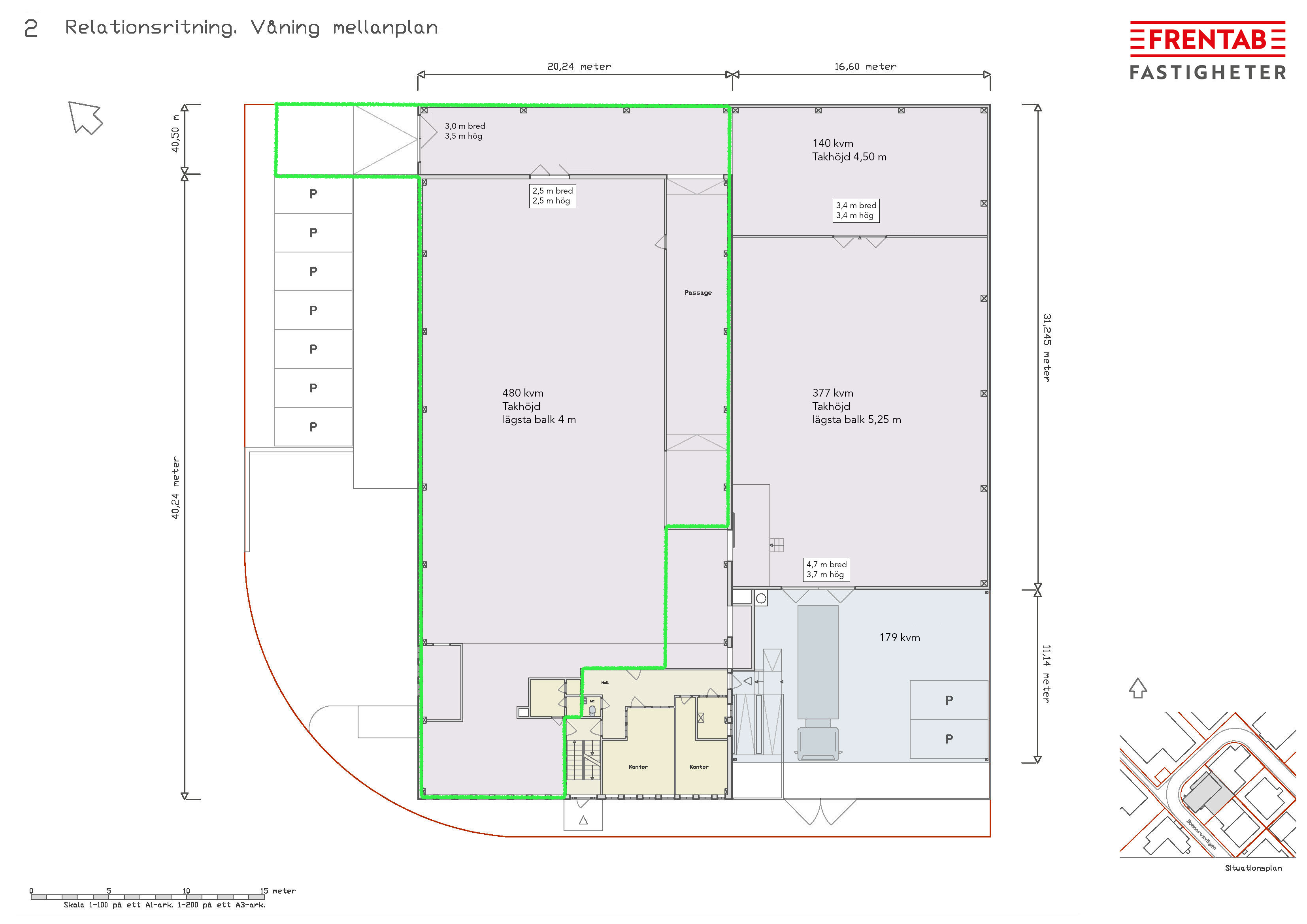 Kontorsdelen uppgår är fördelad på mellanplan och övre plan. Här finns flera kontorsrum samt bl.a gemensamma funktioner såsom fikarum/pentry och WC, med direkt koppling till verksamhetsytorna via intern trappa. Kontoren är tydligt avskilda från industridelen men samtidigt nära integrerade för effektiv daglig drift.