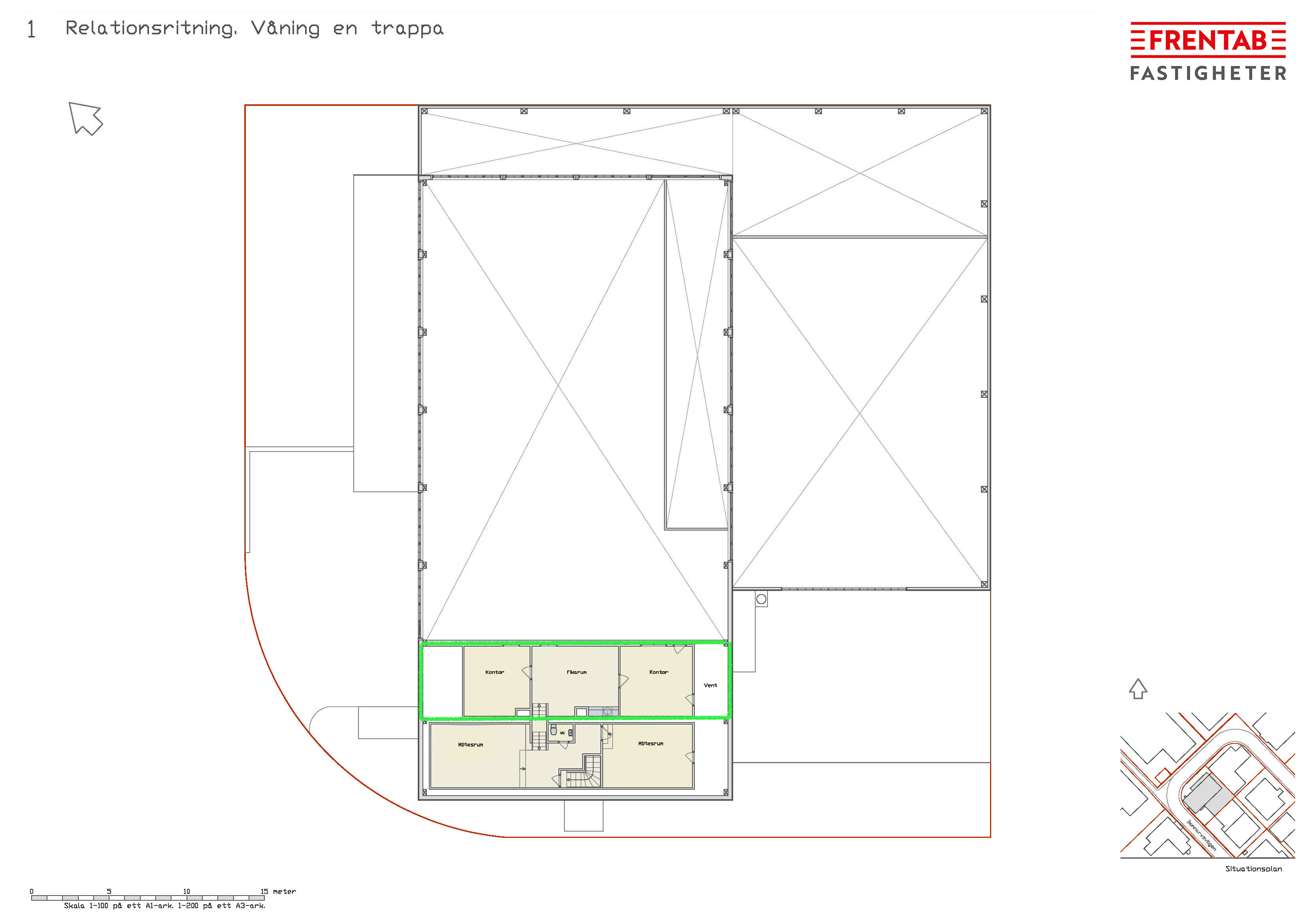 Sammantaget erbjuder planlösningen en funktionell kombination av generösa verksamhetsytor och en sammanhållen kontorsdel, med tydlig zonindelning och god överblick.