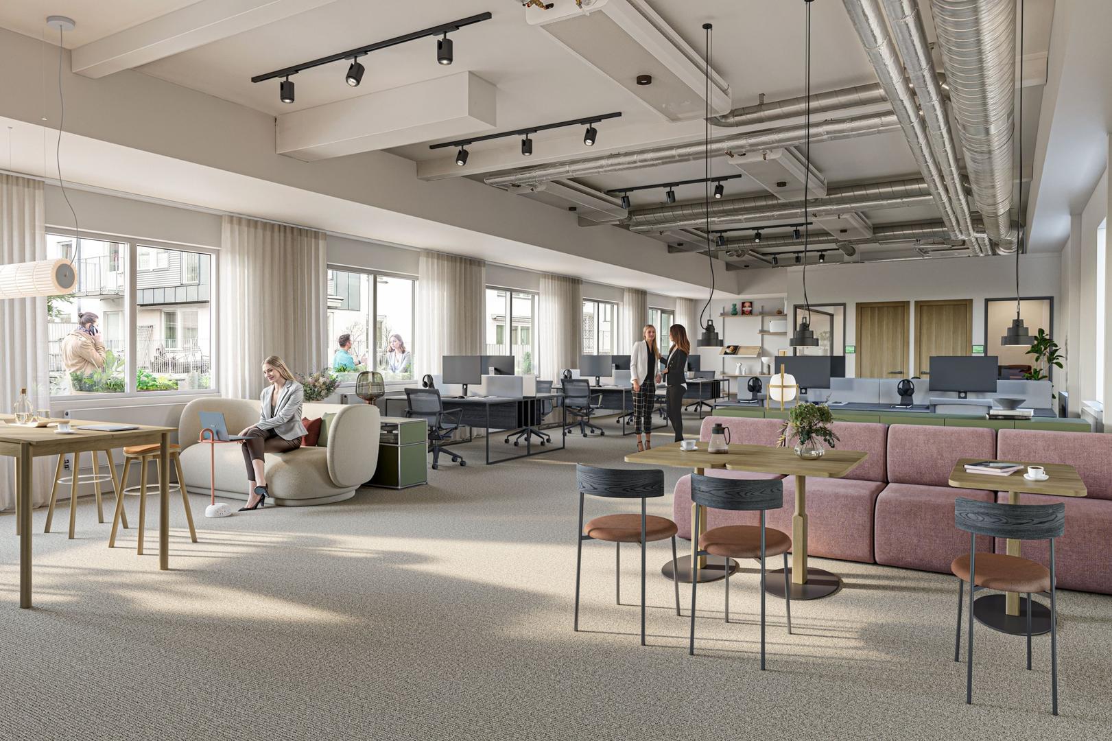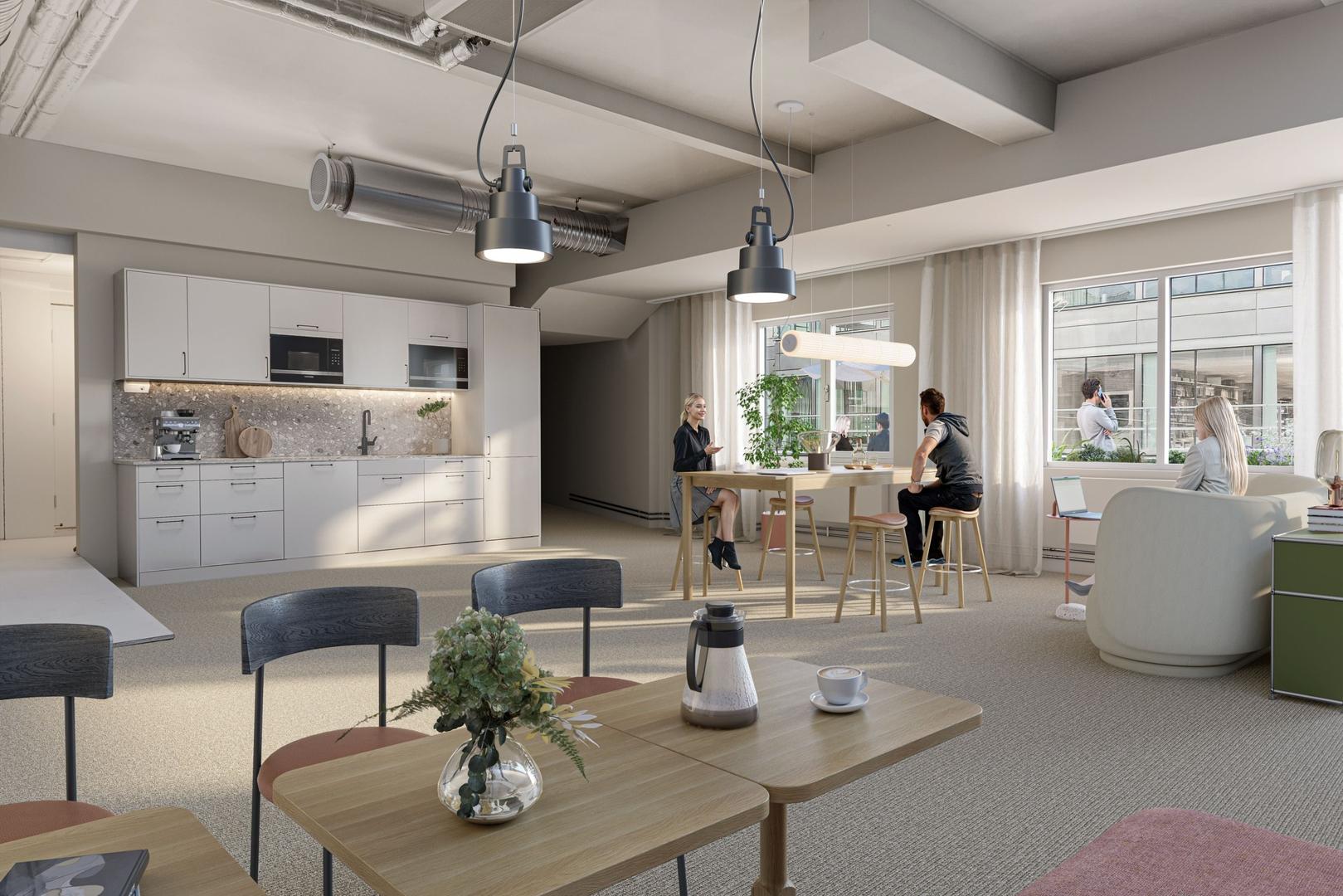Högst upp i huset med fönster i två väderstreck badar lokalen i dagsljus. Lokalen är 197 kvm, men kan utökas till att bli 259 kvm och då få balkong.