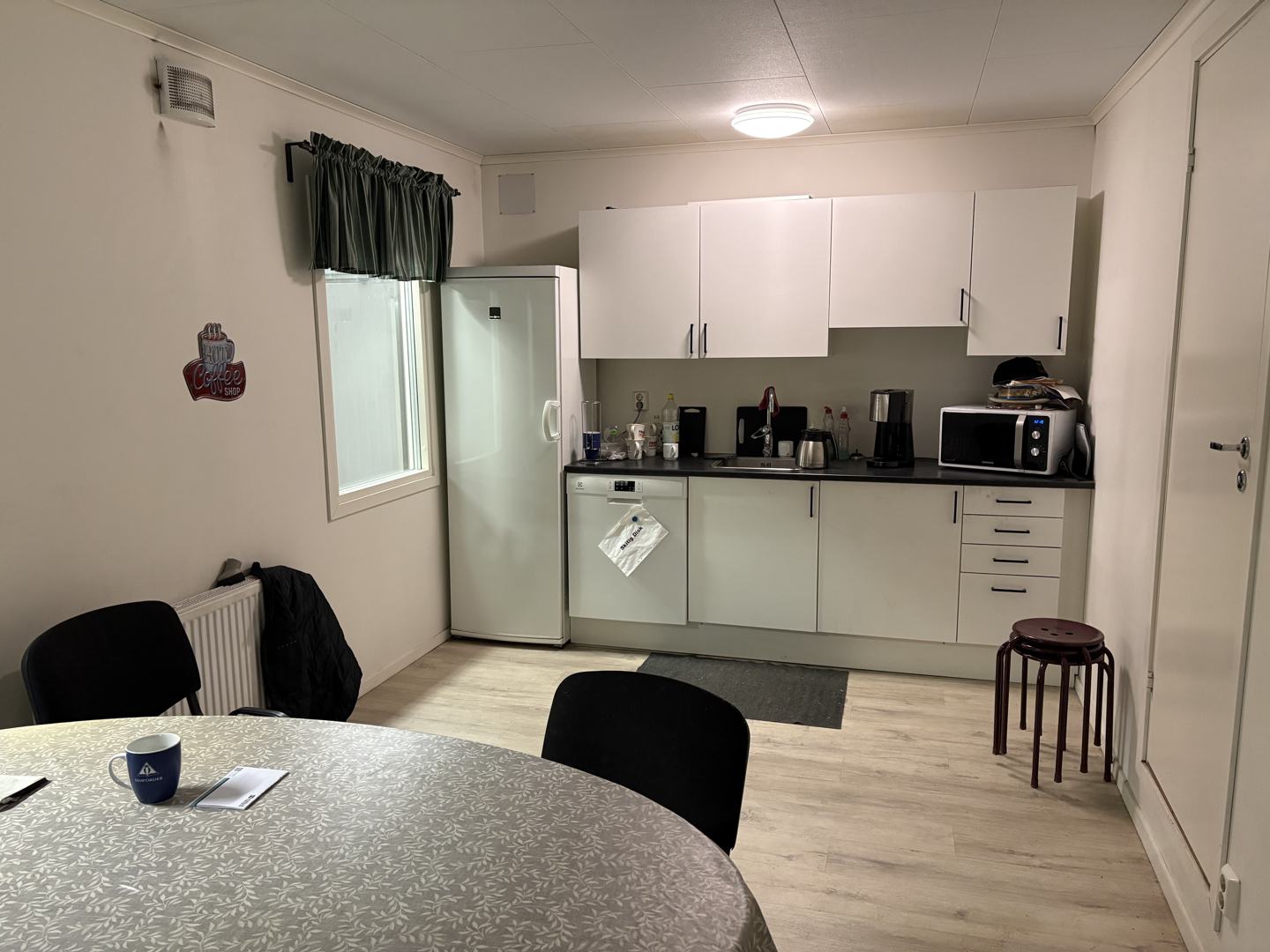 Praktisk verkstadslokal med tillhörande kontor och personalutrymmen.