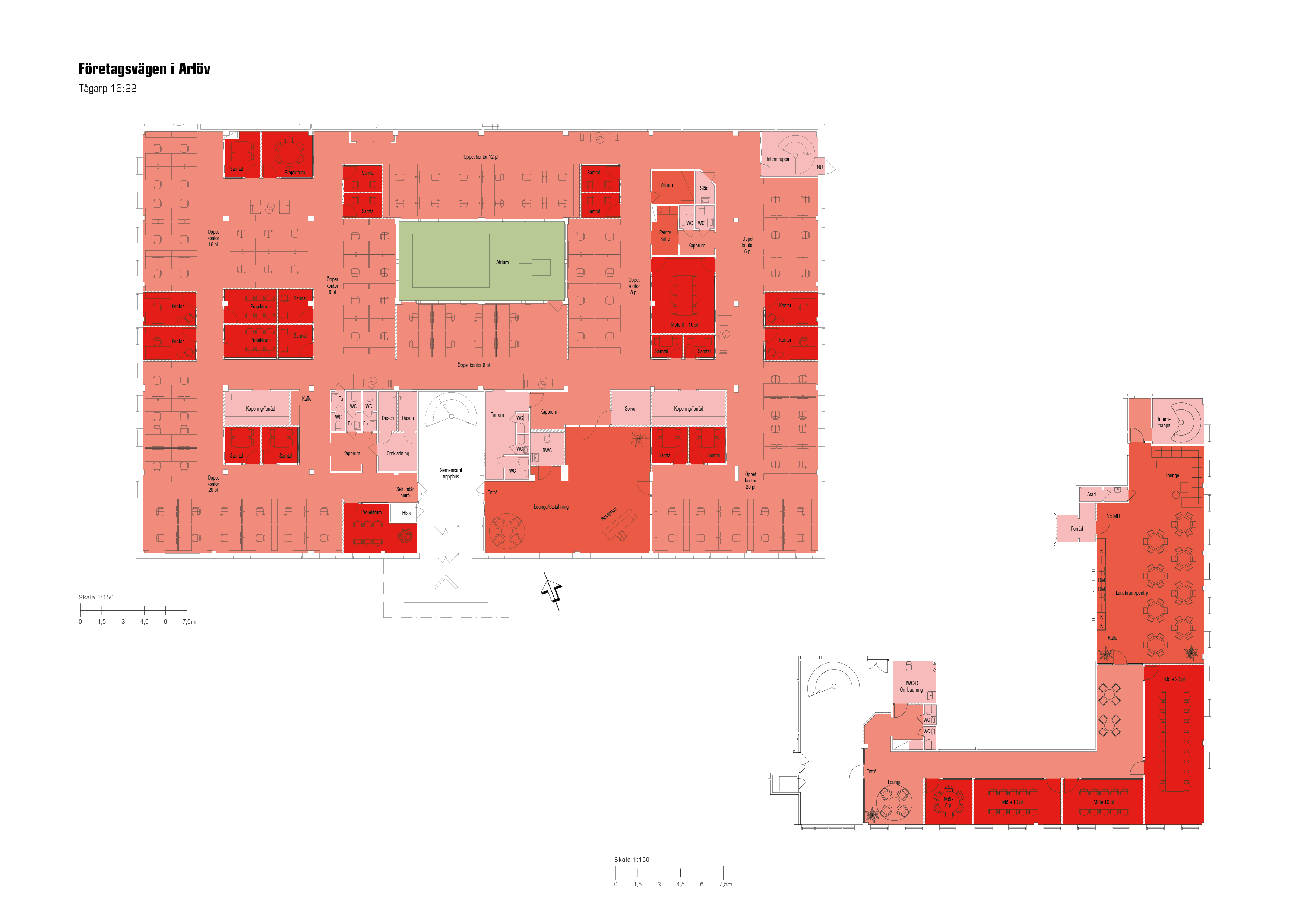 På nedre planet finns stora generöst tilltagna kontor både i öppna landskap och i cellkontor. På övre planet finns mötes- och konferensrum samt ett väl tilltaget kök med matsal.