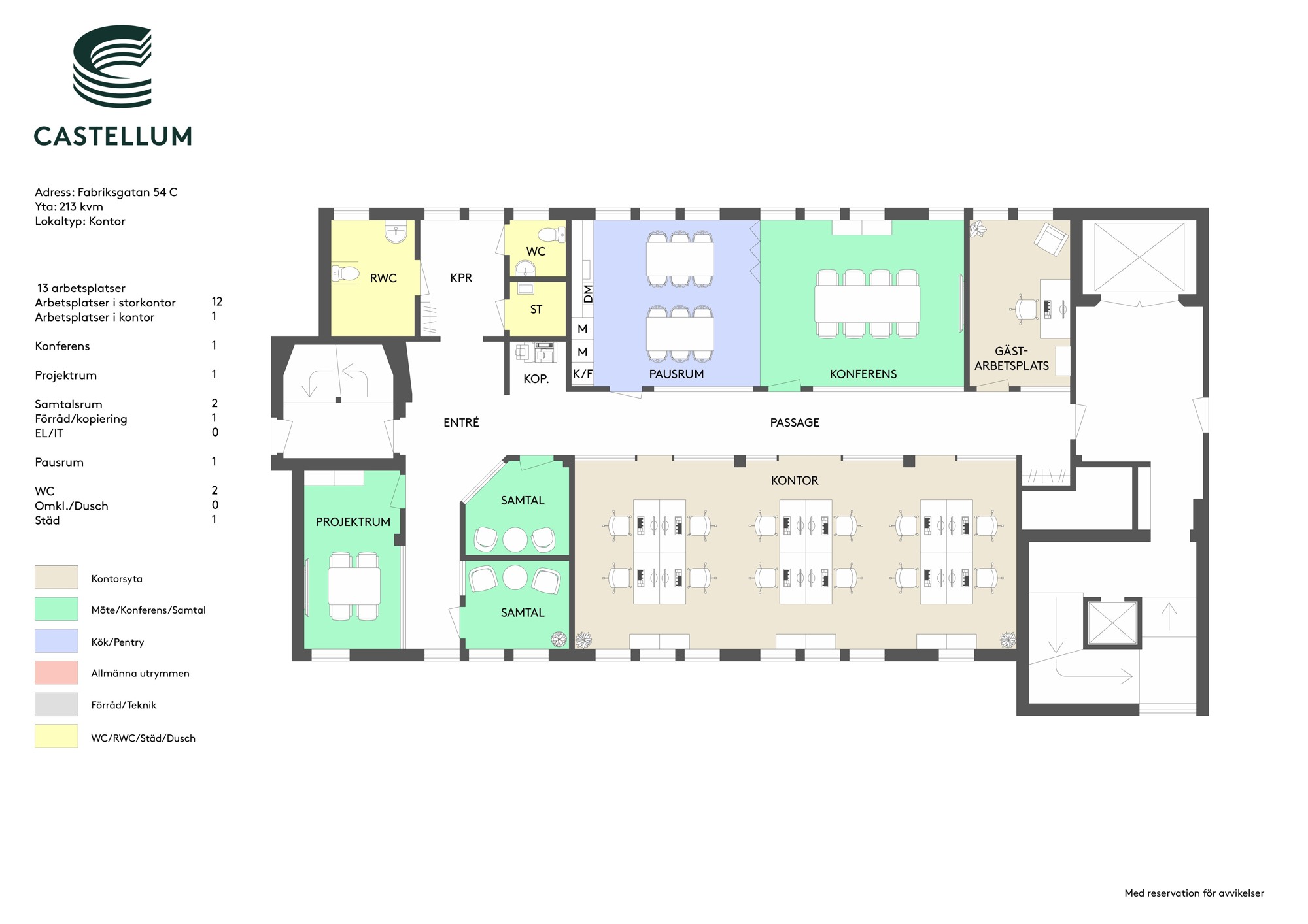 Planlösningen erbjuder er idag ett storkontor med flertalet arbetsplatser, två enskilda kontor, två samtalsrum och ett konferensrum.