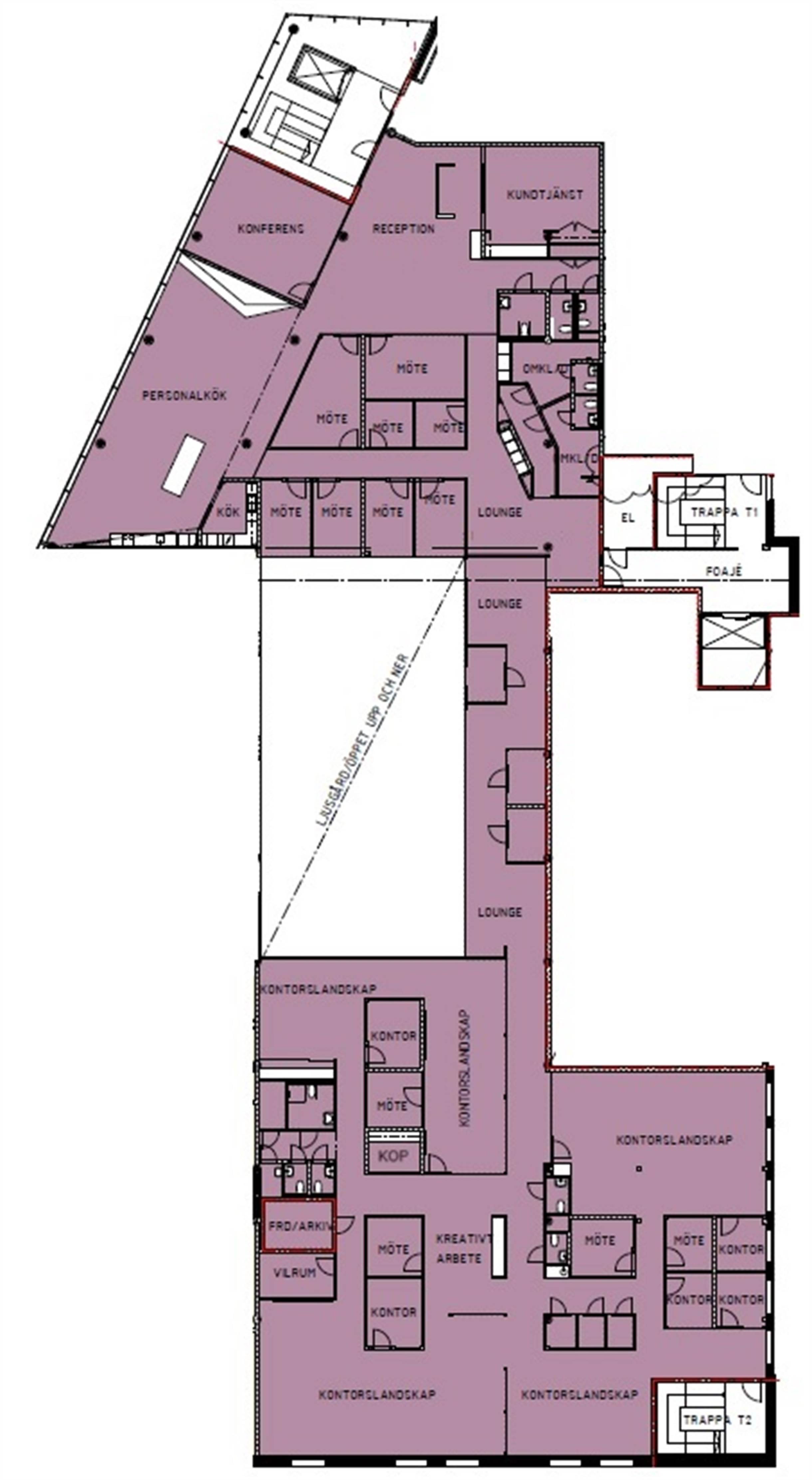 Blandad planlösning med både öppet landskap och enskilda kontorsrum. En främre mer representativ del med reception, kundtjänst, mötesrum och kök med lunchrum samt en bakre intern del för arbetsplatser, fler mötesrum, telefonrum med mera. Se bild med planlösning.