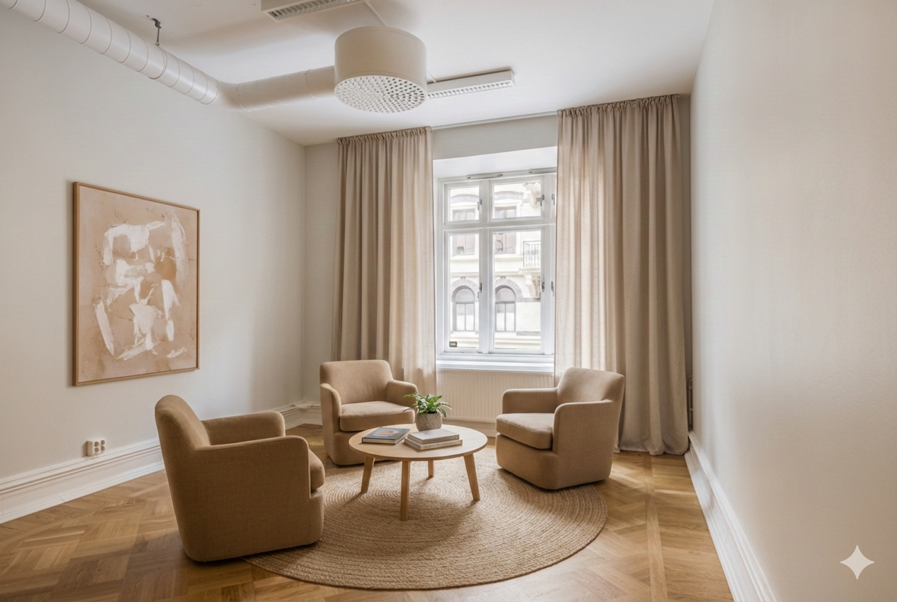 Denna fantastiska lokal erbjuder en unik kombination av historisk charm och moderna funktioner, perfekt för en verksamhet som söker både stil och flexibilitet. Lokalen är fördelad på tre stora rum, alla med generösa takhöjder och vackra stuckaturer som ger en känsla av elegans och rymd. Här får du en inspirerande och ljus arbetsmiljö, där de klassiska detaljerna möter funktionell design.