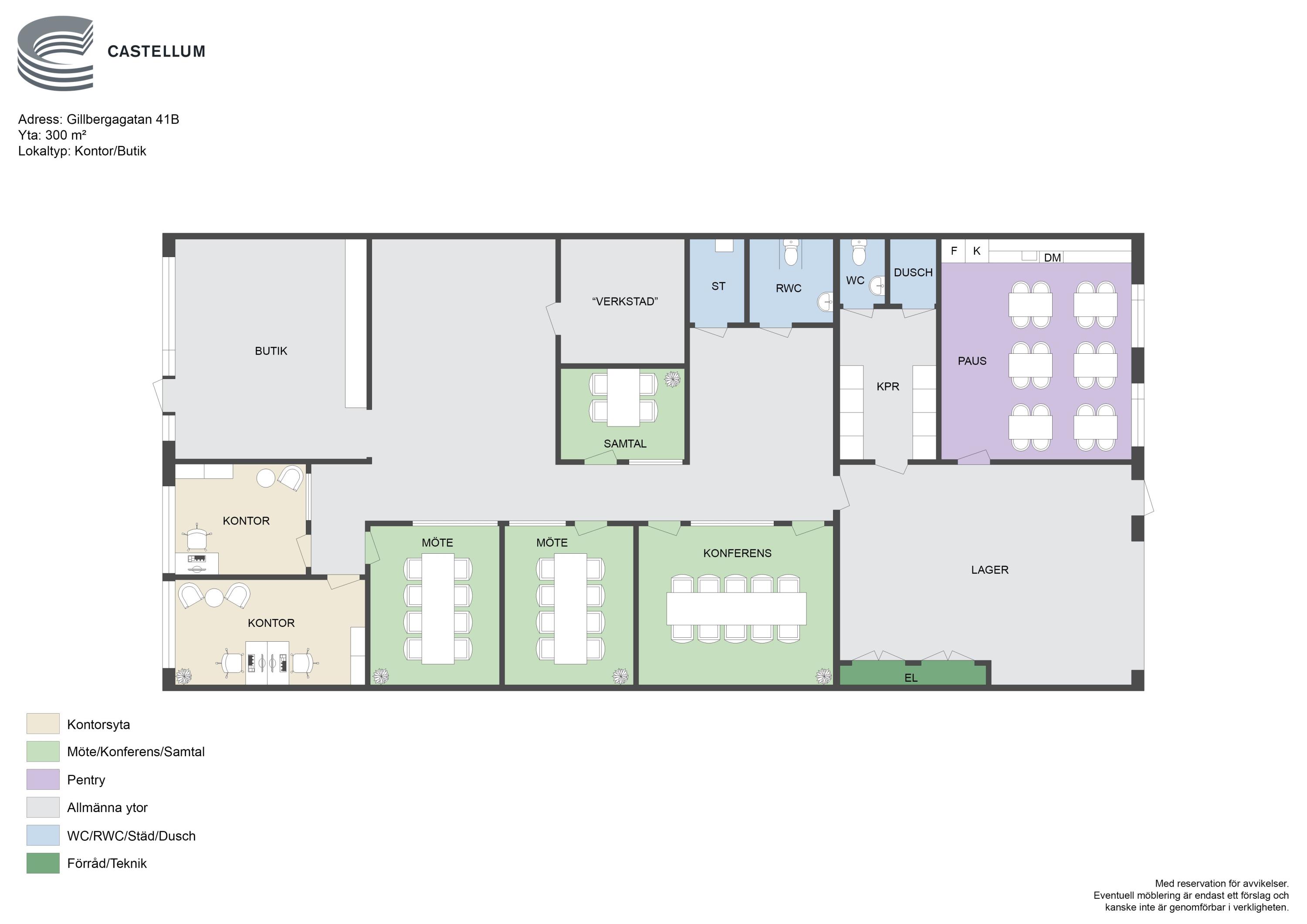 Stor butiksyta direkt vid ingången för mottagning av kunder eller exponering av produkter. I anslutning till denna finns gott om utrymmen som kan nyttjas på olika sätt beroende på verksamhet. Kontor, mötesrum av olika slag, pentry och rymlig lageryta samsas om resterande ytor och här finns även flera toaletter inklusive en RWC samt dusch.