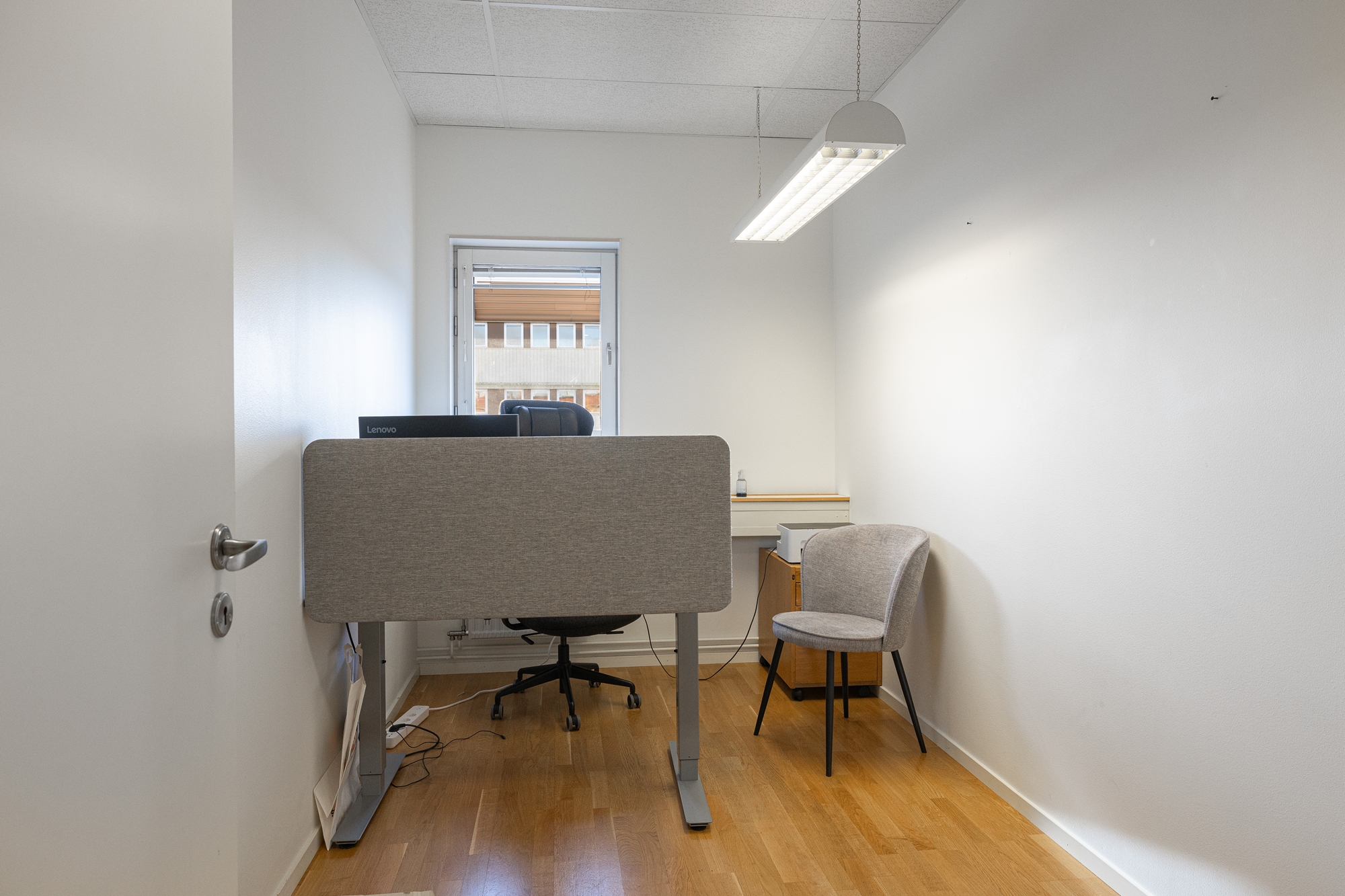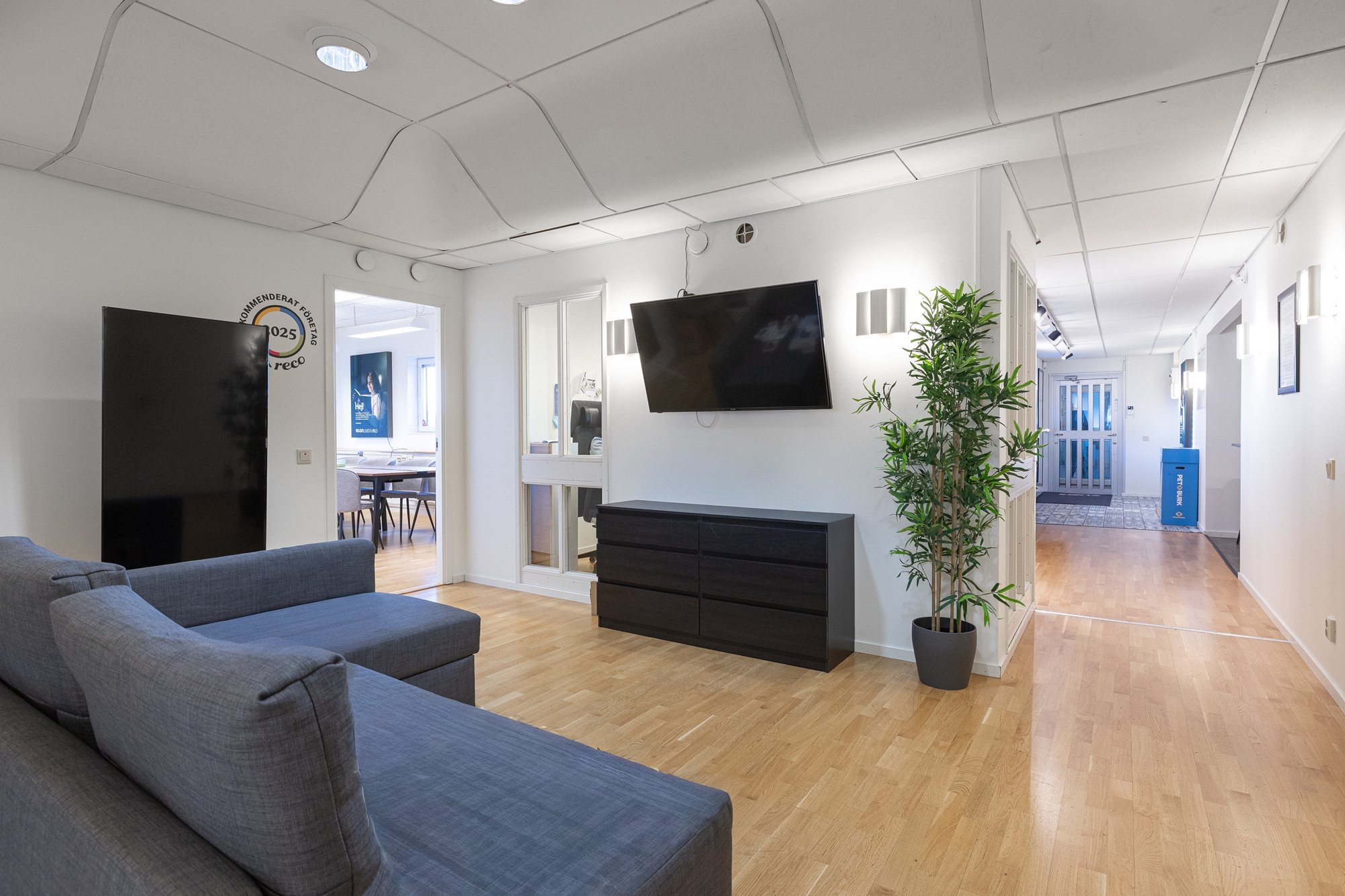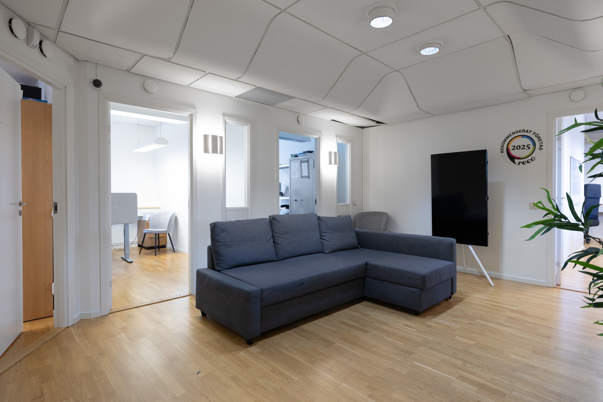 Lokalen har en genomtänkt planlösning som skapar en trivsam arbetsmiljö med gott om naturligt ljus från stora fönster.