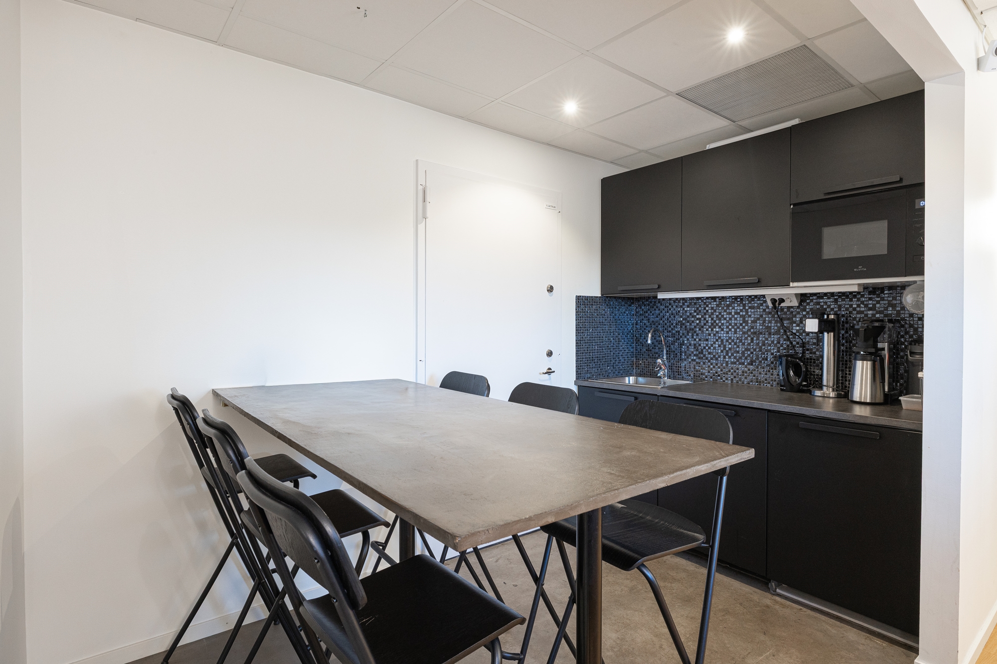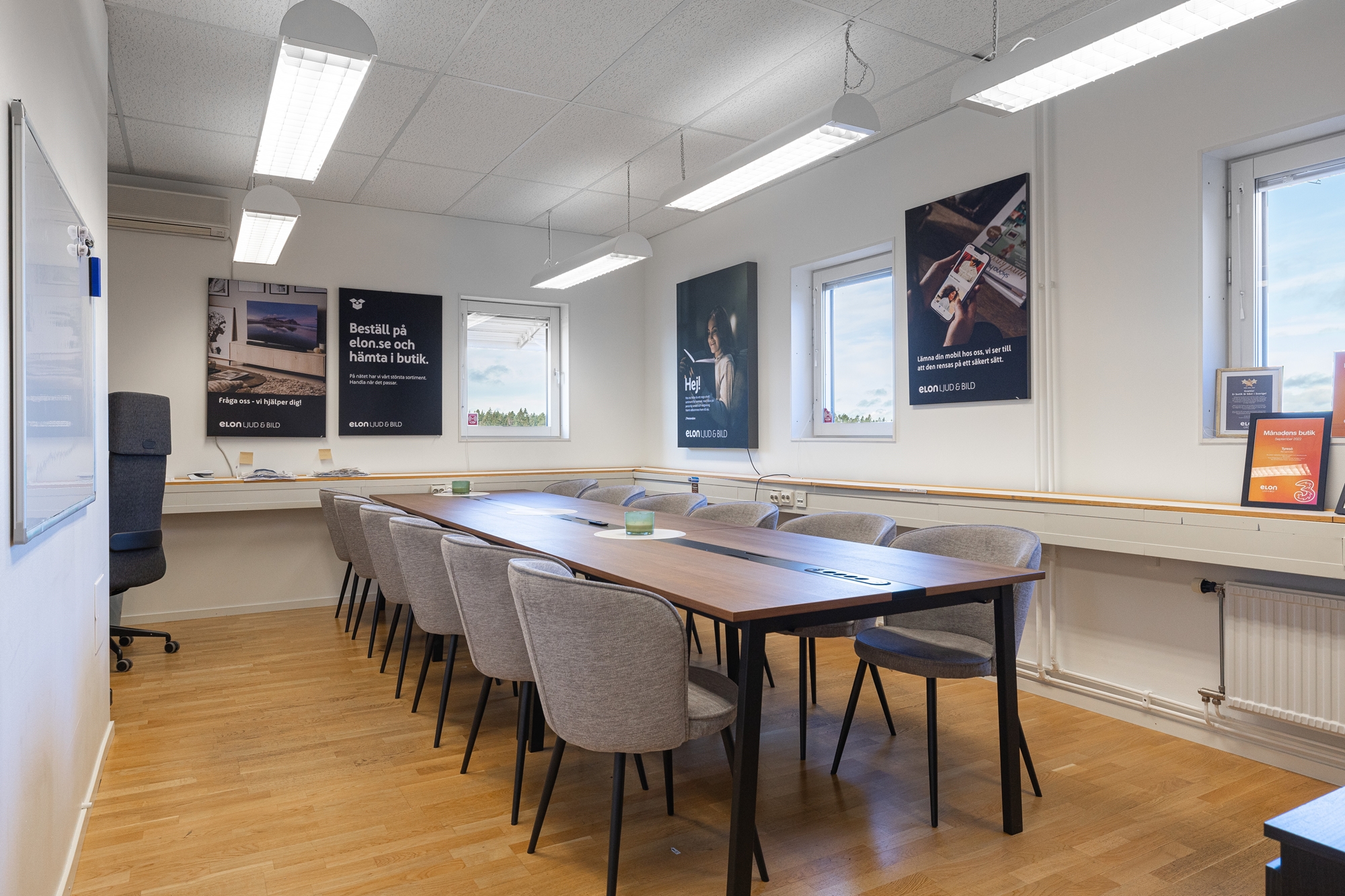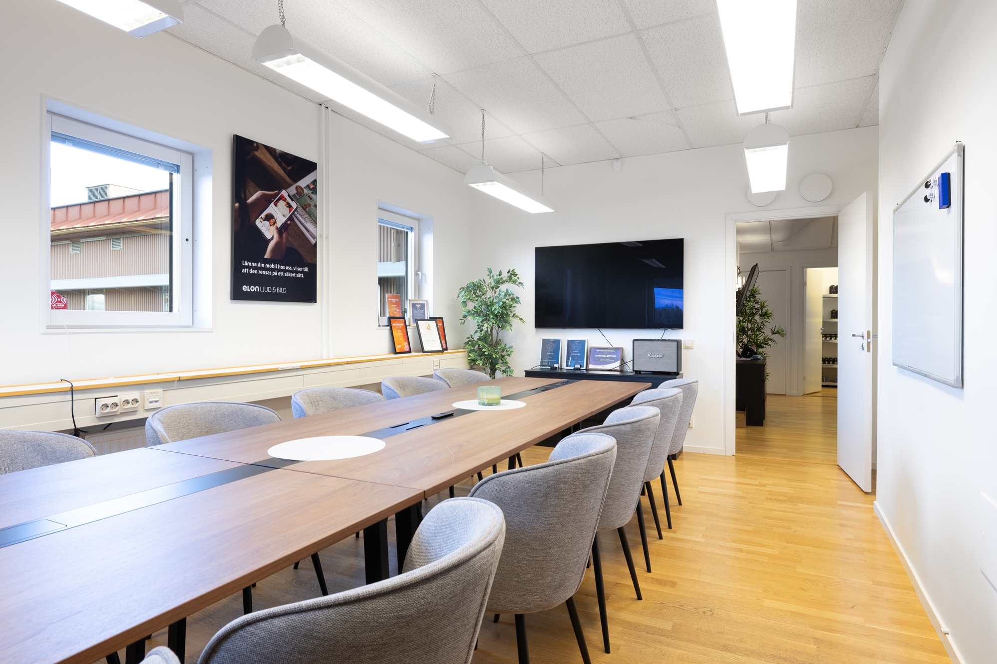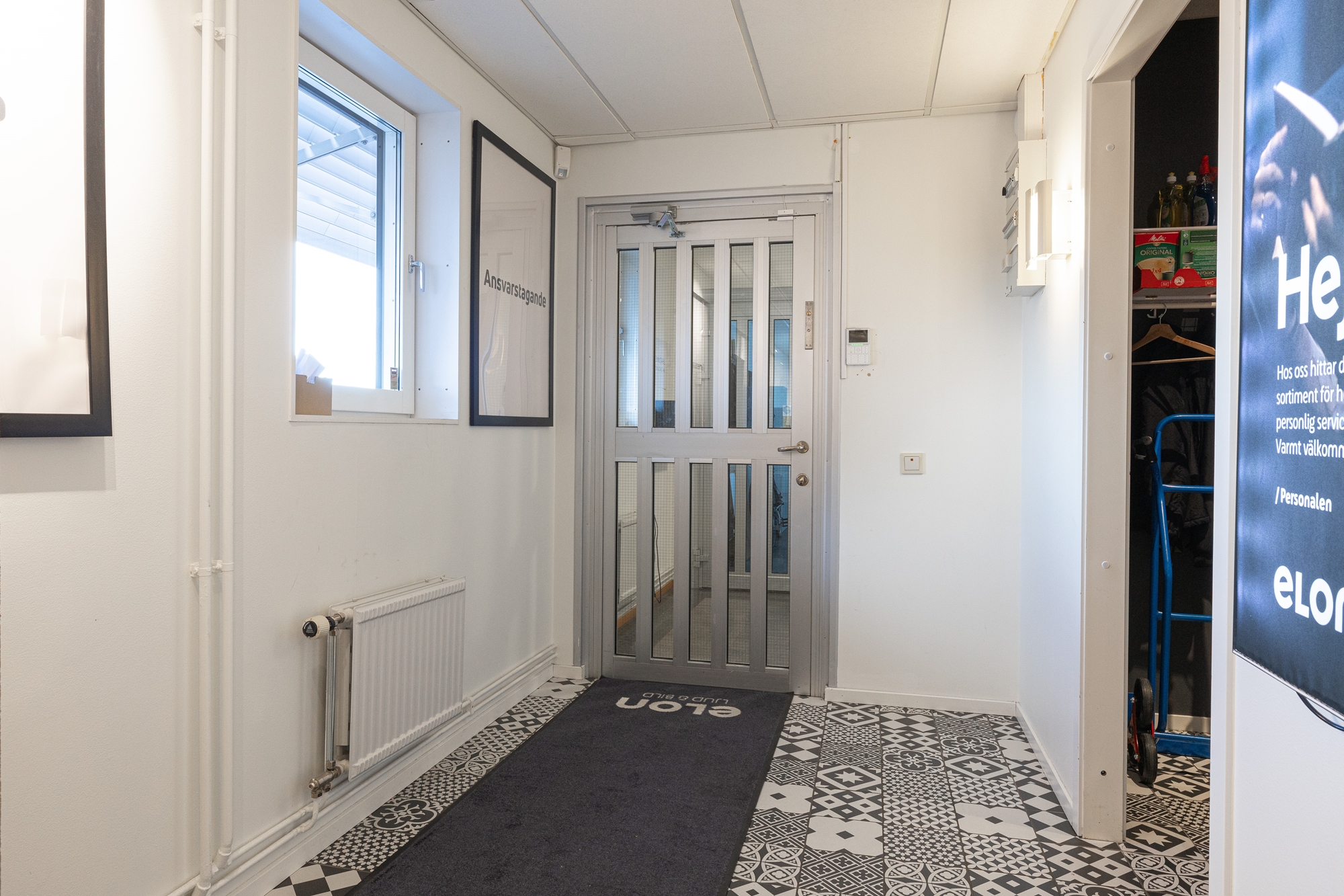 Lokalen har en genomtänkt planlösning som skapar en trivsam arbetsmiljö med gott om naturligt ljus från stora fönster.