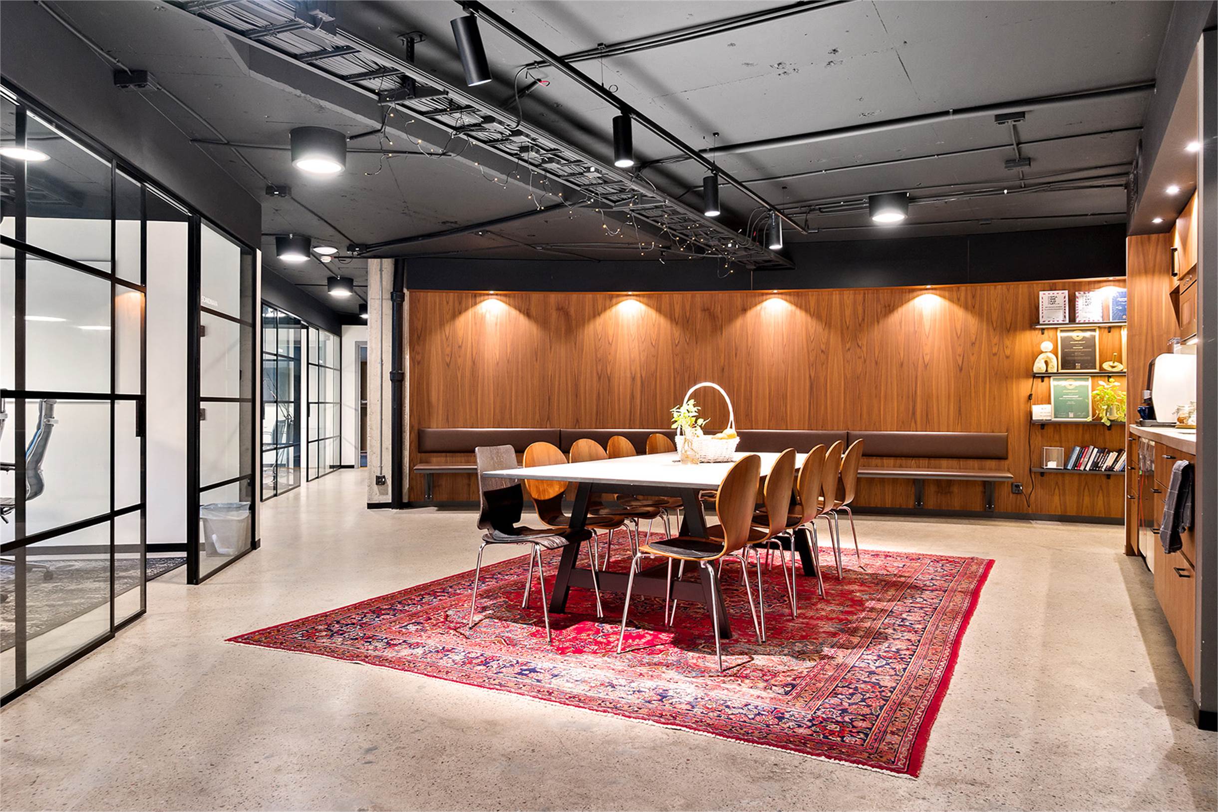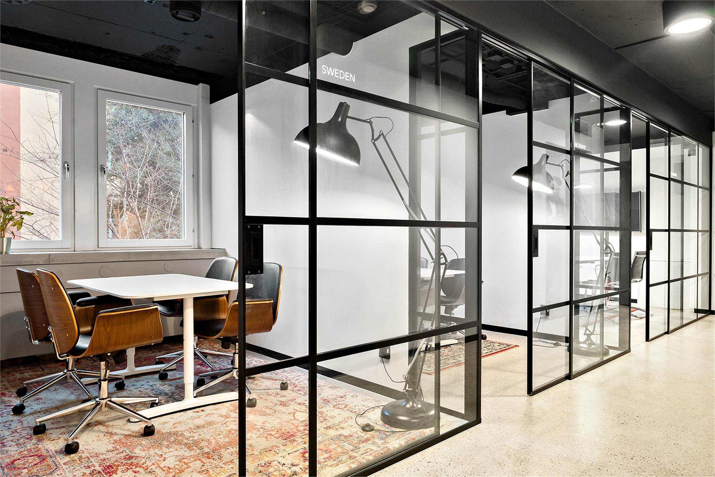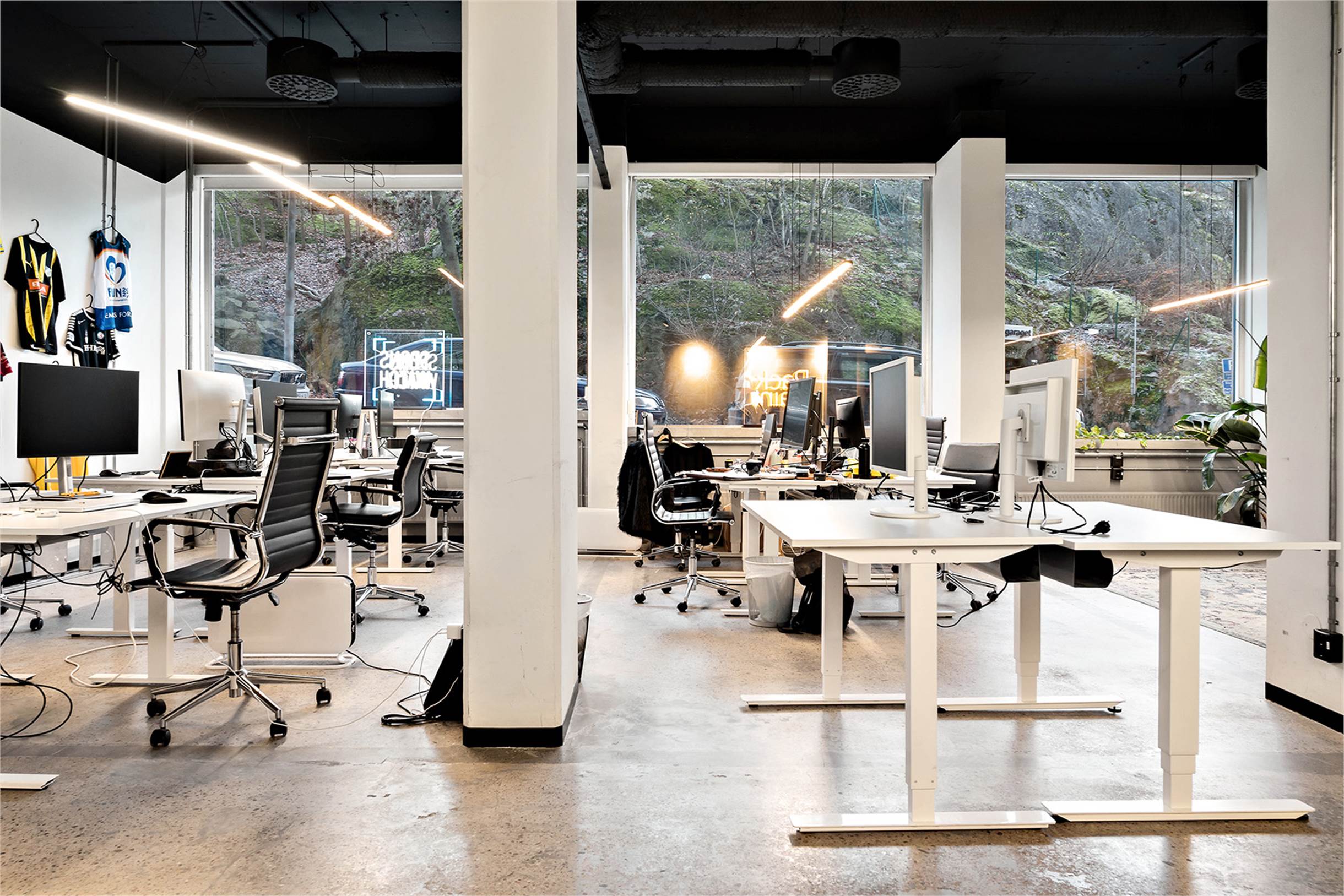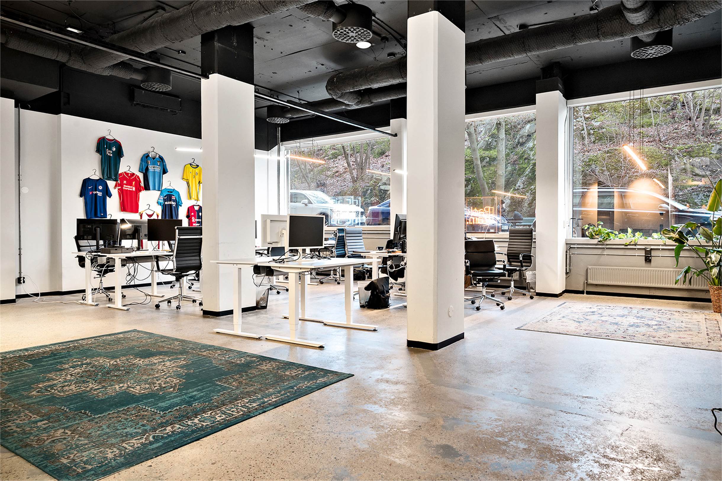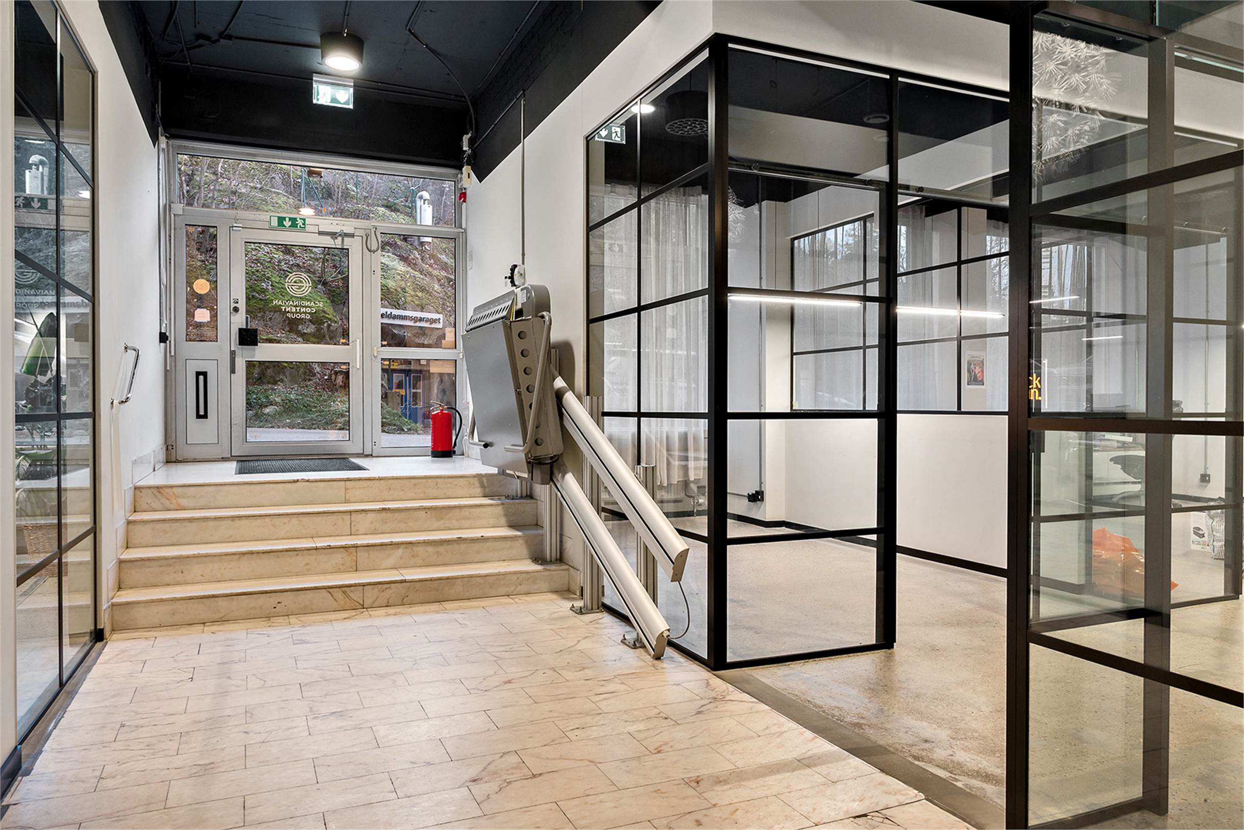 Ytorna utgörs av en öppen yta för exempelvis kontorslandskap. Här finns även fyra större kontor som är avgränsade med indusriglasväggar, dessa är i olika storlekar och flera har stora fönster ut mot gatan i sydvästligt läge. Mitt i lokalen finns ett jättefint kök med mörka luckor i trä, två diskmasknier, två dubbla kyl/frysskåp samt fyra integrerade microvågsugnar. Stor plats för matbord och en lång bänk längs ena väggen. I anslutning till köket i den bakre delen av lokalen finns det 4 konferensrum i olika storlek med plats för 4 till 8 personer. Alla dessa rum har fönster mot innergården. Ytteligare ett rum som kan vara såväl kontor som förråd finns längst in här. Sist men inte minst finns här sju stycken studiorum i olika storlek. Dessa passar perfekt för pod- eller ljudinspelning men även samtalsrum med ljudisolerade väggar och dörrar. Lokalen har även 4 toaletter varav det ena är ett större badrum med toa och dusch, detta är tillgänglighetsanpassat. Entrén är rymlig och fint placerad mitt i lokalen och utrustad med hissramp för rullstol.