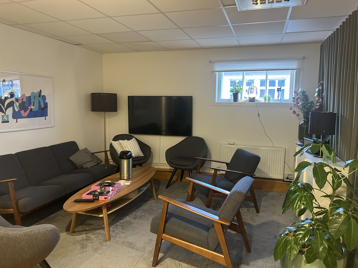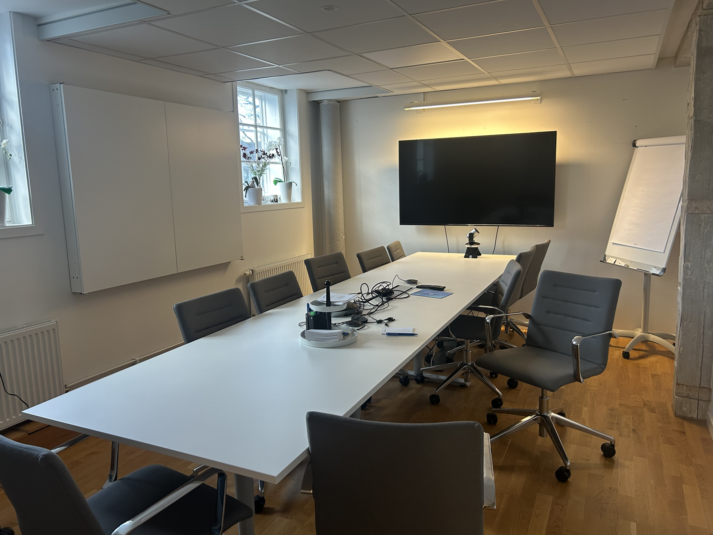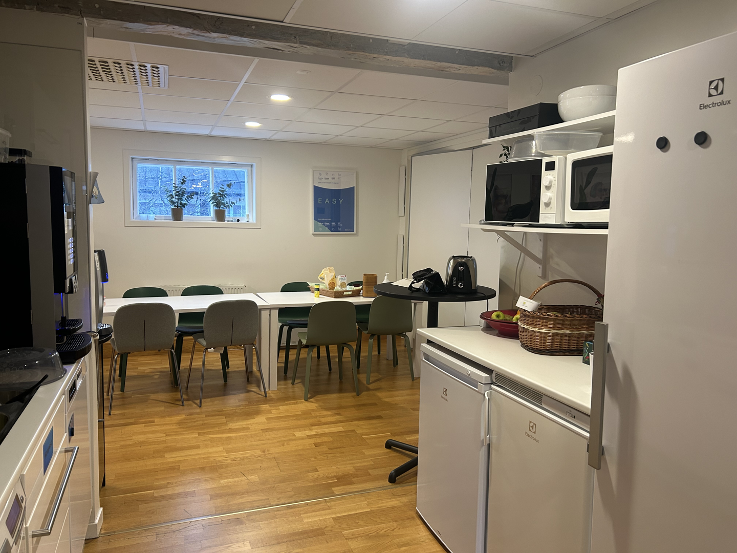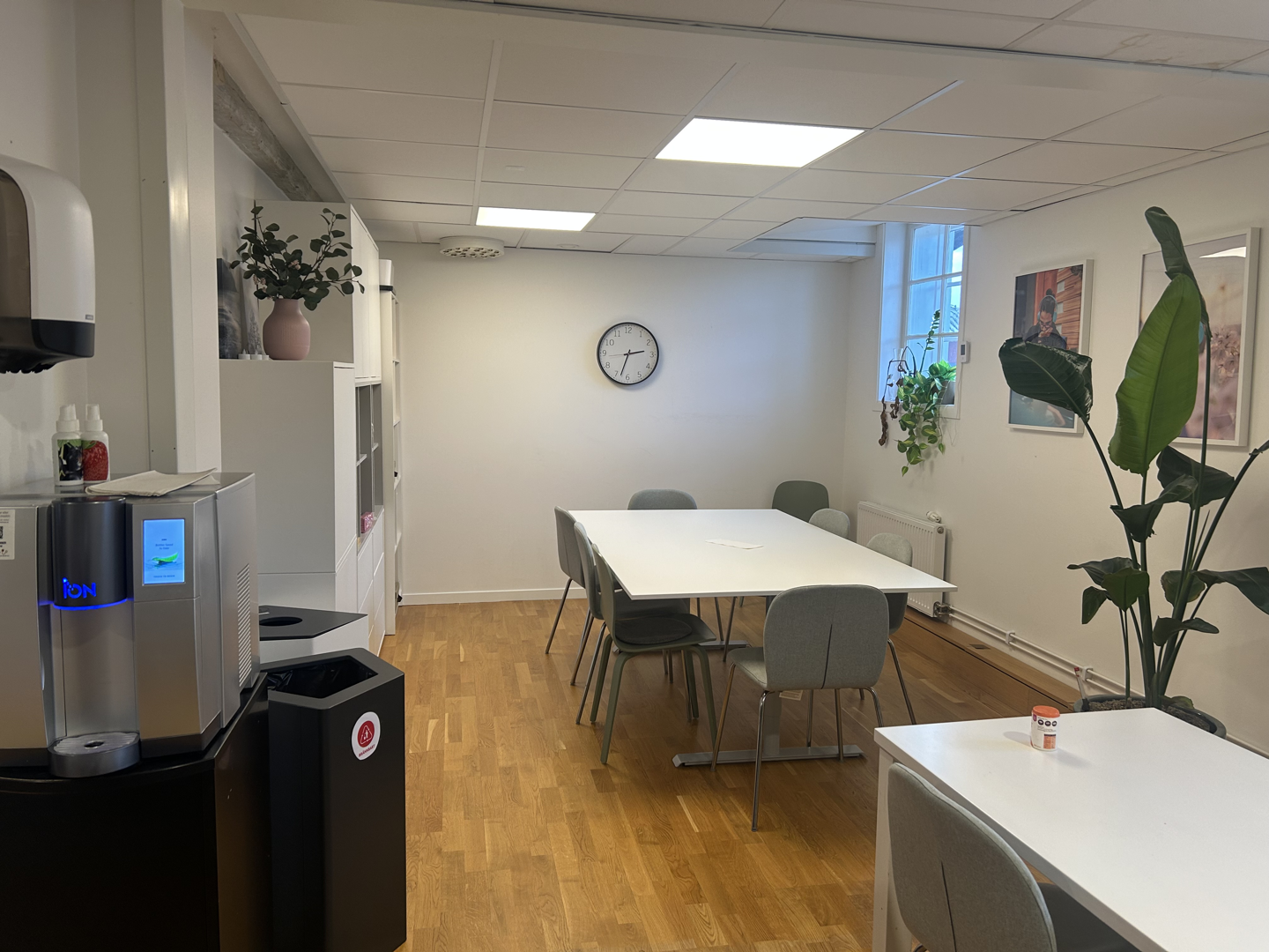 2 mindre kontorsrum samt 1 stort rum som rymmer plats för flera arbetsplatser. Stort fika/-konferensrum.