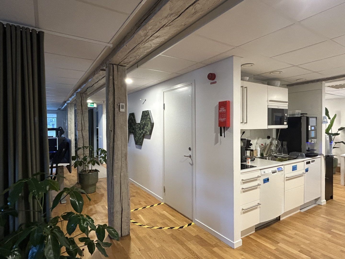 Modernt kontor med äldre charm med t ex synliga träbalkar.