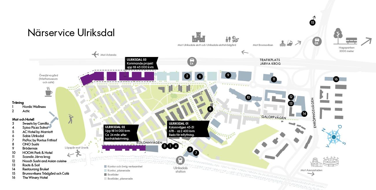 Ulriksdal har ett förmånligt läge med utmärkta kommunikationer både mot norr, söder och city samt omgiven av gröna stråk som Hagaparken som sträcker sig hela vägen in mot Norrtull och Ulriksdals GK som du ser från din arbetsplats. Ulriksdal är en levande stadsdel med en mix av boende, företag och service.