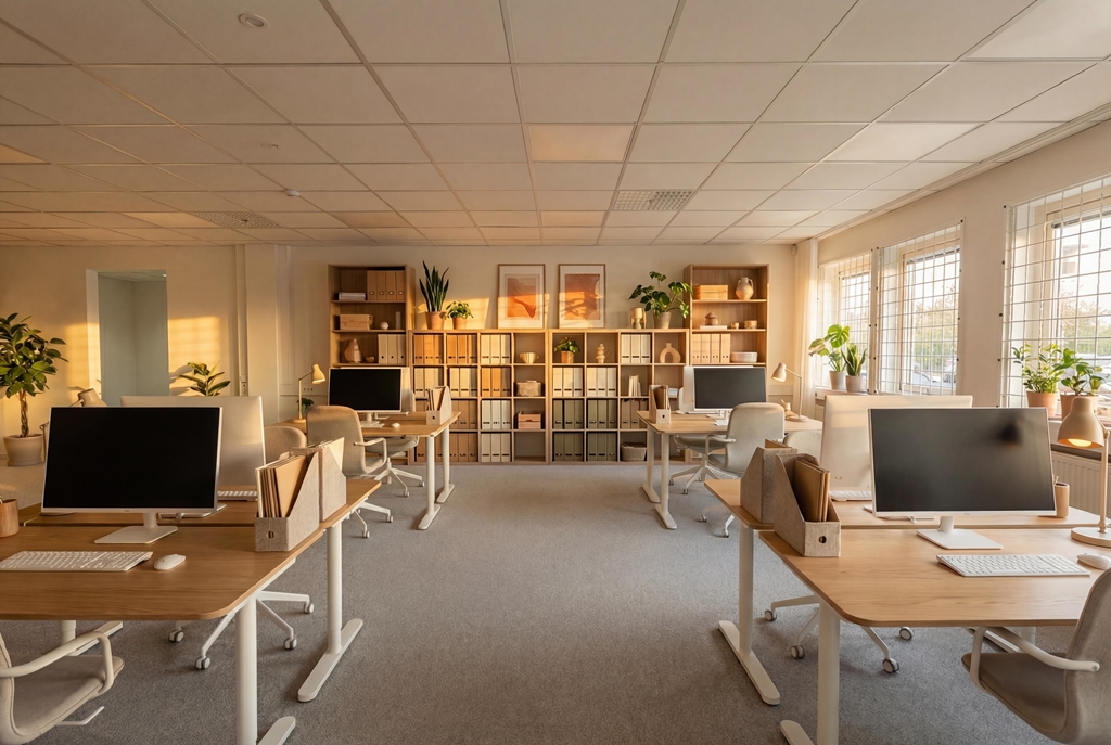 till största del öppet kontorslandskap med tillhörande lagerdel