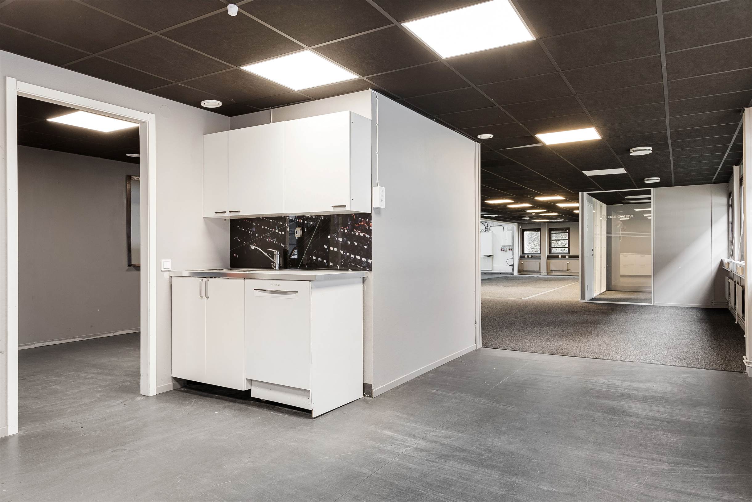 Kontorsdelen om 190 kvm rymmer både öppna arbetsytor och mindre kontorsrum samt kompletta faciliteter såsom pentry, omklädningsrum och WC.