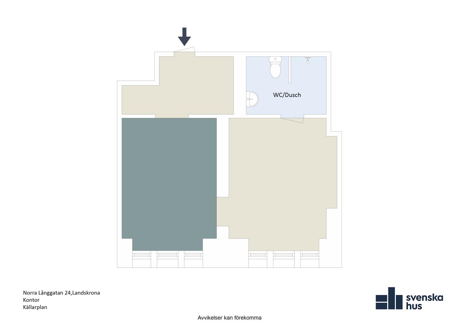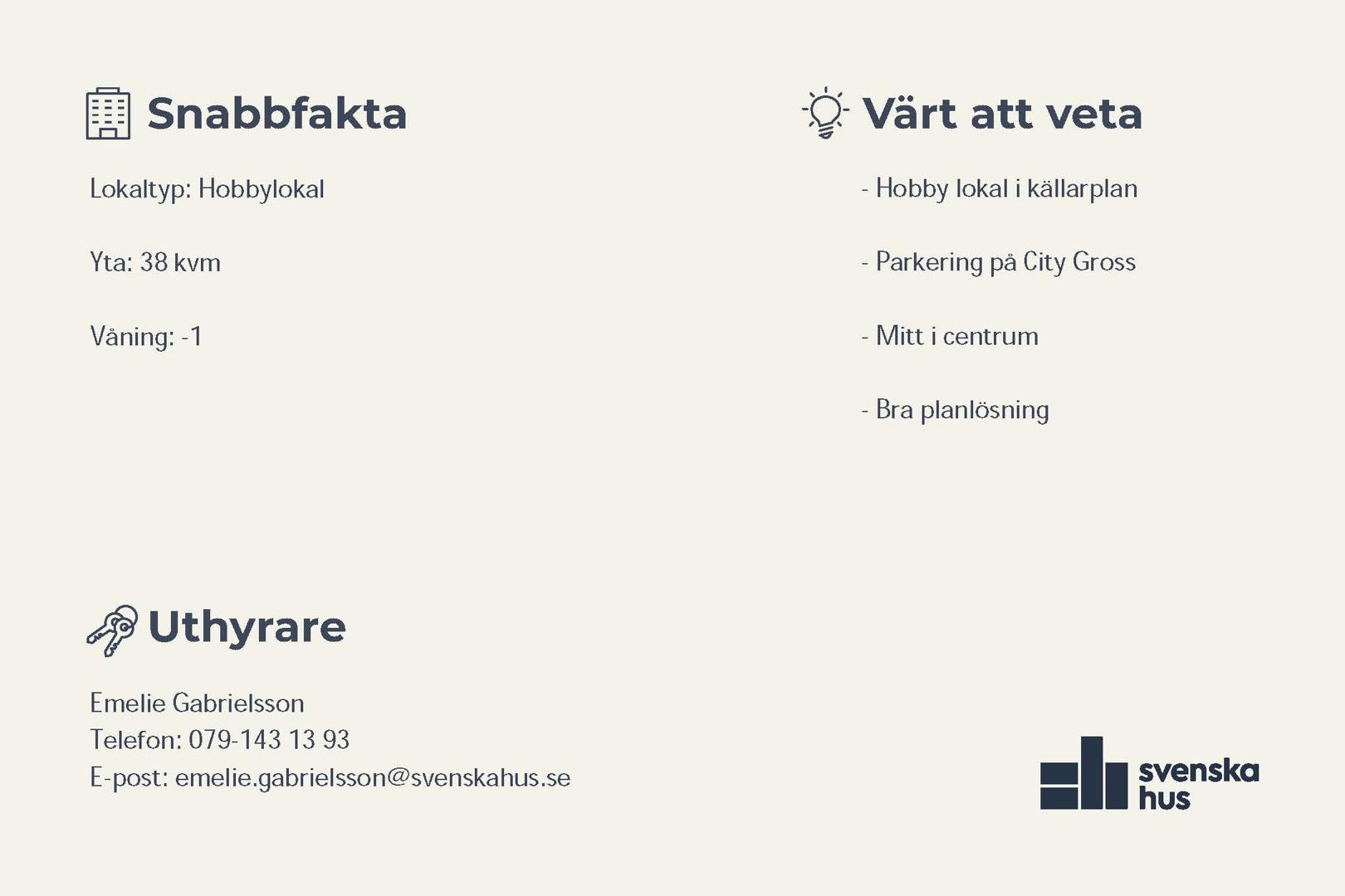 Lokal om 38kvm belägen i källarplan. Målad i vitt med vist ljusinsläpp från mindre fönster mot gatan. Lokalen har en enklare standard och lämpar sig väl som hobbylokal, förråd eller verkstads yta. Tillgång till WC finns i lokalen.
