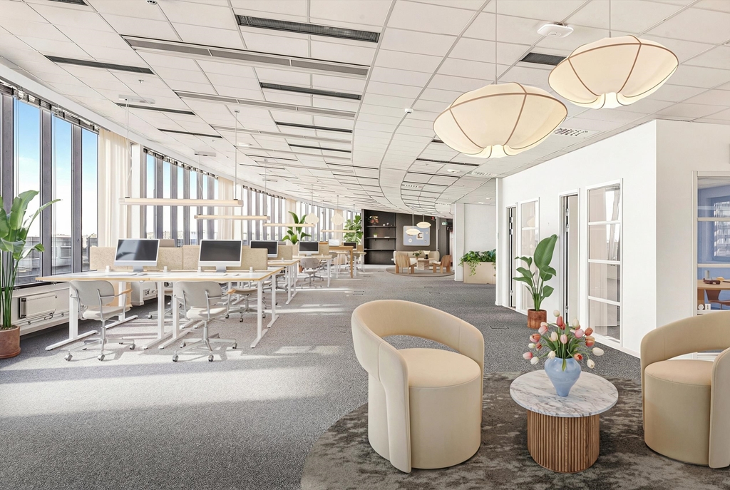 Huvudsakligen öppna ytor, mötesrum och samtalsrum samt pentry med matsal.