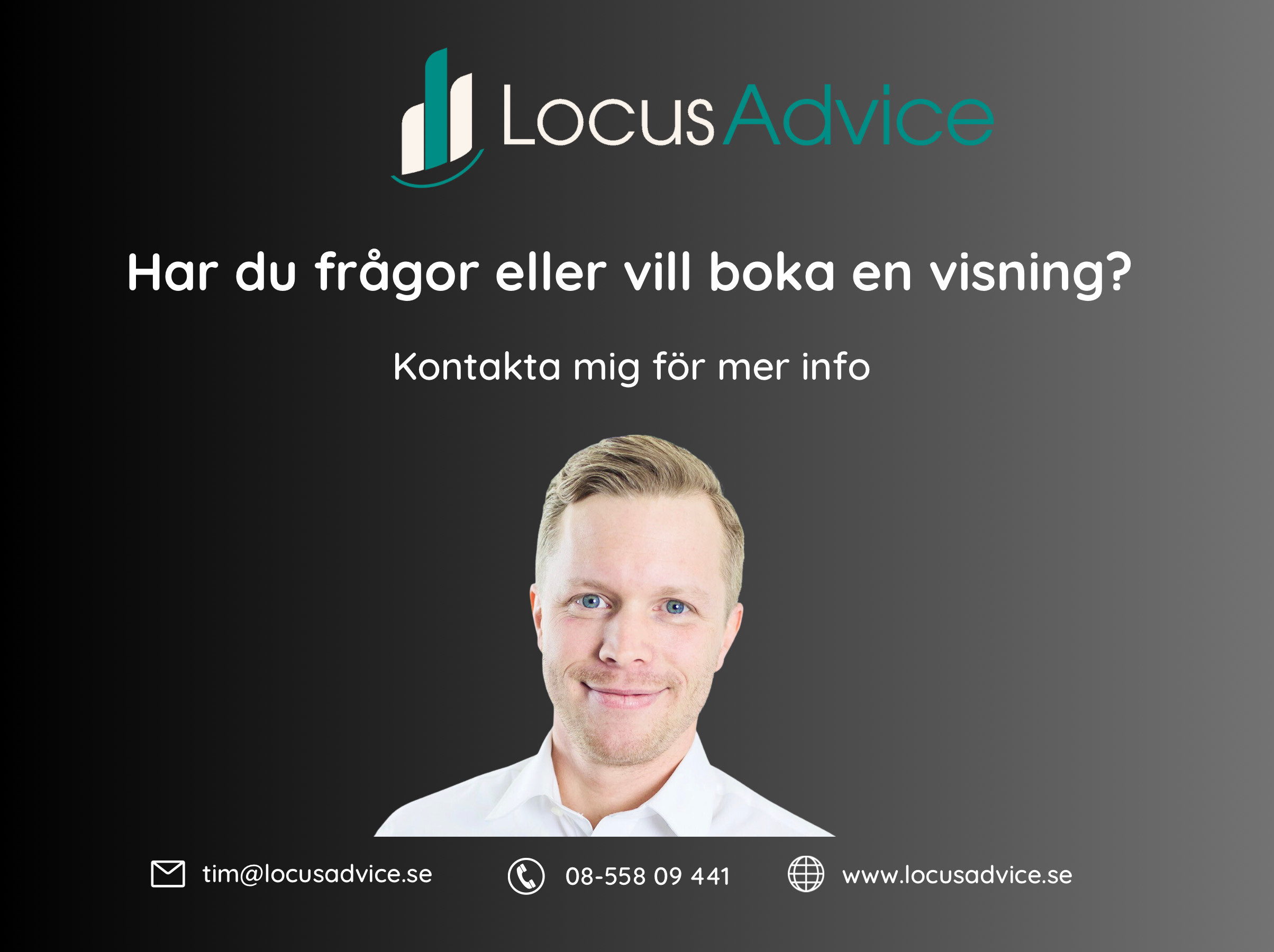 För mer information eller visning av objektet, hör av er till Locus Advice genom kontaktformuläret eller ring Tim Ringdahl Liljegren på tel 08-558 094 41.