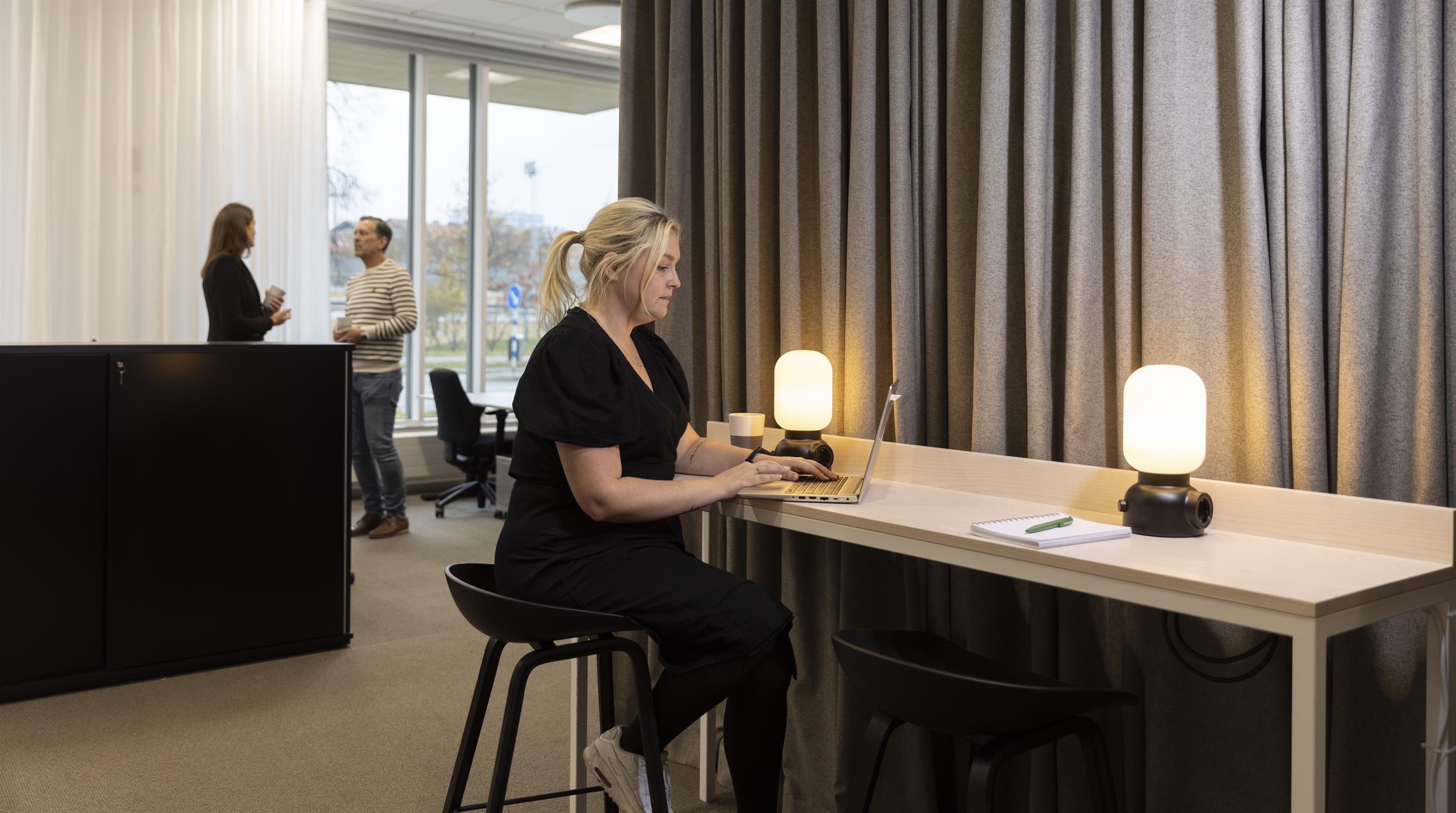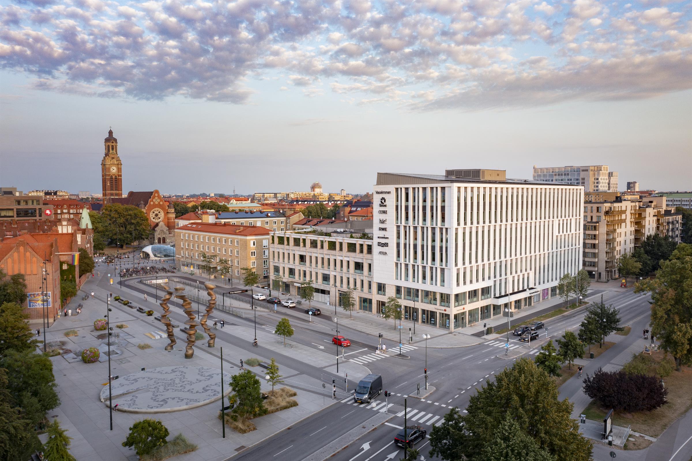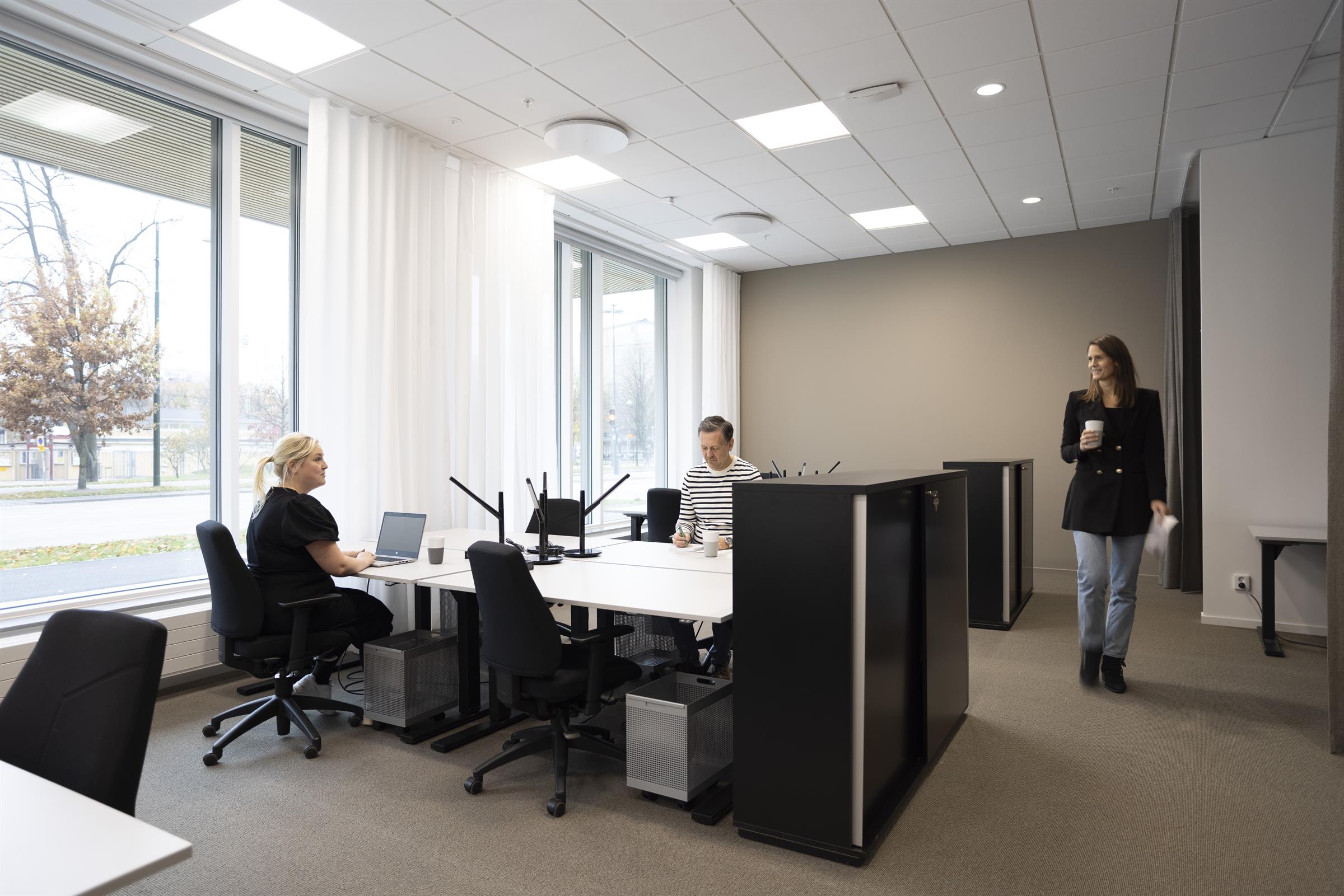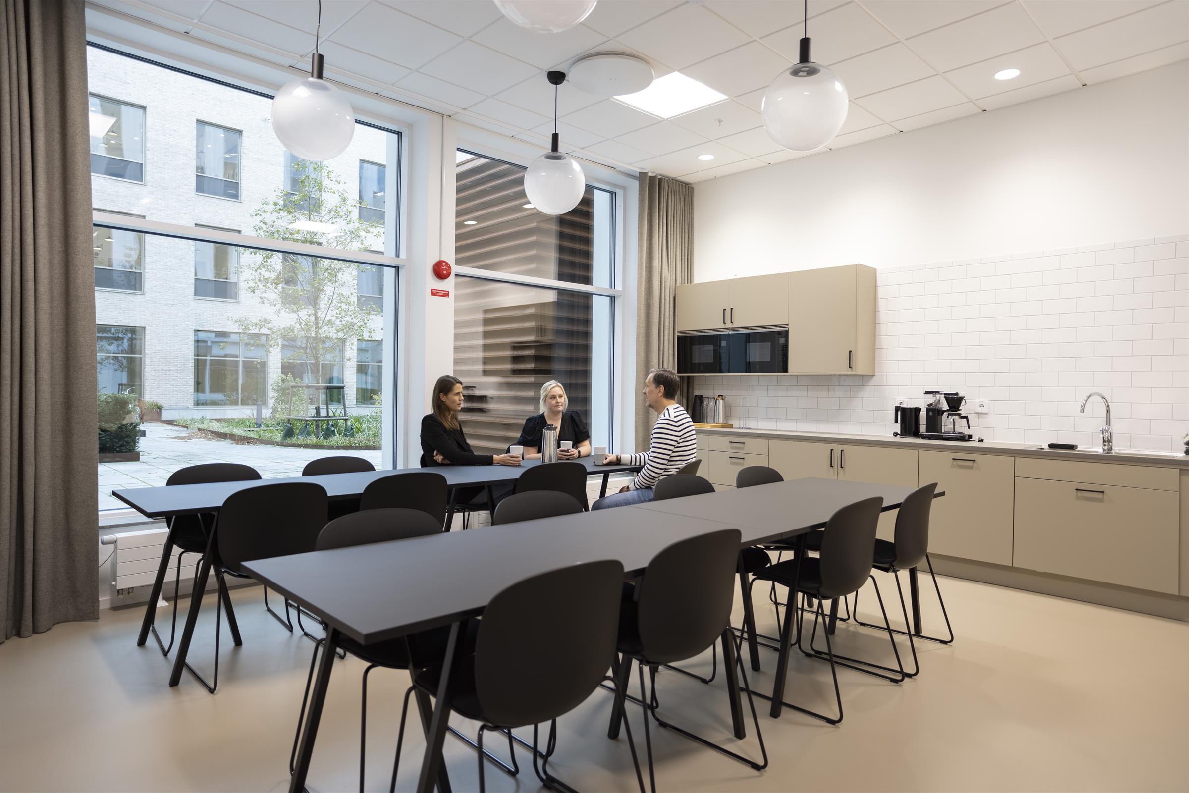 Pentry med matplats, ljusa ytskikt och stora fönster mot innergård Arbetsplatser i öppen yta med bra ljusinsläpp. Utsikt över Triangeln med S:t Johannes kyrka. Loungeyta för informella möten och pauser. Arbetsrum i kontorslandskapet med fint ljusinsläpp. Mötesrum med bord och skärm för effektiva möten. Arbetsplatser med lugn och avskild känsla Mindre arbets- eller fokushörna med varm belysning Samtalsrum med rund sittgrupp. Presentation med ritning