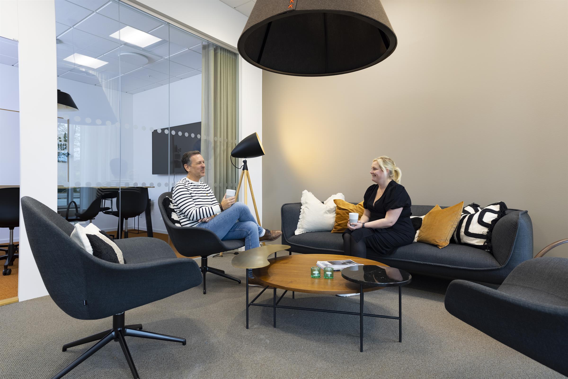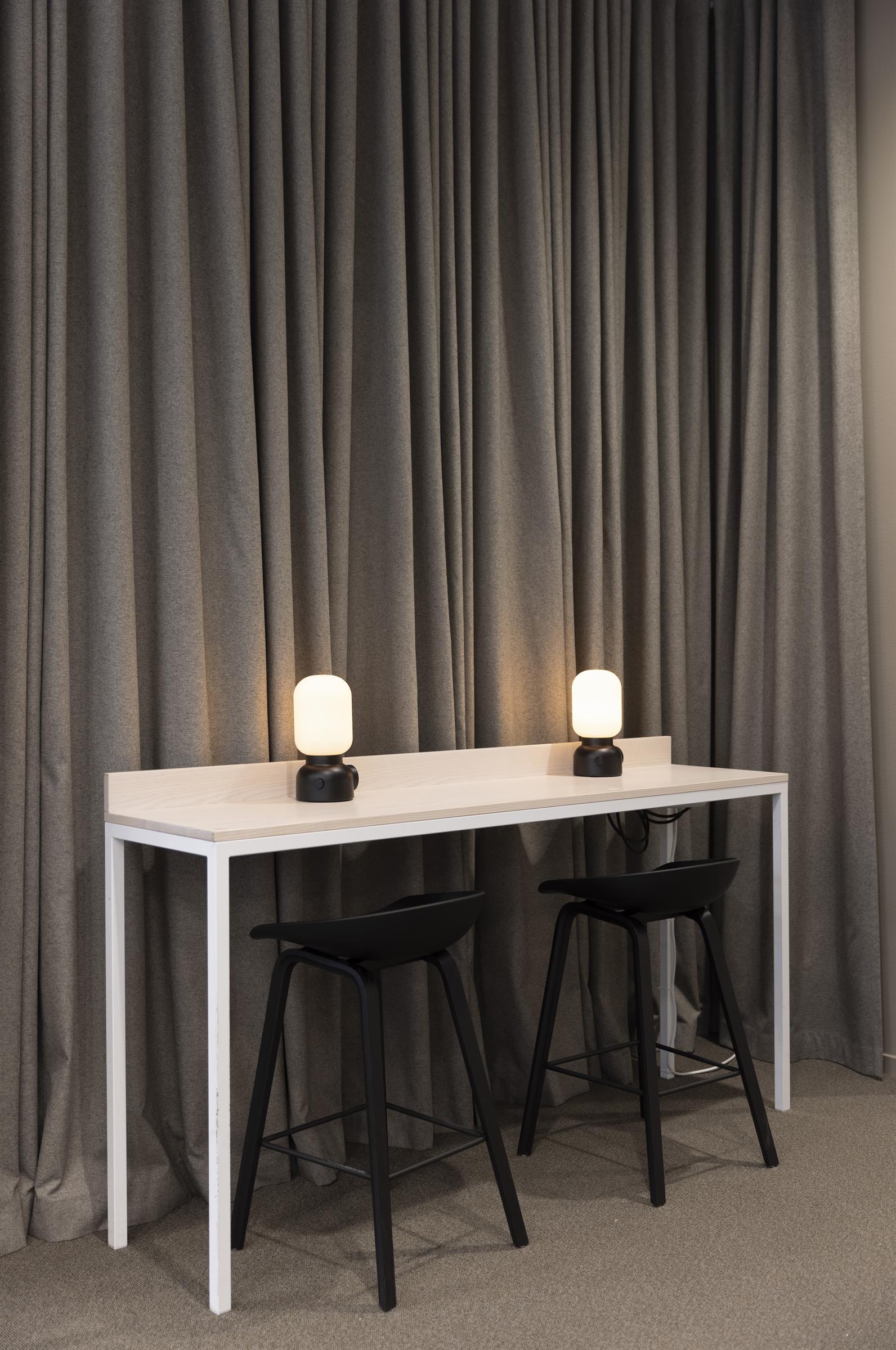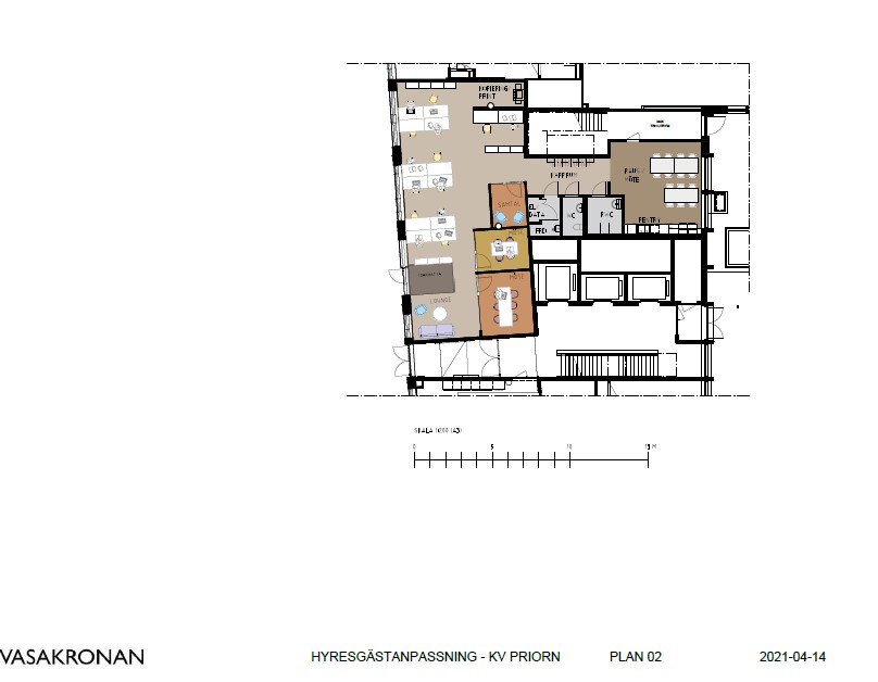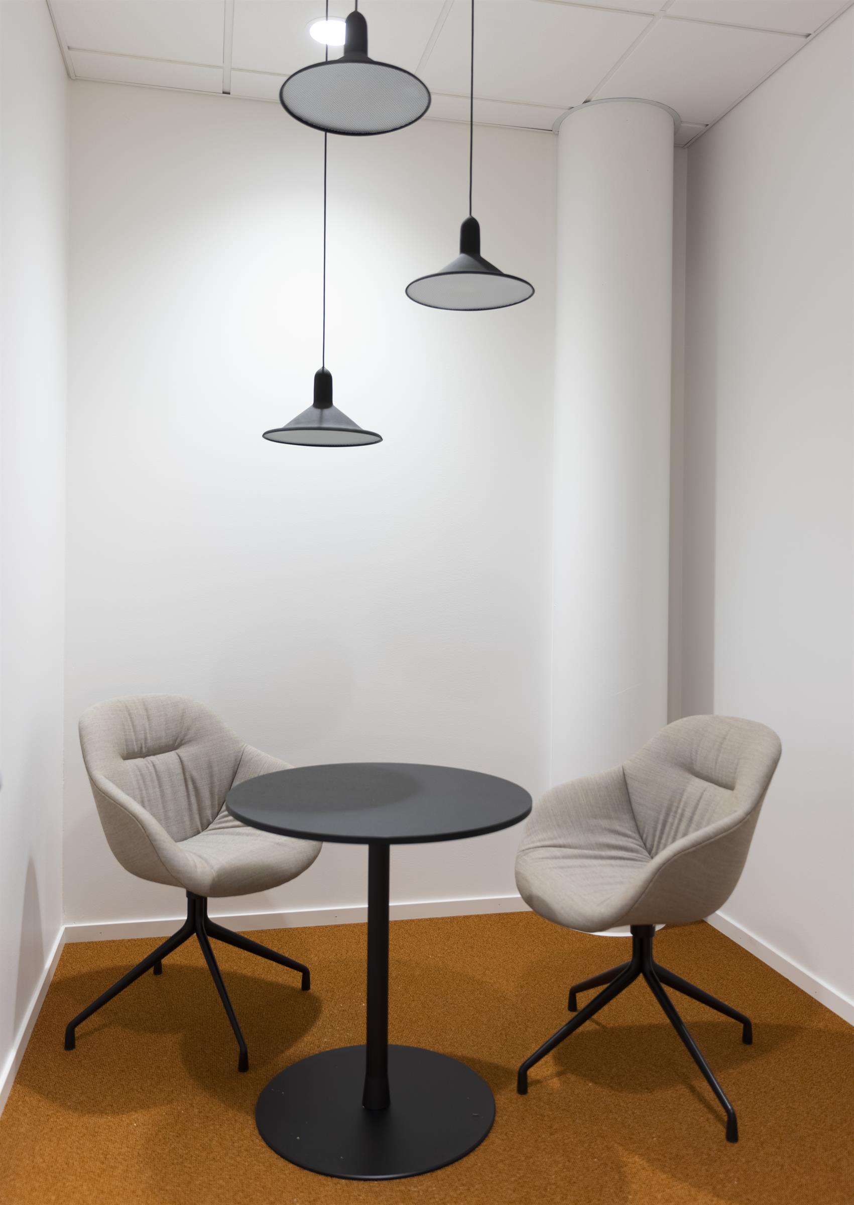 Pentry med matplats, ljusa ytskikt och stora fönster mot innergård Arbetsplatser i öppen yta med bra ljusinsläpp. Utsikt över Triangeln med S:t Johannes kyrka. Loungeyta för informella möten och pauser. Arbetsrum i kontorslandskapet med fint ljusinsläpp. Mötesrum med bord och skärm för effektiva möten. Arbetsplatser med lugn och avskild känsla Mindre arbets- eller fokushörna med varm belysning Samtalsrum med rund sittgrupp. Presentation med ritning