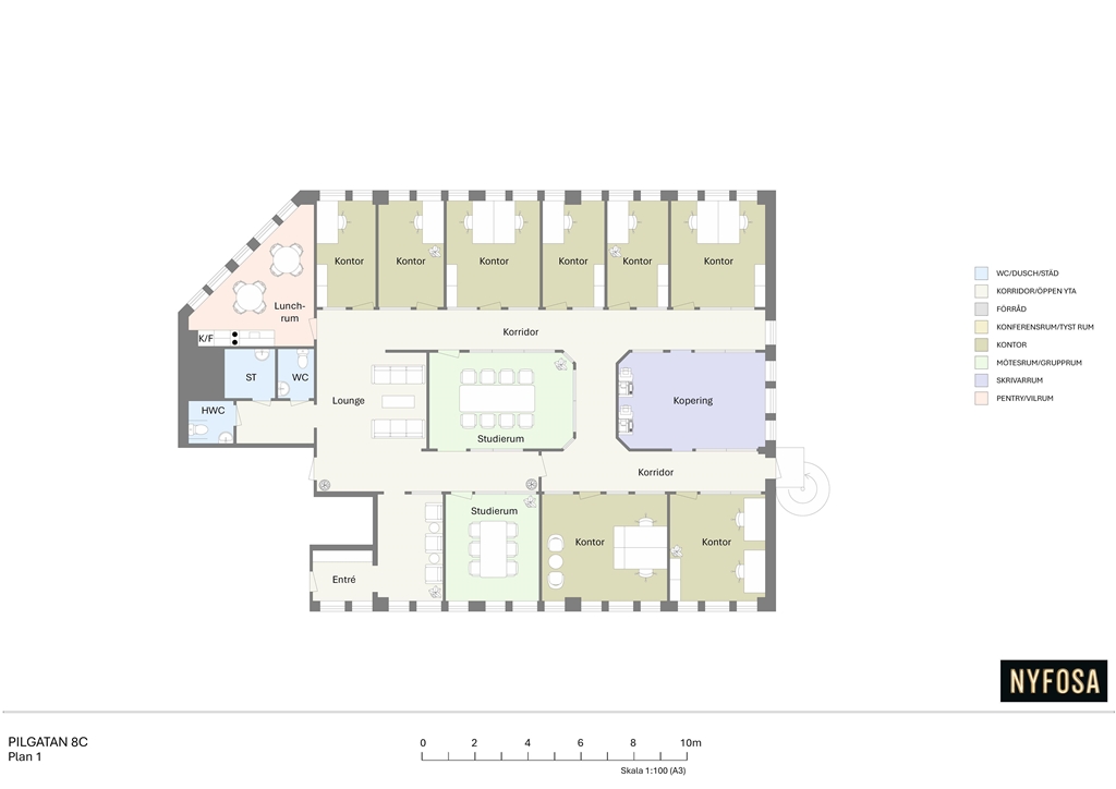 Planlösningen är flexibel och består i dagsläget av flera rum i olika storlekar, vilket gör den lätt att anpassa efter behov. Det finns goda möjligheter att skapa en kombination av öppna arbetsytor, mötesrum och sociala ytor eller att utforma ett helt öppet kontorslandskap. Lokalen kan anpassas i nära dialog med hyresvärden för att optimalt stödja verksamhetens arbetssätt.
