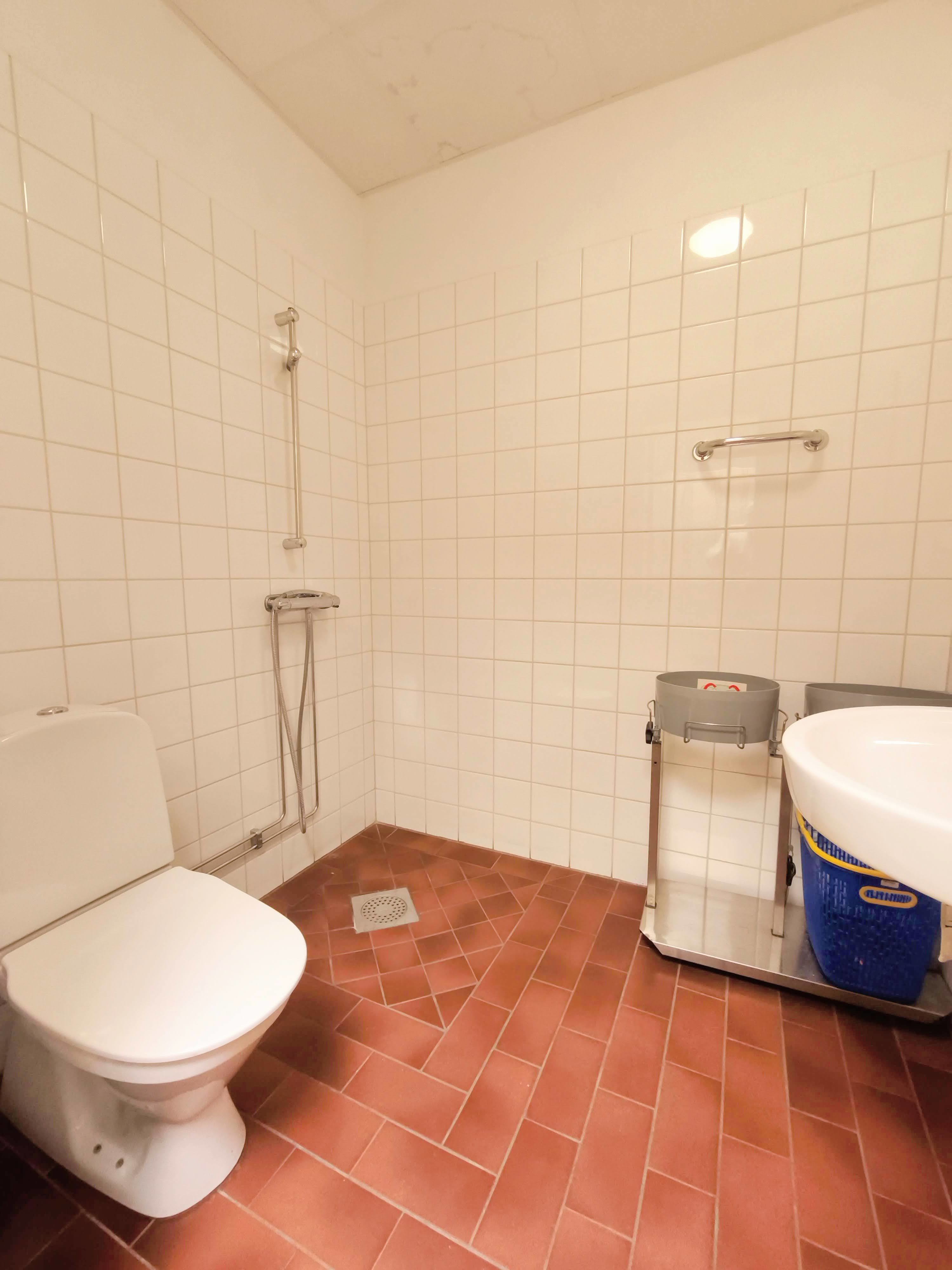 Entré sker via delat trapphus med hiss till övre plan.