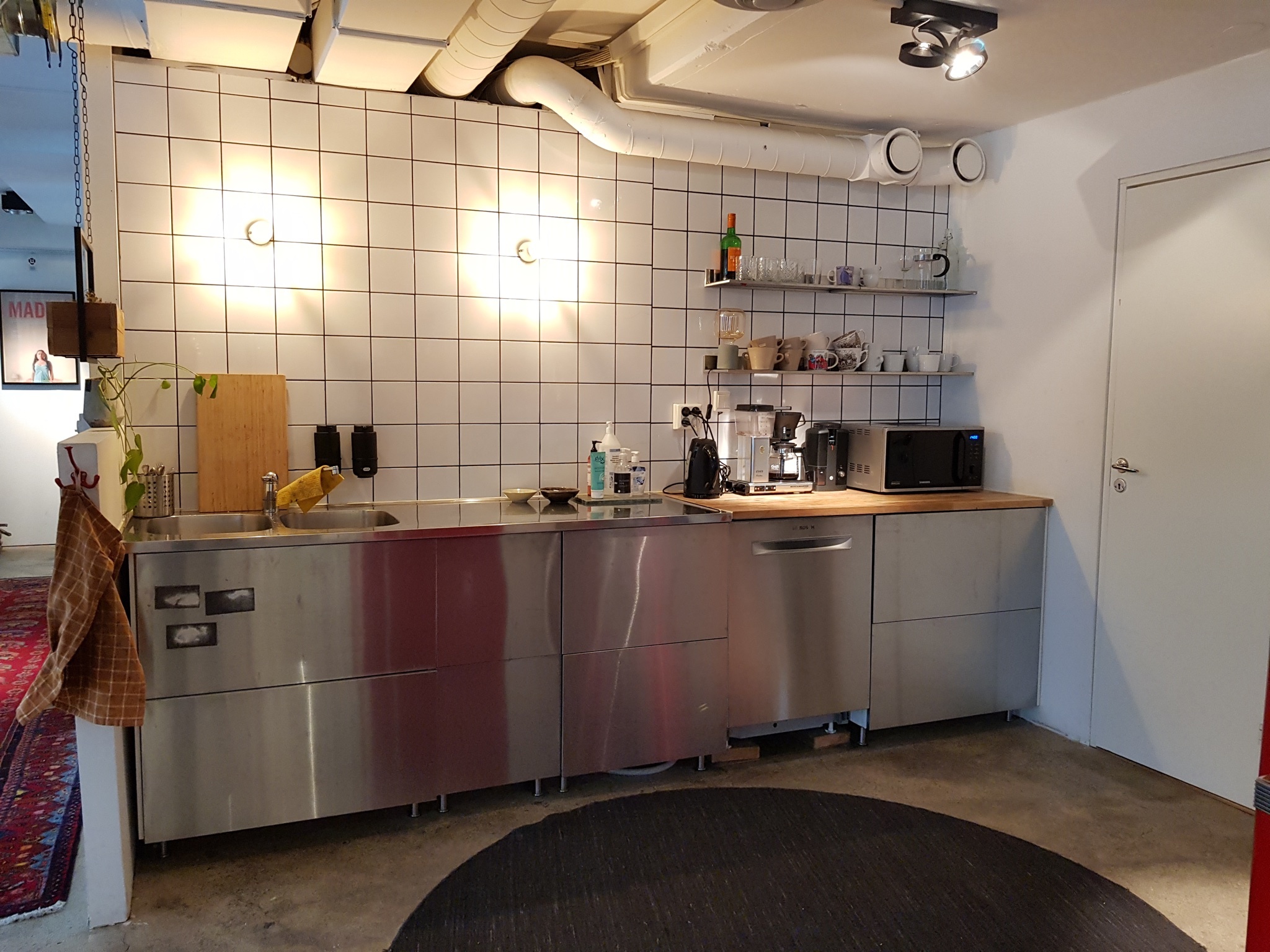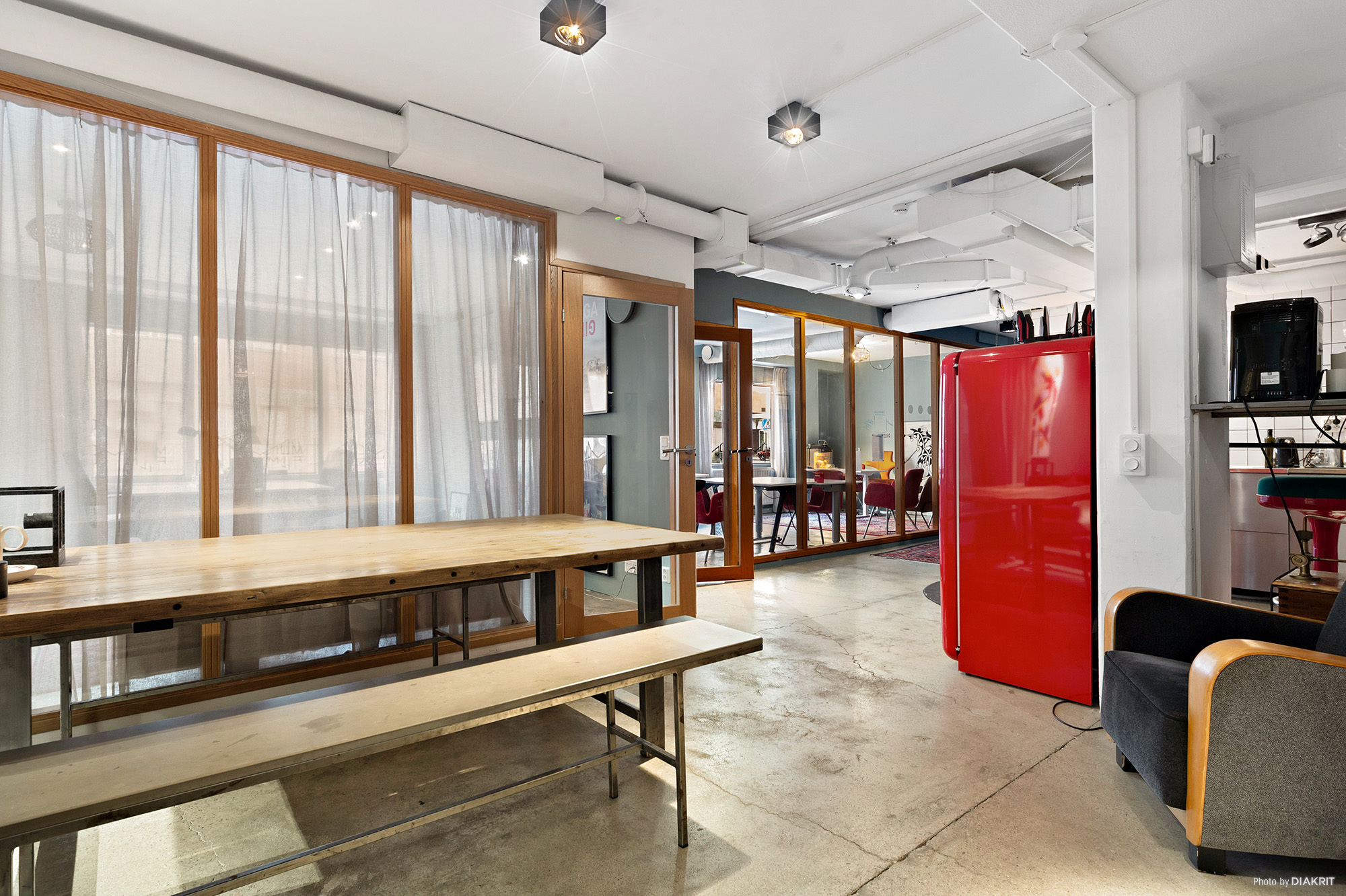 Lokalen har ett välutrustat kök och en planlösning som fungerar för både kontor, showroom och kreativa verksamheter. Här finns två WC, ett mindre förråd eller telefonrum samt ett större förråd. Till lokalen hör även ett rejält förråd i garageplan. De många fönstren ger generöst ljusinsläpp och gör det enkelt att anpassa planlösningen med fler rum eller öppnare ytor.