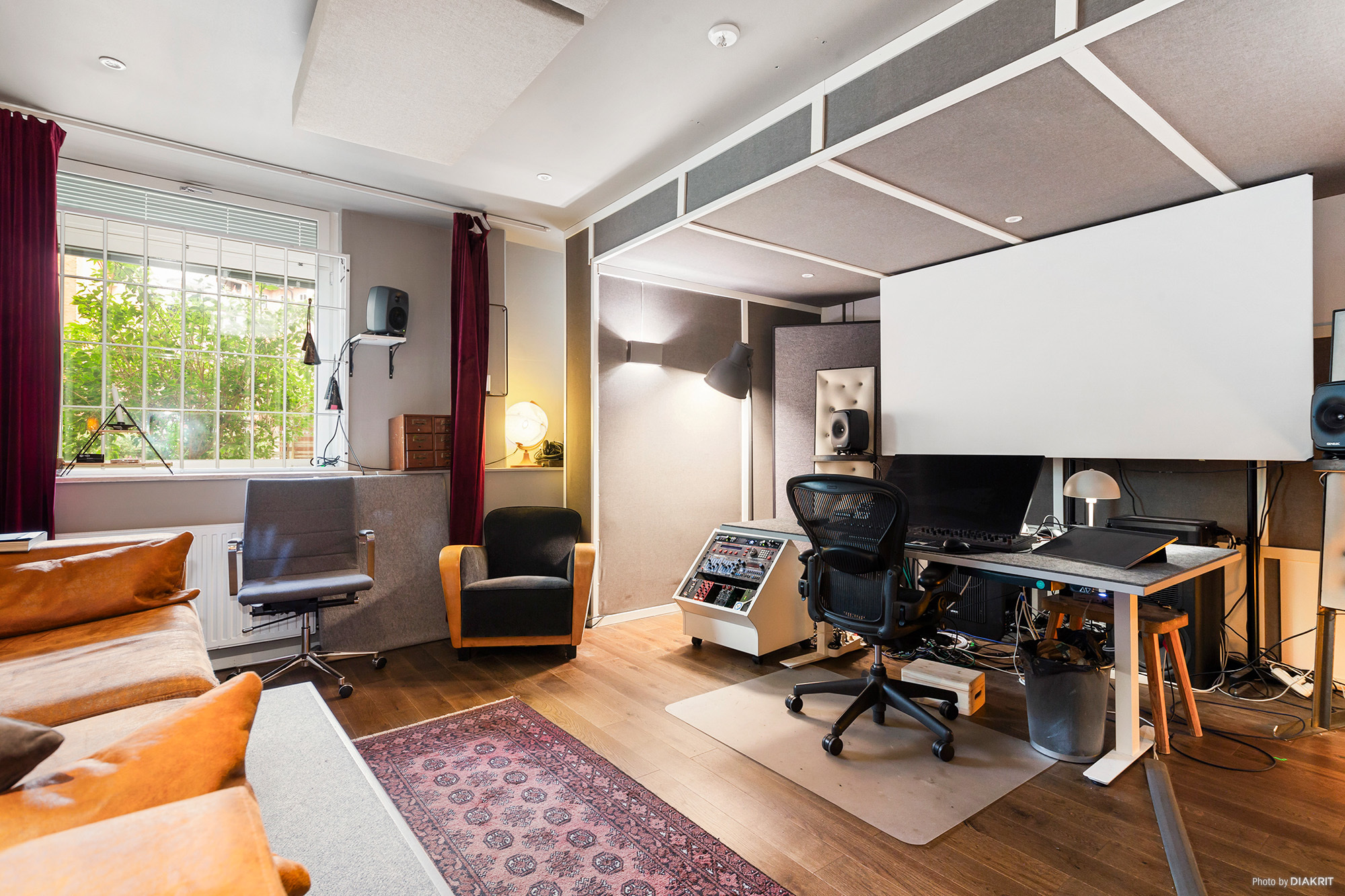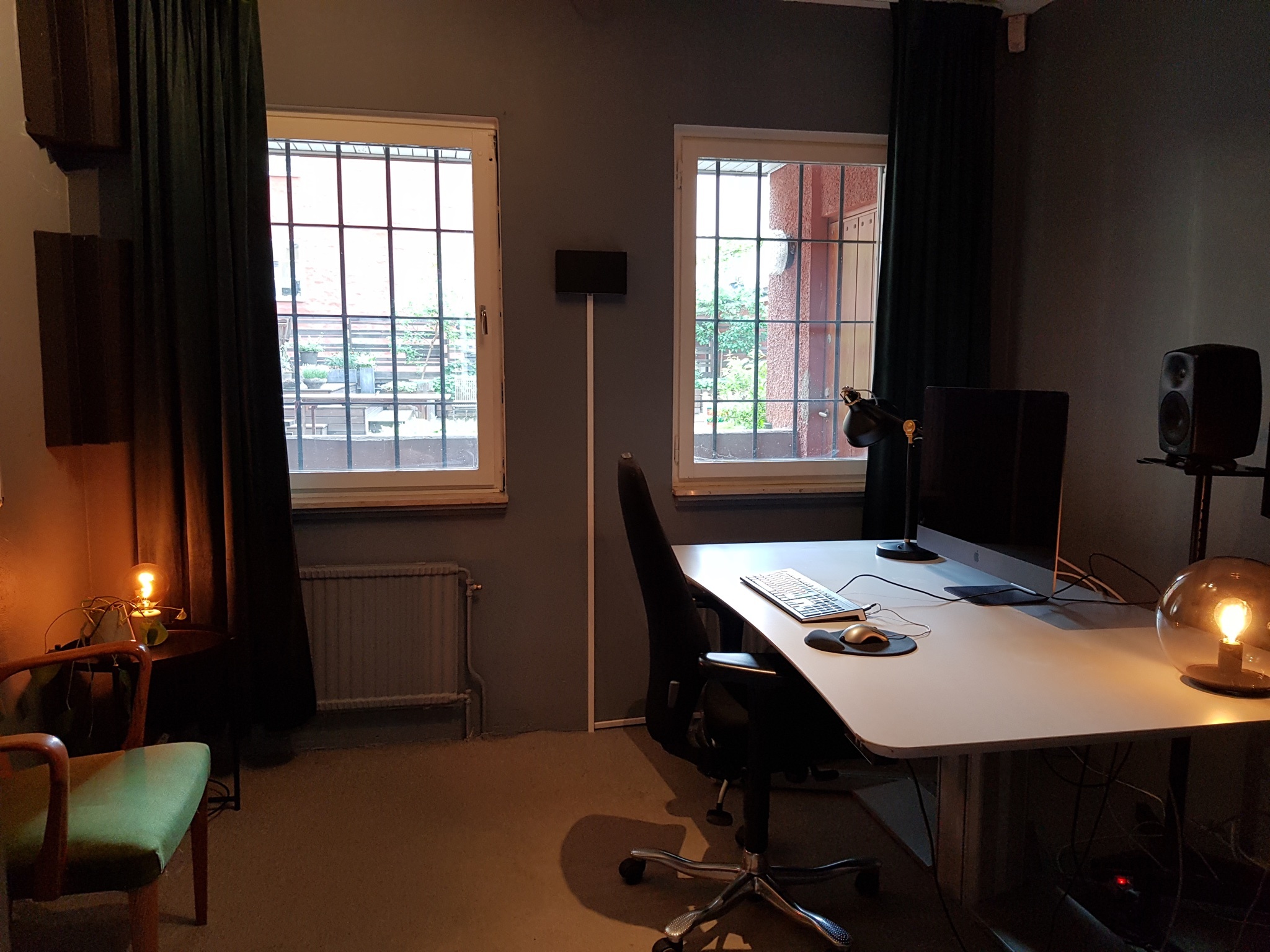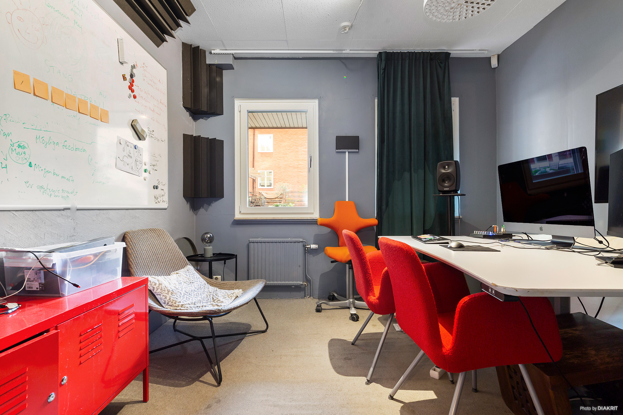 Ett av rummen i lokalen är en ljuddämpad studio med anpassade golv, väggar och tak, fönster och dörrar. Den är idealisk för musikproduktion, poddinspelning, film eller foto och rymmer flera personer. Studion har dessutom fönster för dagsljus och utgång till en trevlig innergård för sköna pauser. Intill ligger ett ordentligt dämpat, men inte helt isolerat, filmklippningsrum som vid behov kan göras om till ytterligare en ljudstudio. Ett annat rum, som idag används som mötesrum, kan konverteras och ljudisoleras för ytterligare studioverksamhet.