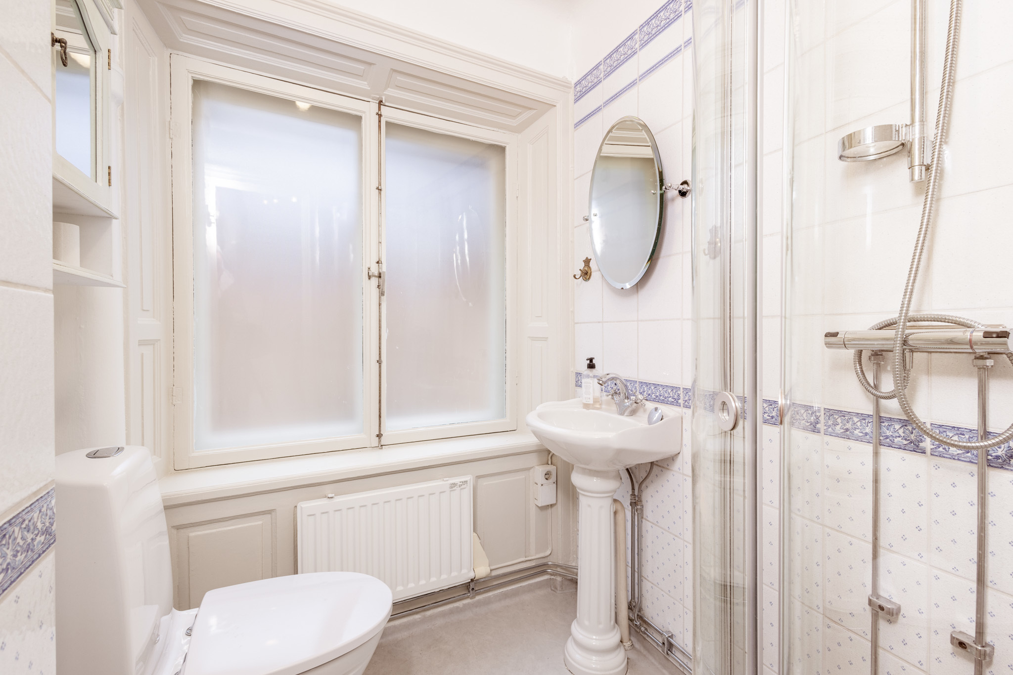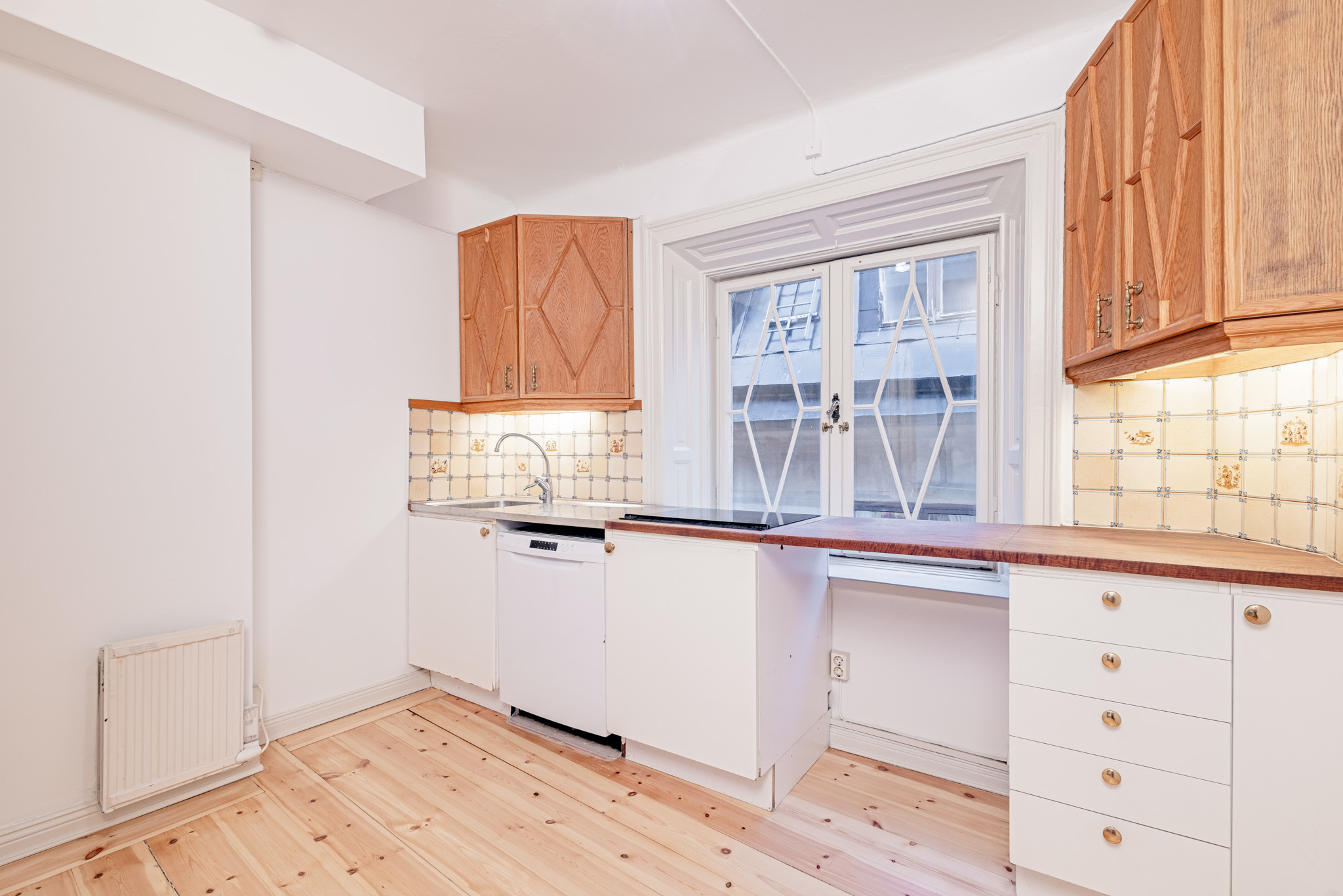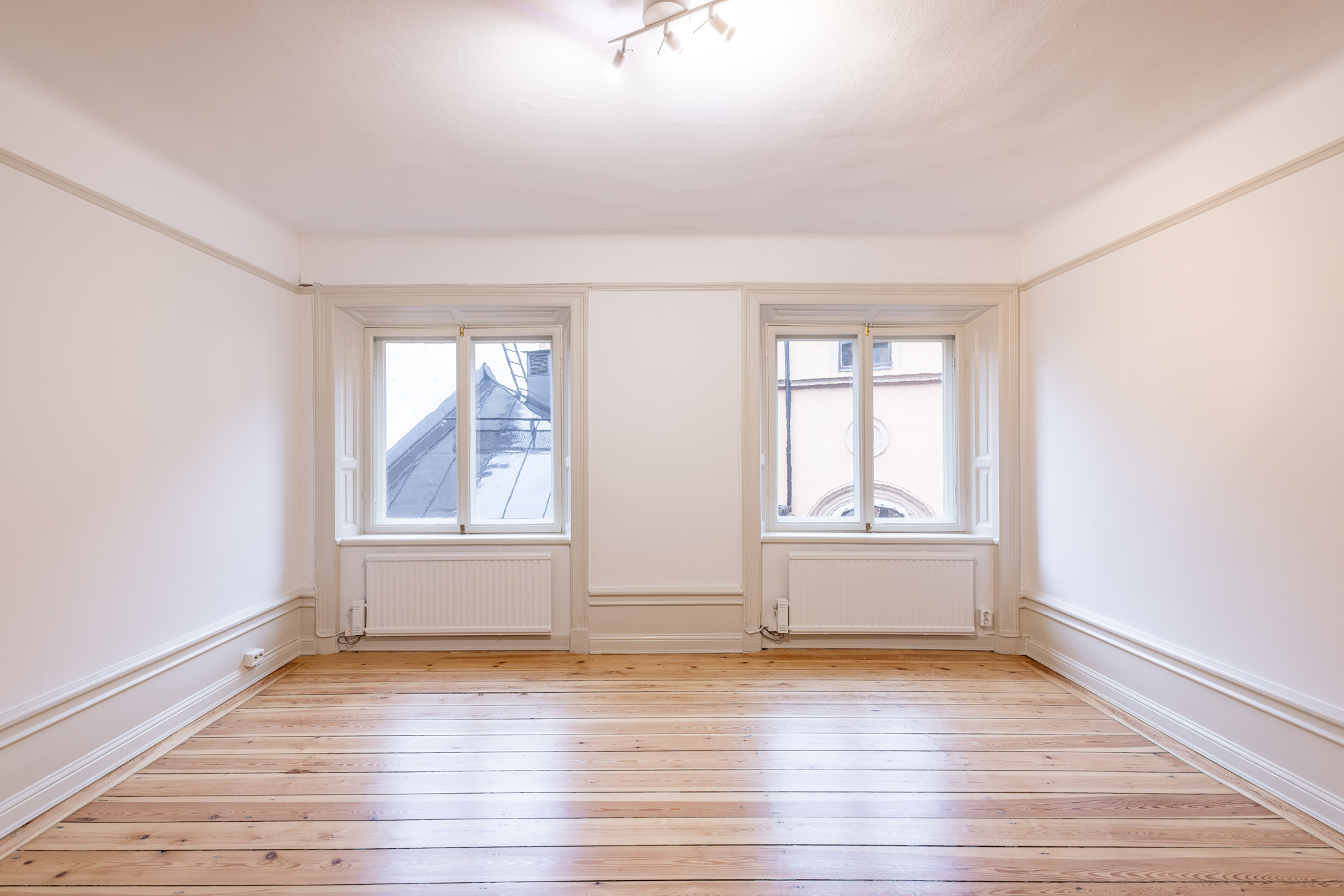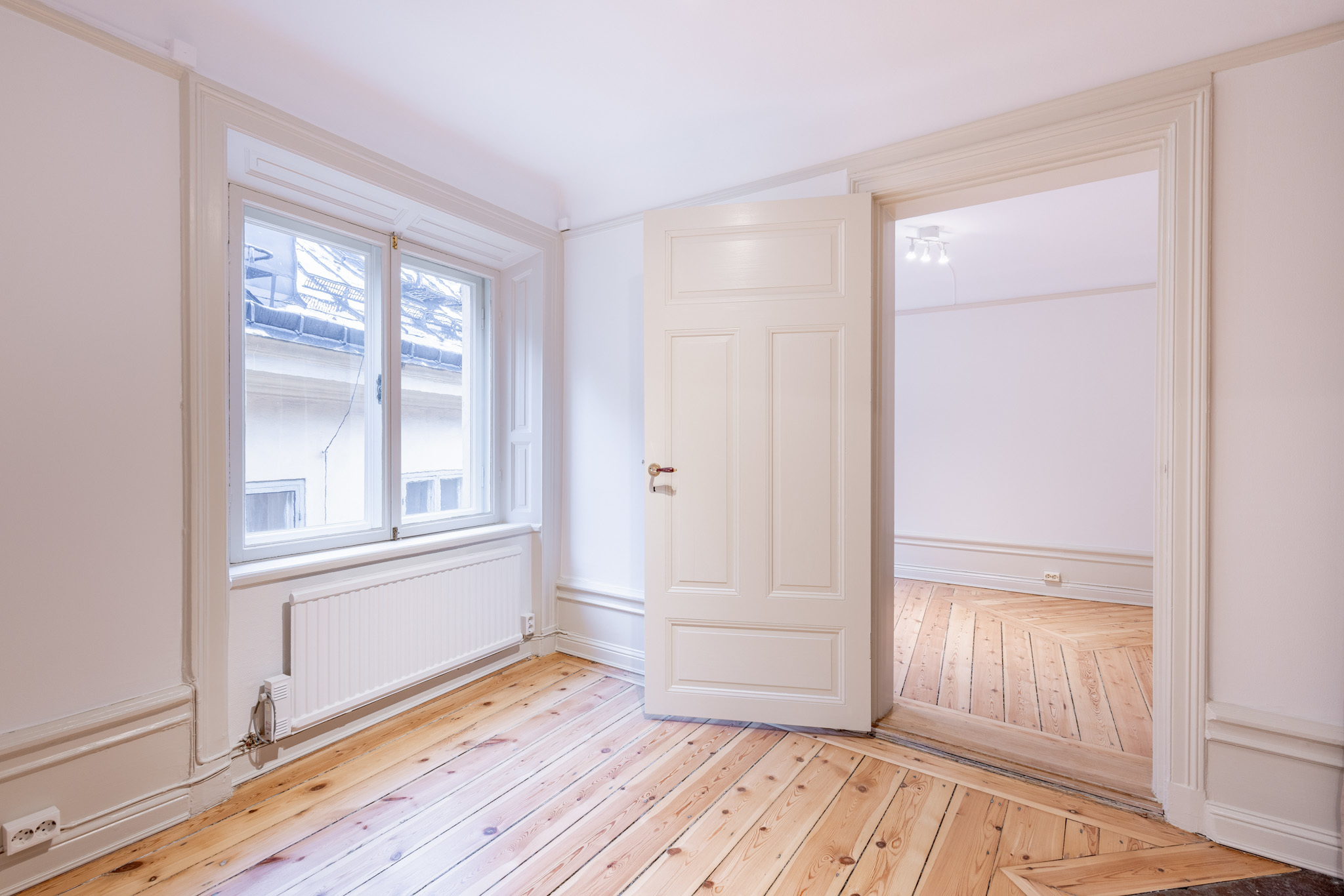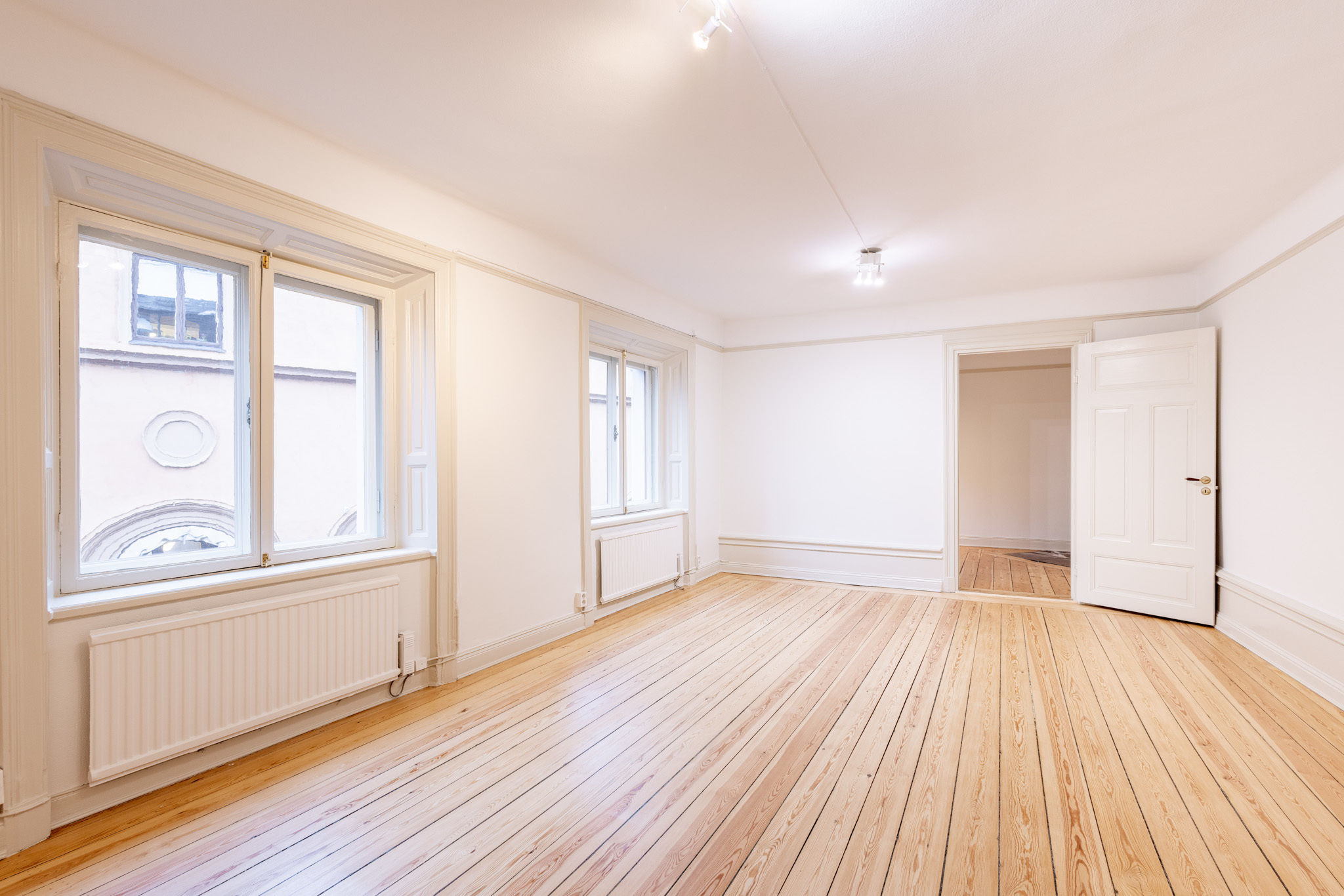 Lokalen är i ett gott renoverat skick med fina ytskikt och väl underhållna och tidstypiska trägolv!