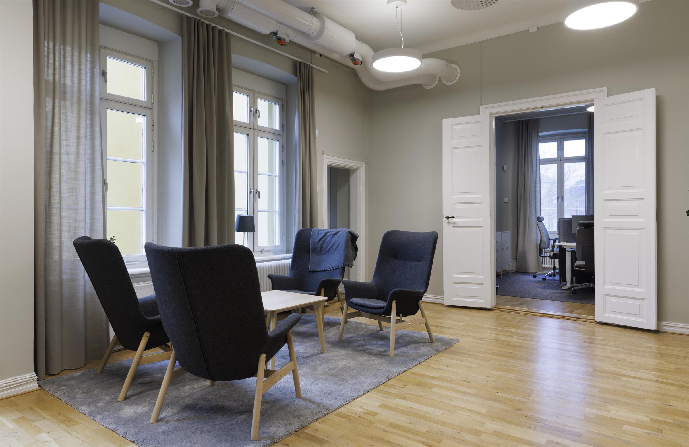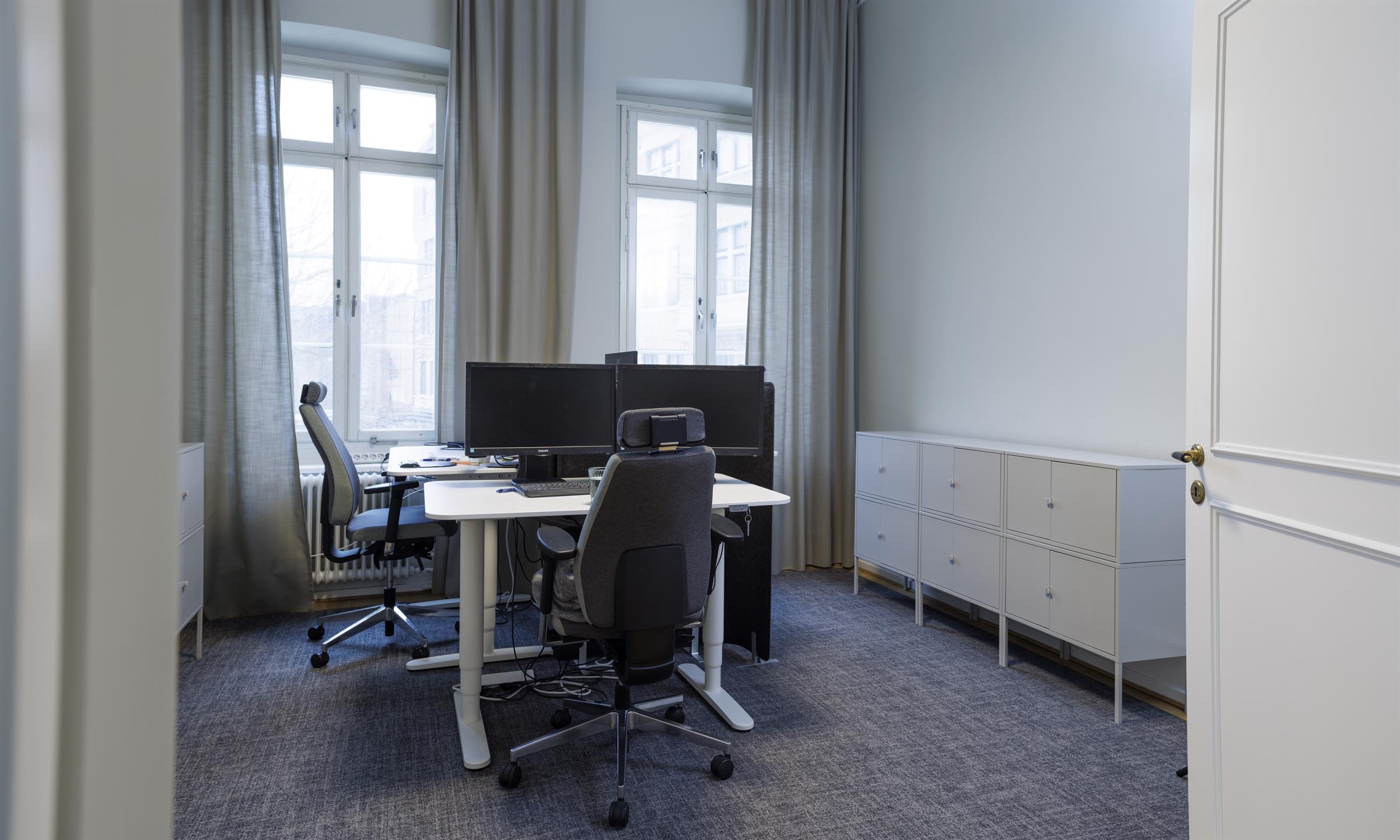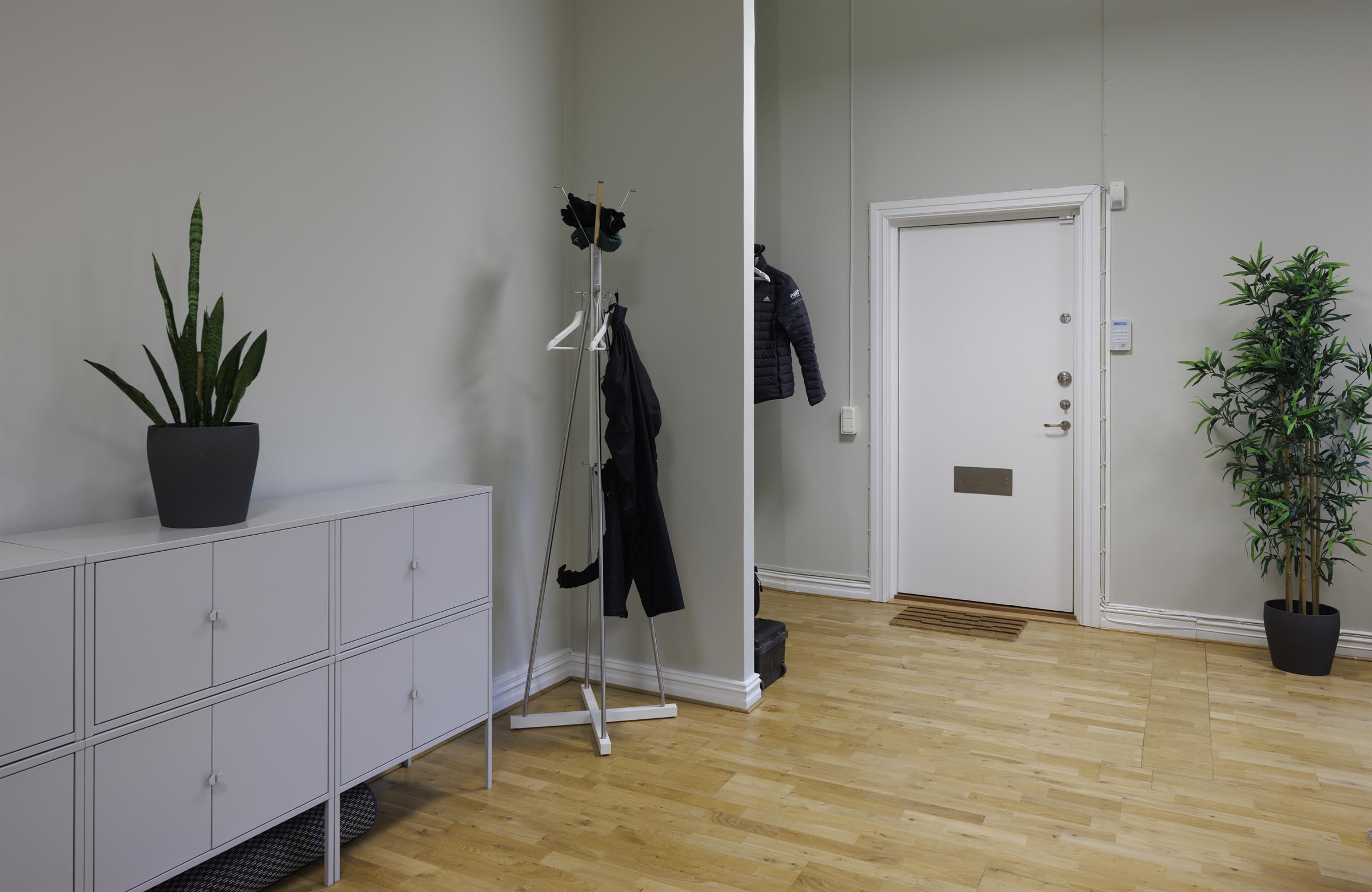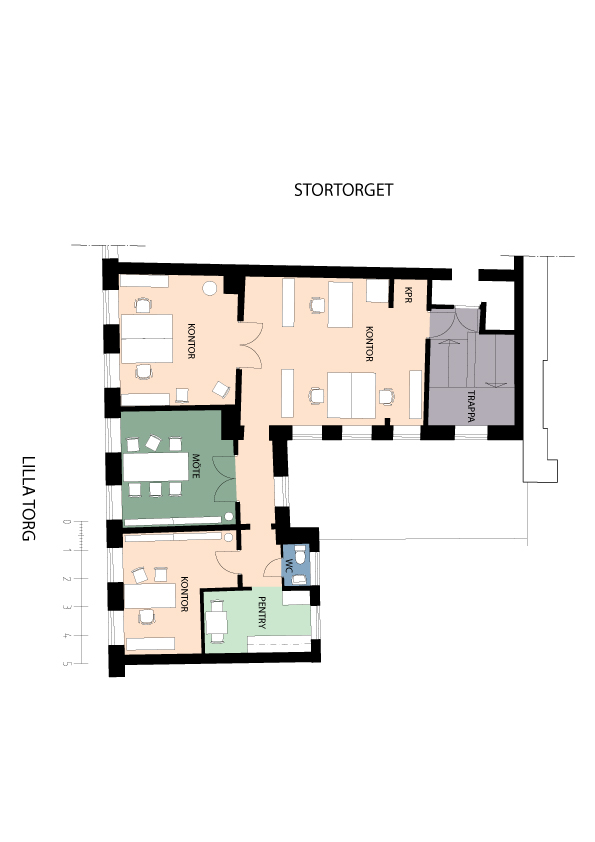 Ljus loungeyta intill kontorsrum med dubbeldörrar. Mötesrum med utsikt över torget. Social sittgrupp med utsikt mot Lilla Torg. På andra våningen finns denna pärla på Stortorget 19.. Luftiga ytor med högt i tak och parkettgolv. Entré och förvaring med bevarad sekelskiftskänsla. Pentry med arbetsyta och fönster mot innergård. Ljust pentry med stort fönster och träd utanför. Kontorsrum med plats för flera arbetsplatser. Presentation med ritning