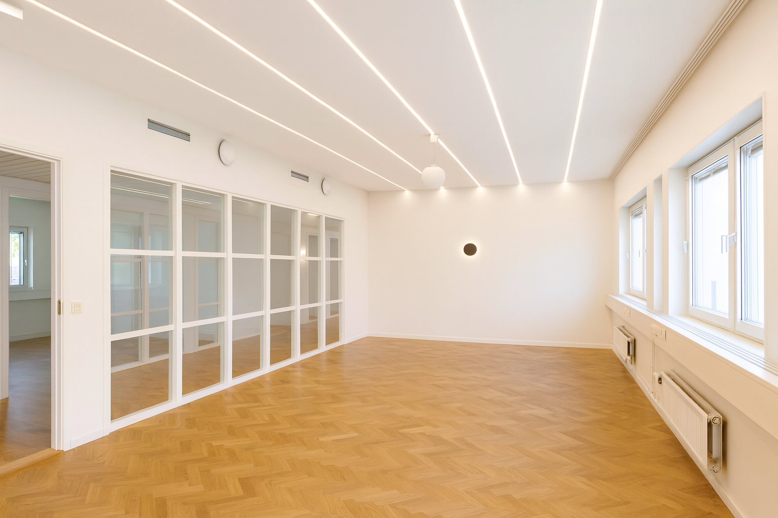 Planlösningen skapar en balans mellan koncentrerat arbete och social samvaro, med stora fönster som ger rikligt ljusinsläpp över hela ytan.