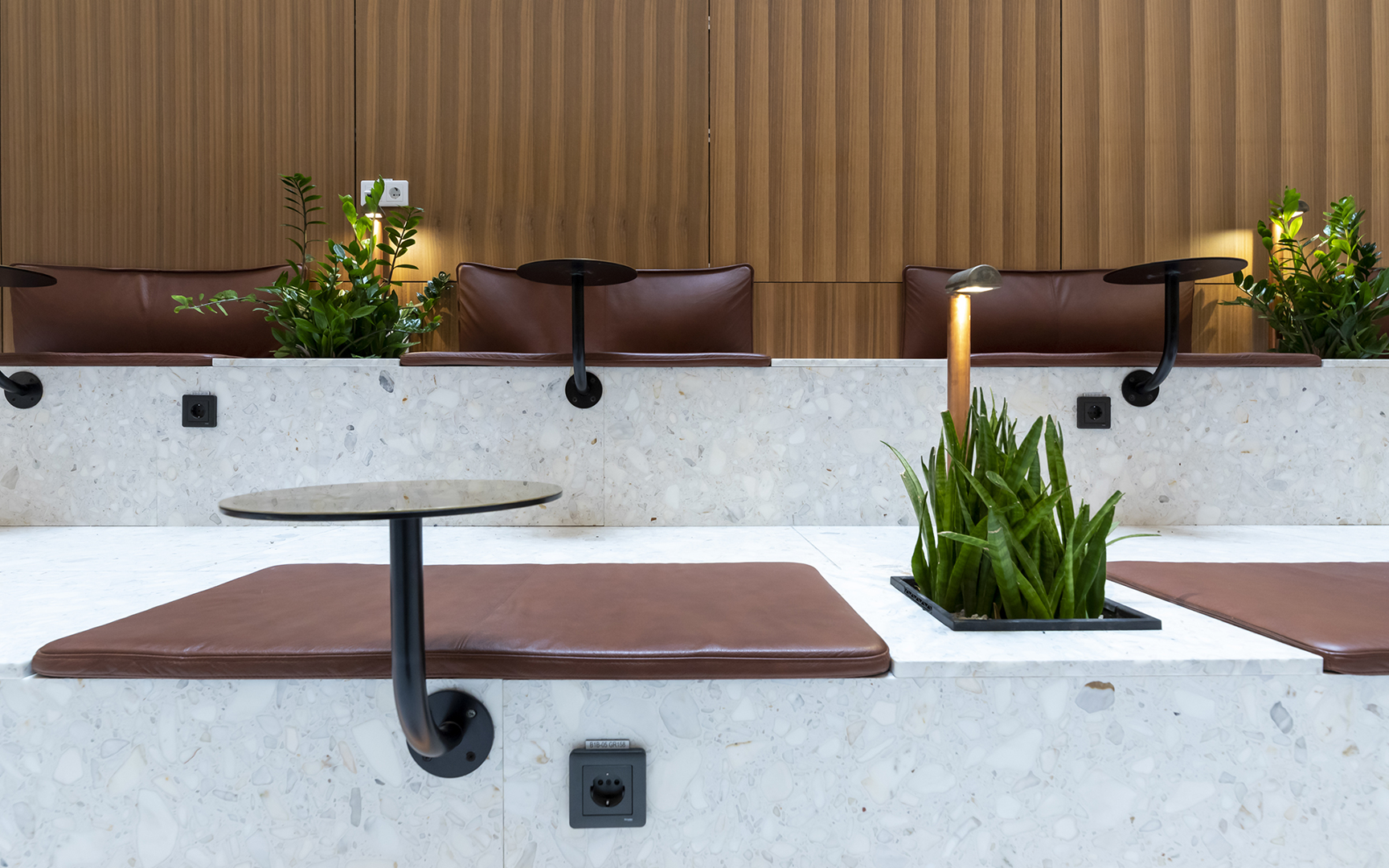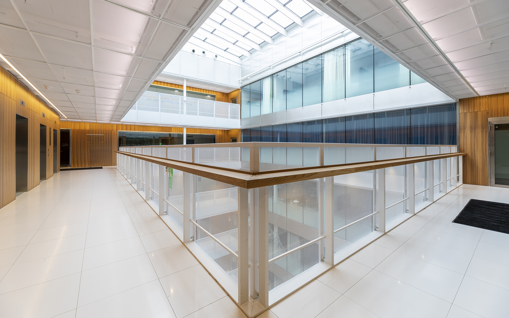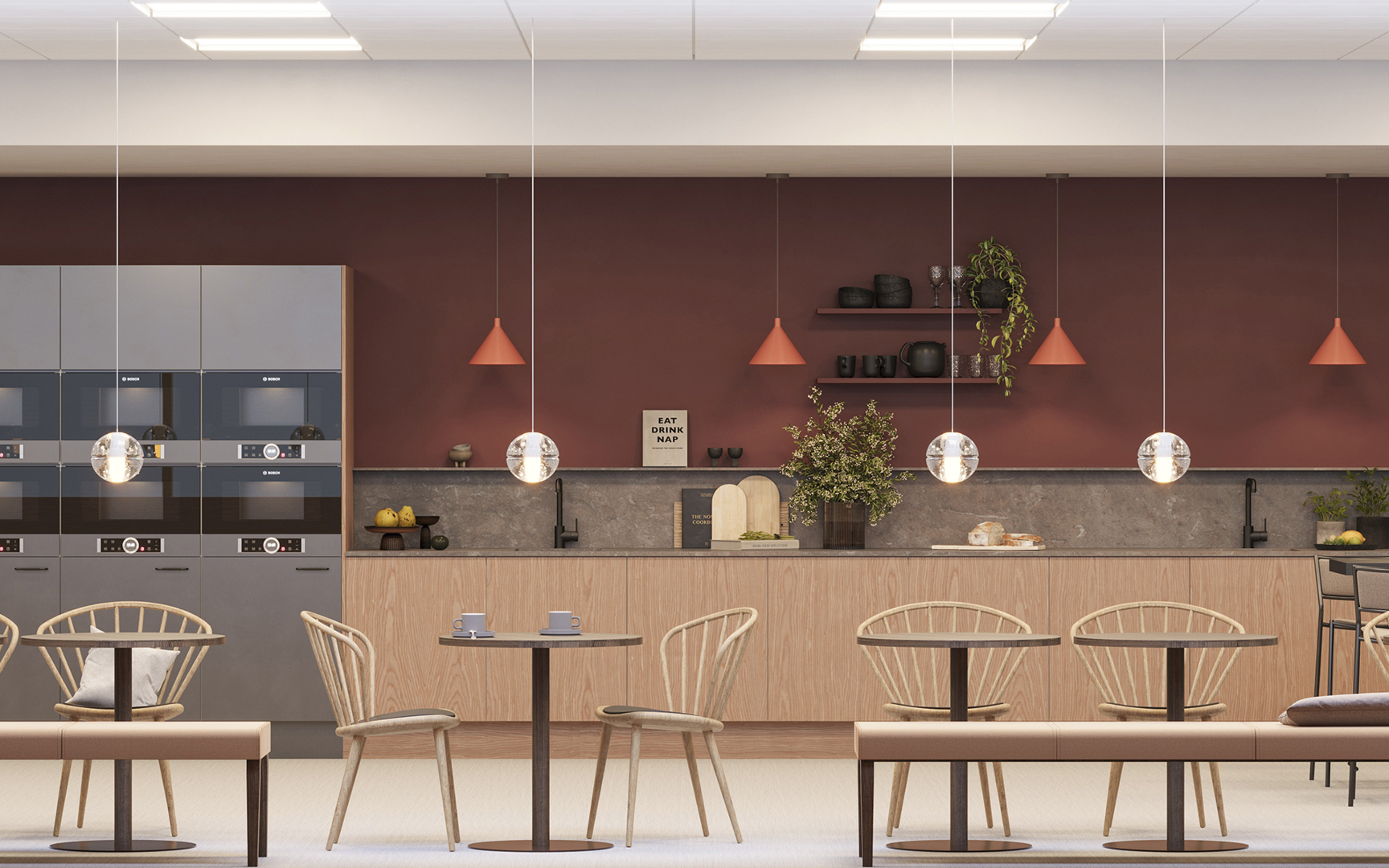 Stor välkomnande receptionsdel med lounge och ett väl tilltaget lunchrum i hjärtat av lokalen.
